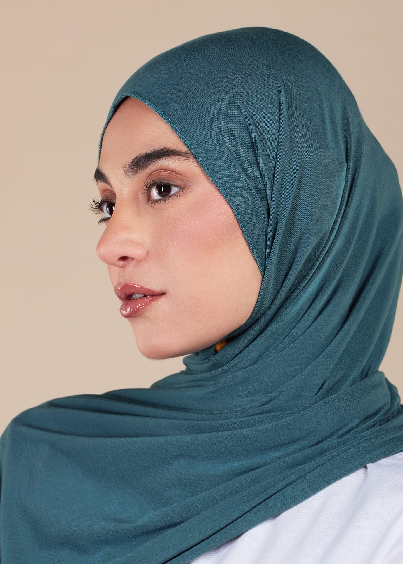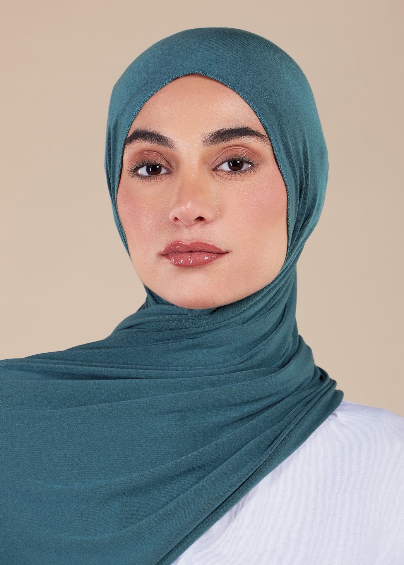Effortless to style and incredibly comfortable to wear, with a subtle sheen. The medium-thick weight is soft, breathable, fully opaque and durable. Jersey works well in all climates, can be worn without an under scarf or pins, and makes a great option for working out.