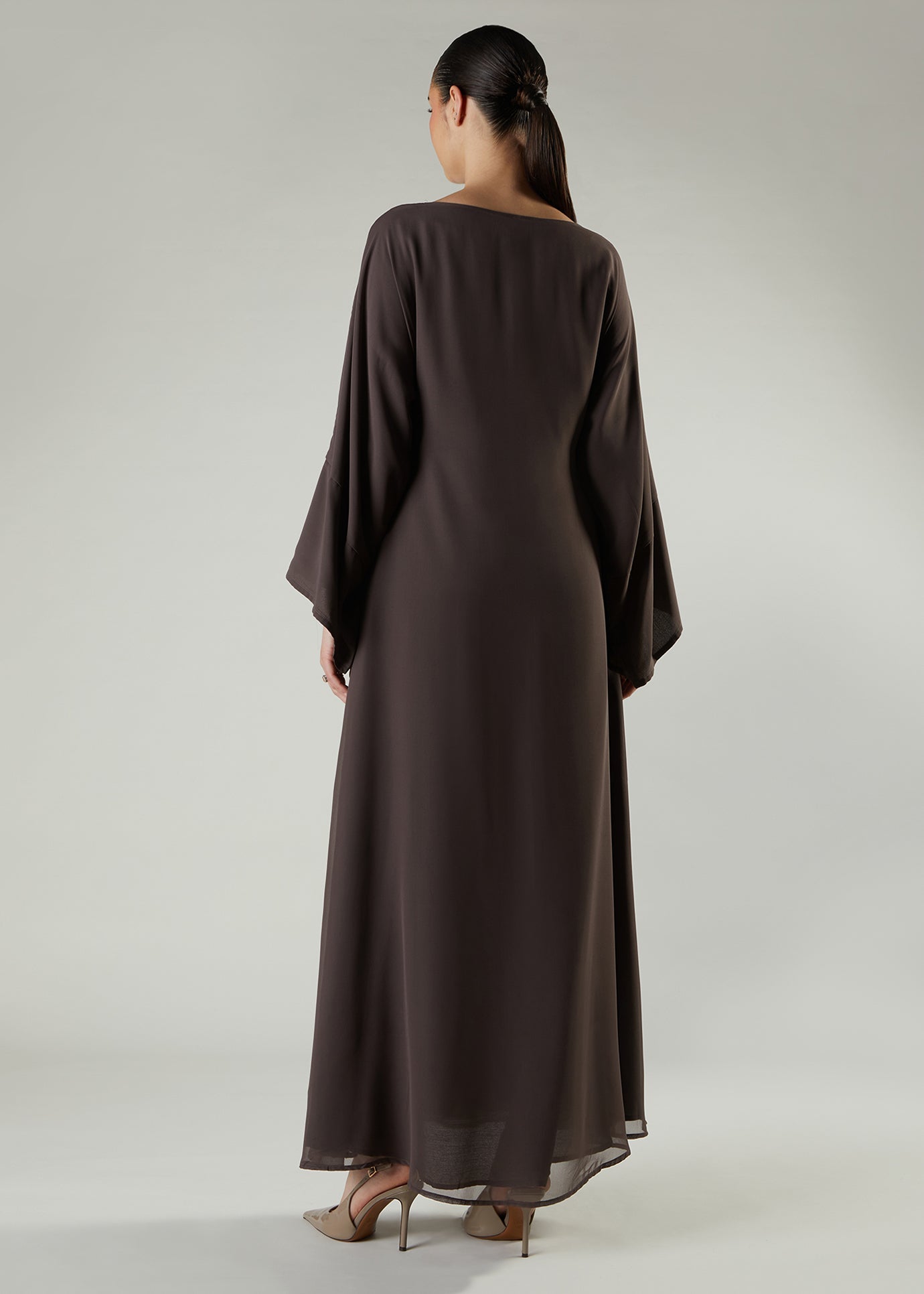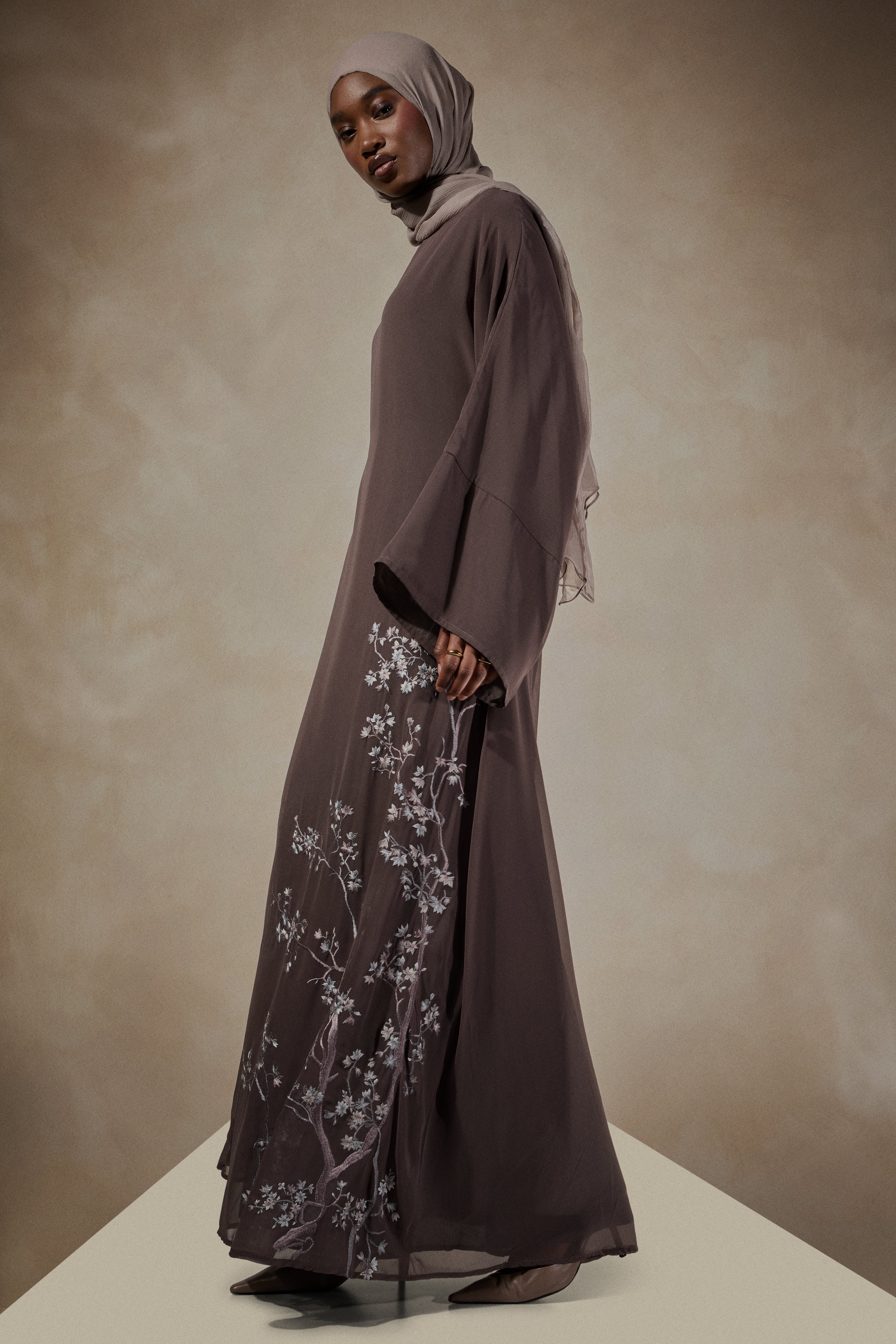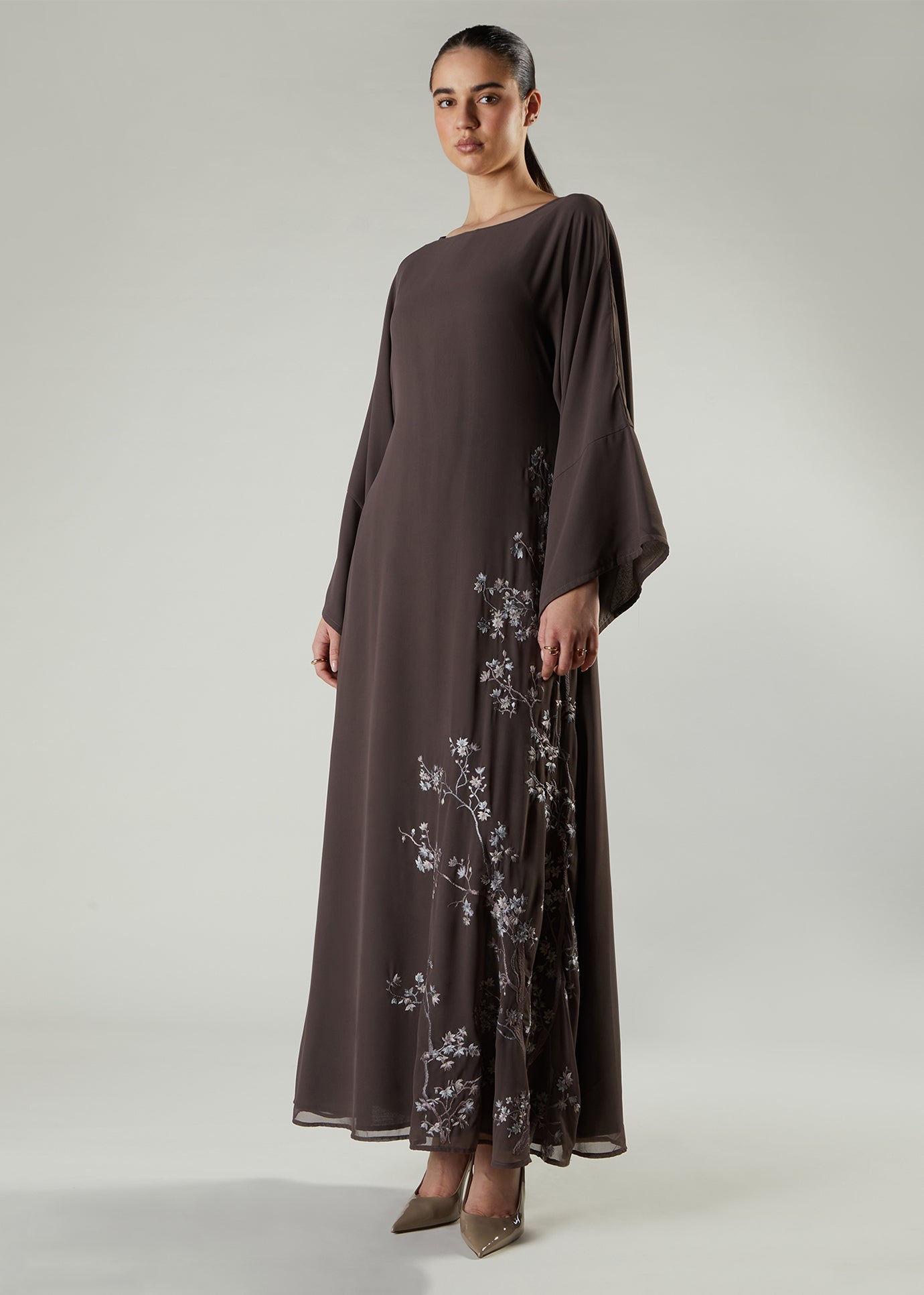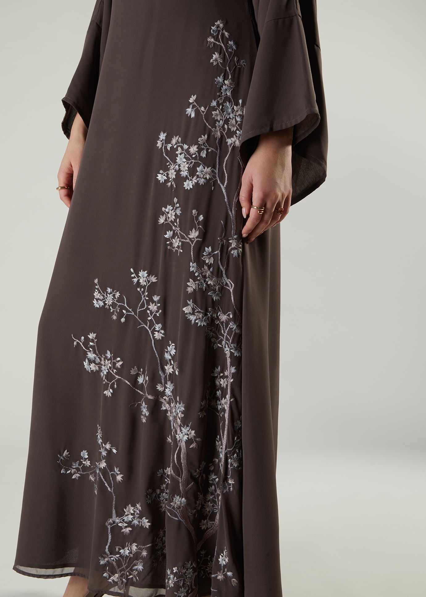 Beautifully embroidered Maxi featuring delicate almond bloom motifs inspired by the beauty of spring blossom. The garment is made using a fluid crepe that's fully lined using 100% cotton lining for comfort. Maxi has a modest silhouette and has loose fit sleeves in a moody taupe tone with silver grey tones of floral motifs.