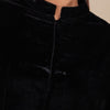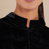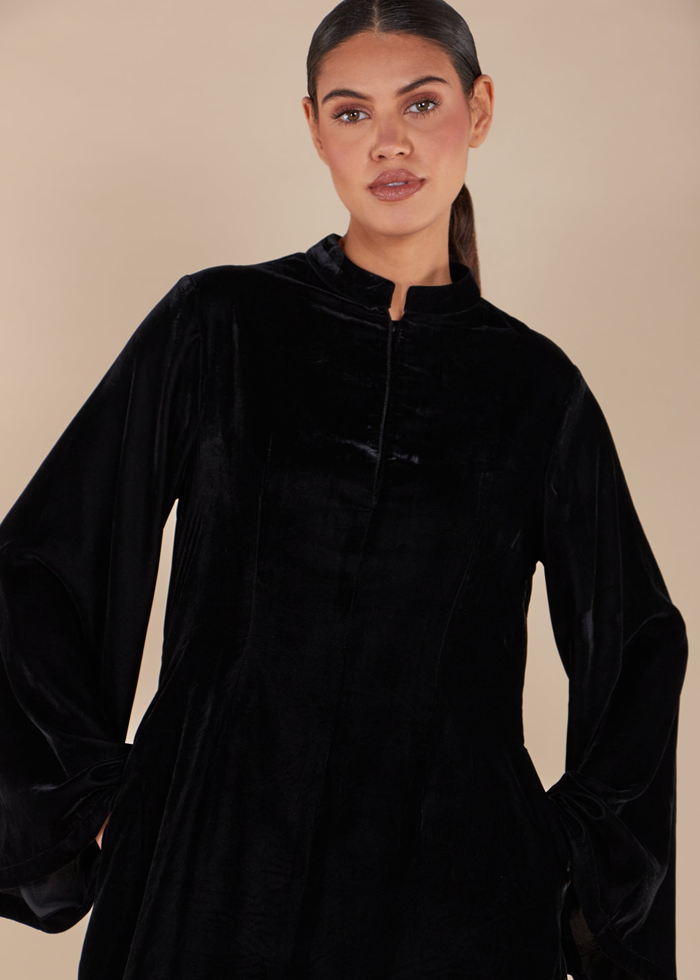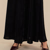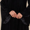 This full-length abaya is crafted in luxurious black velvet, exuding timeless elegance and sophistication. The abaya’s structured silhouette is softened with wide, flowing sleeves and a delicate, high collar, making it both modest and refined. Its minimalist design highlights the richness of the fabric and the flowing drape, making it perfect for any formal occasion.