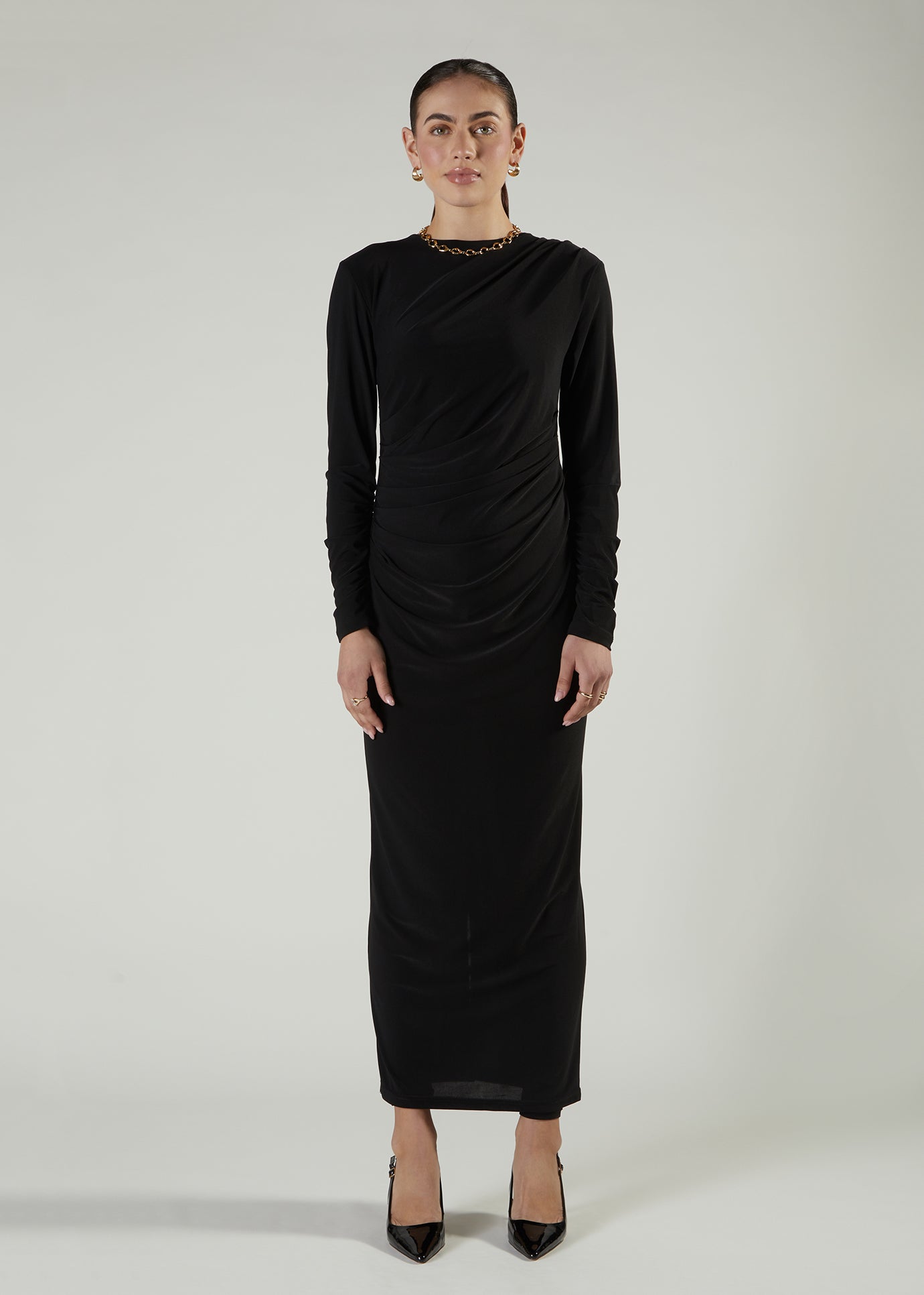 Maxi is made from a fluid stretchy fabric featuring ruched sleeves as well as on the front of the maxi.