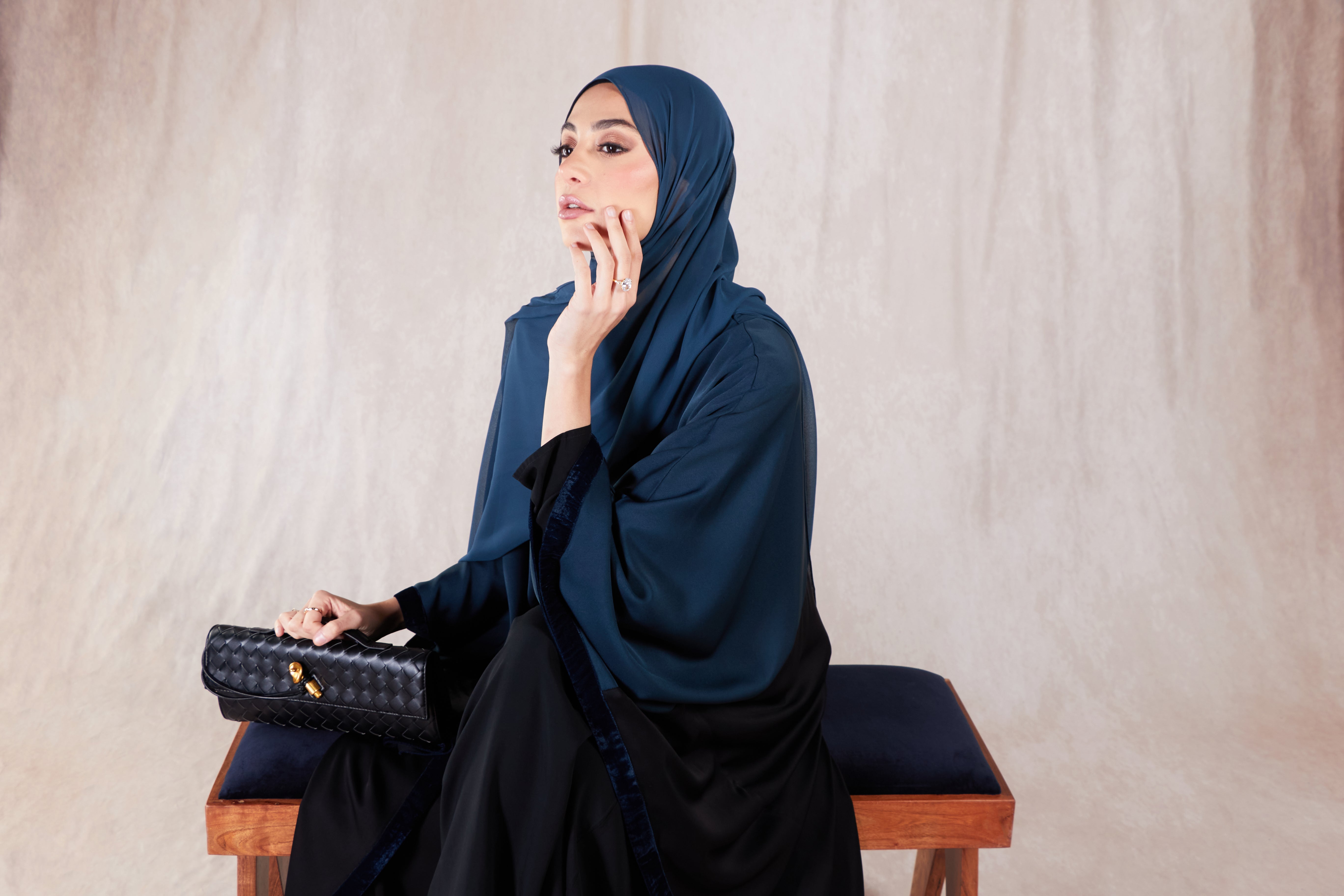 This full-length abaya is designed with a contrasting colour-block effect, combining a deep teal upper bodice with a flowing black lower half. The draped silhouette creates a timeless, elegant look, while the front-open style adds a touch of contemporary sophistication. The abaya is accented with a blue velvet trim along the edges, enhancing its regal appeal and luxurious texture.