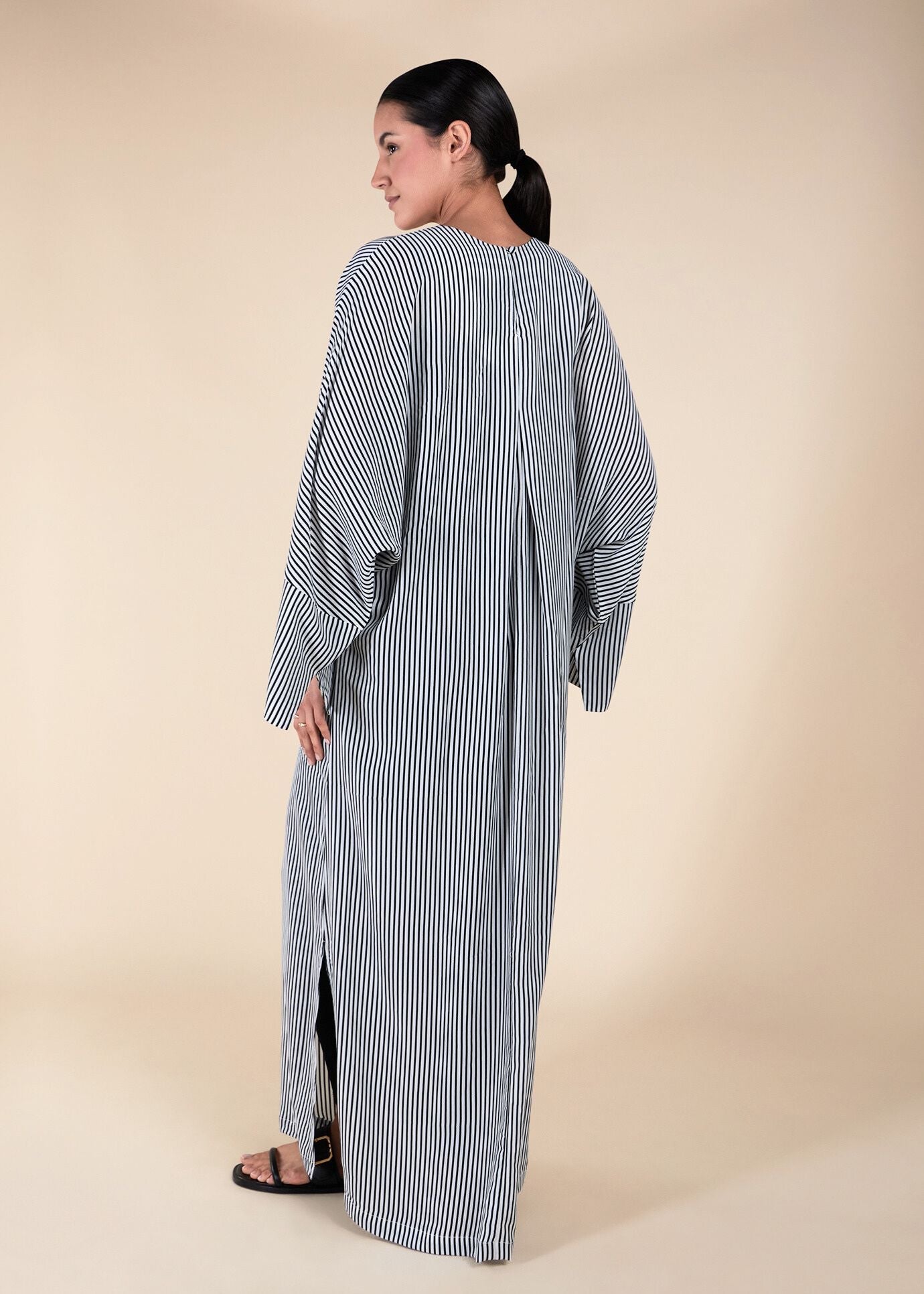 This kaftan offers a comfortable, loose fit and stylish black and white stripes, making it a must-have for your summer wardrobe. Its v neckline adds a touch of elegance. A single pleat at the back and exaggerated cuffs add unique detail to this ideal summer piece, perfect for home or abroad.