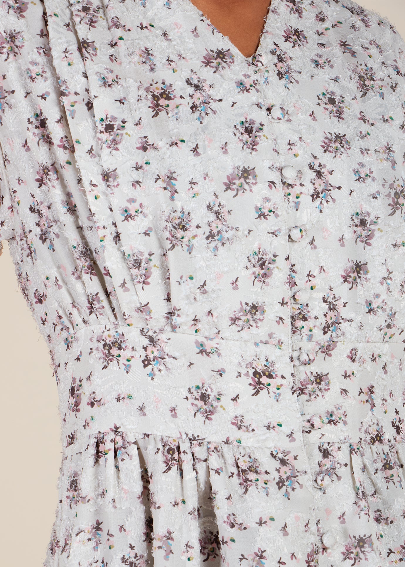 A sophisticated textured floral maxi dress featuring a structured silhouette that complements your figure. The strategically placed self-fabric buttons along the front and waistband enhances your natural contours. Complete with full lining and offered in various sizes and lengths to ensure an impeccable fit for every wearer.