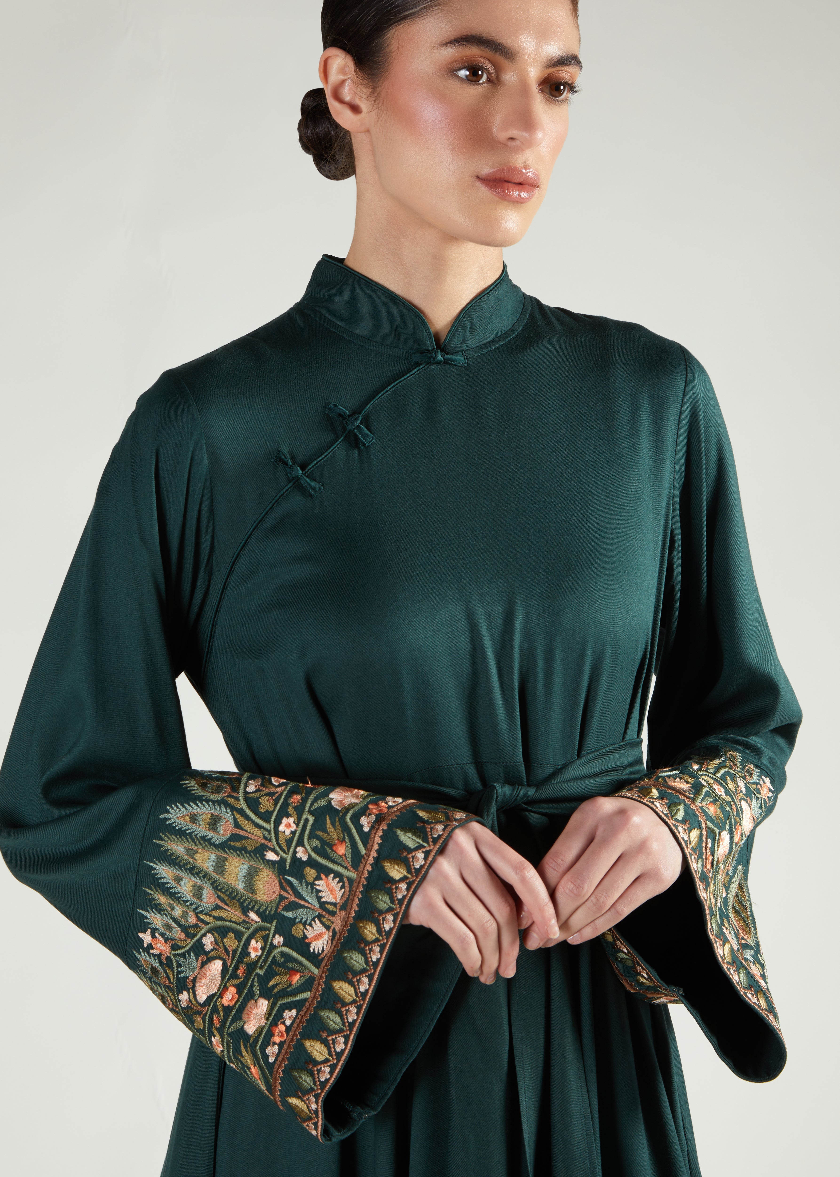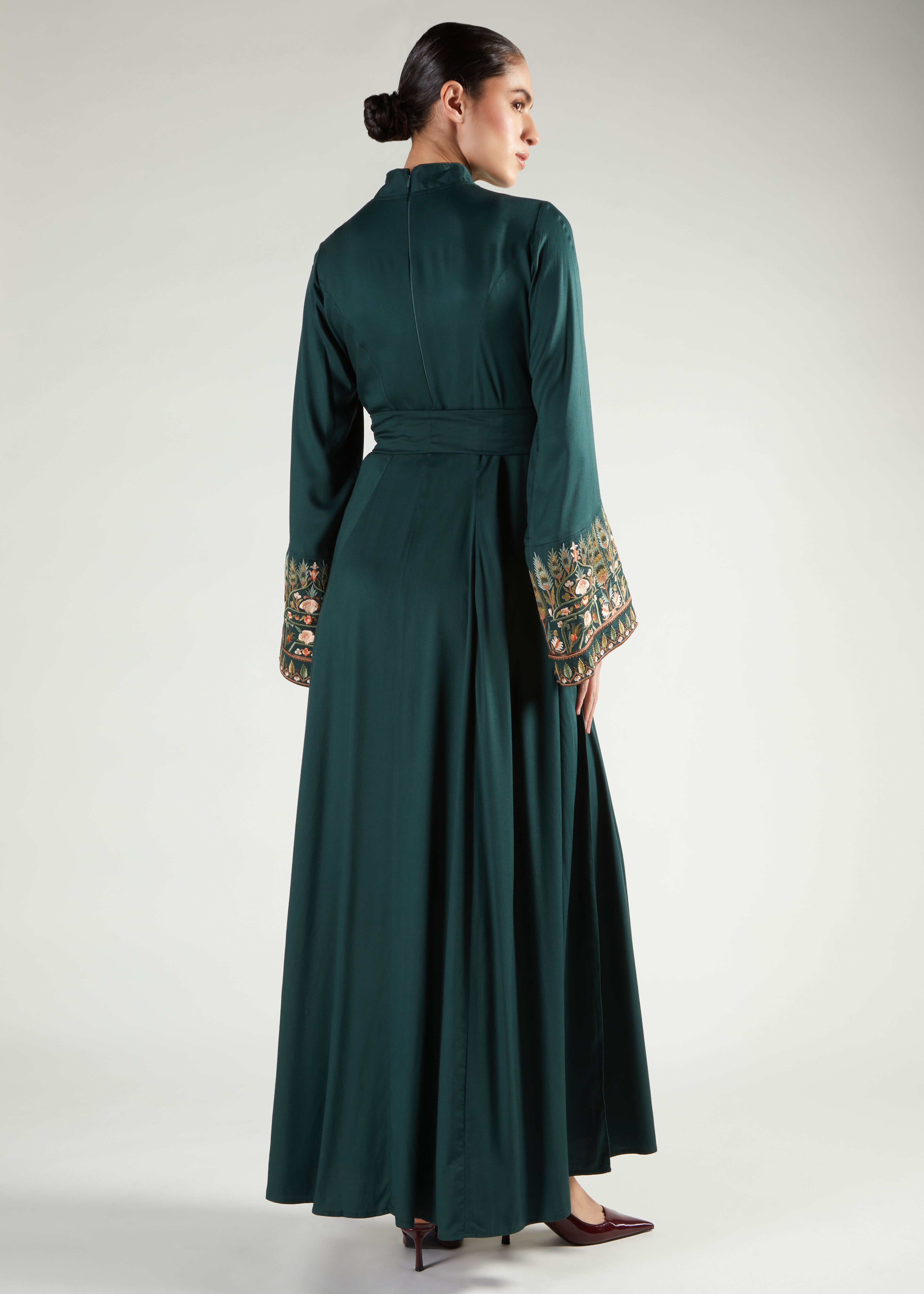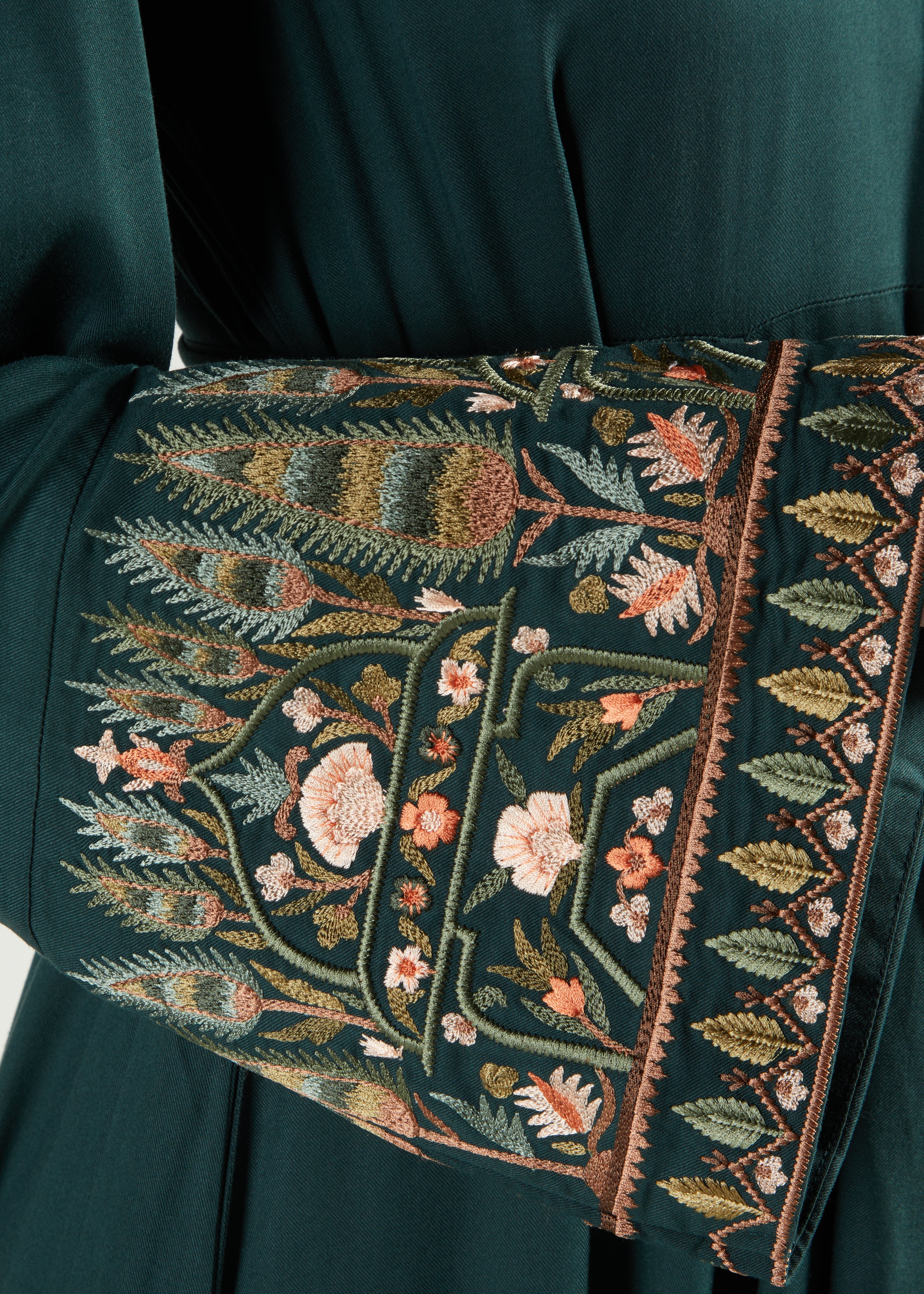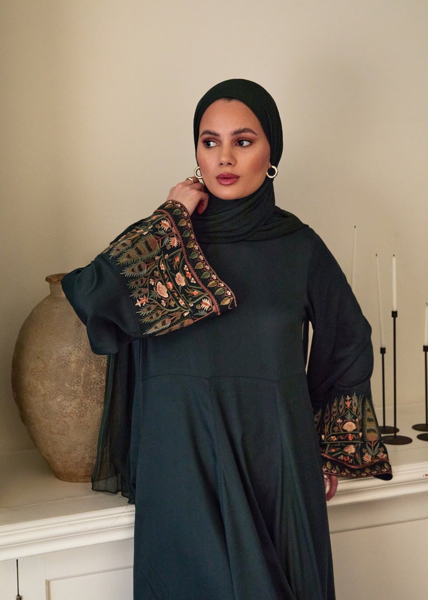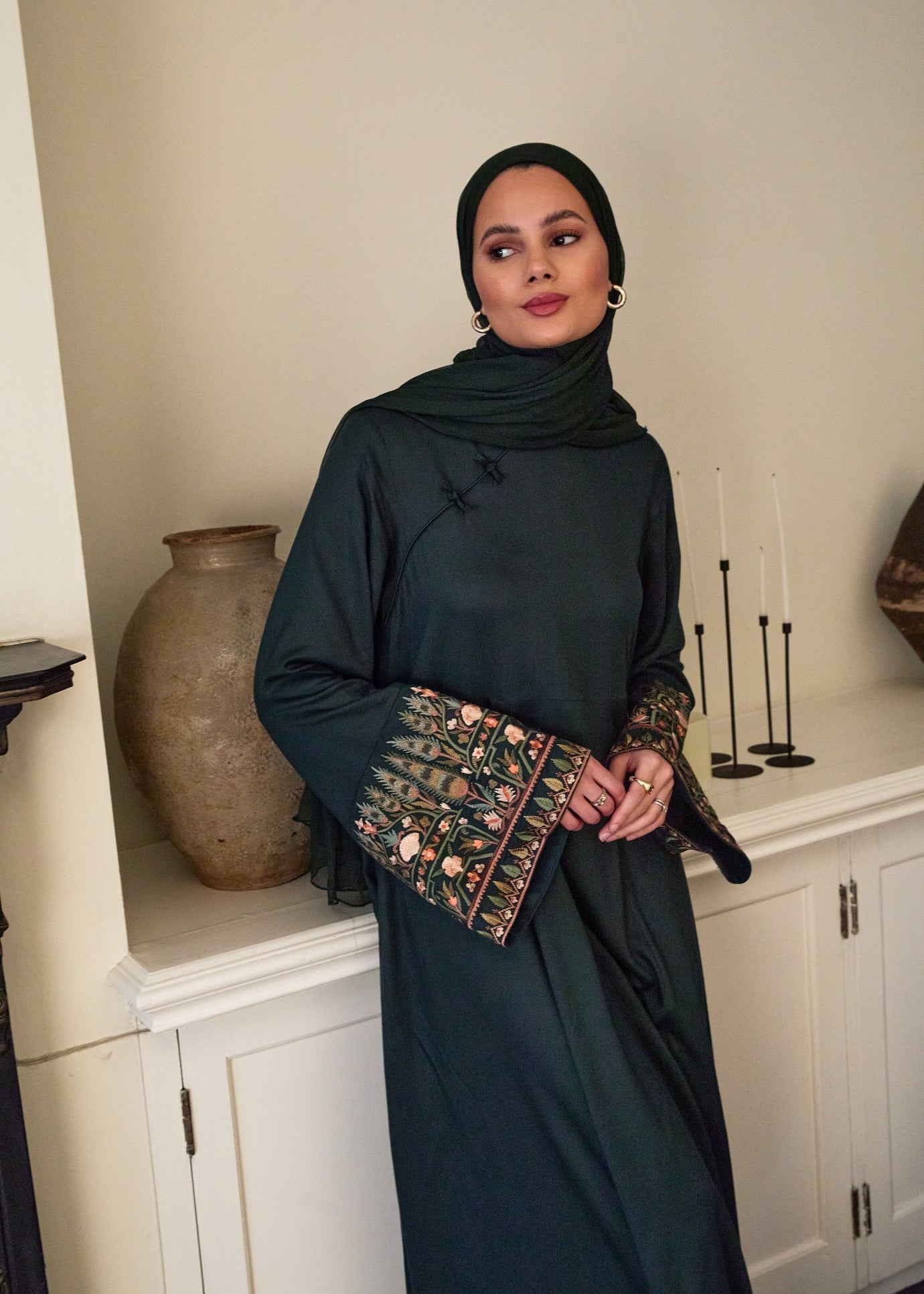Behzad Abaya features heavily embroidered cuffs which has been inspired by classical miniature art featuring a botanical motif. It has oriental style buttons on the neckline as well as a wide belt allowing you to cinch in at the waist.
