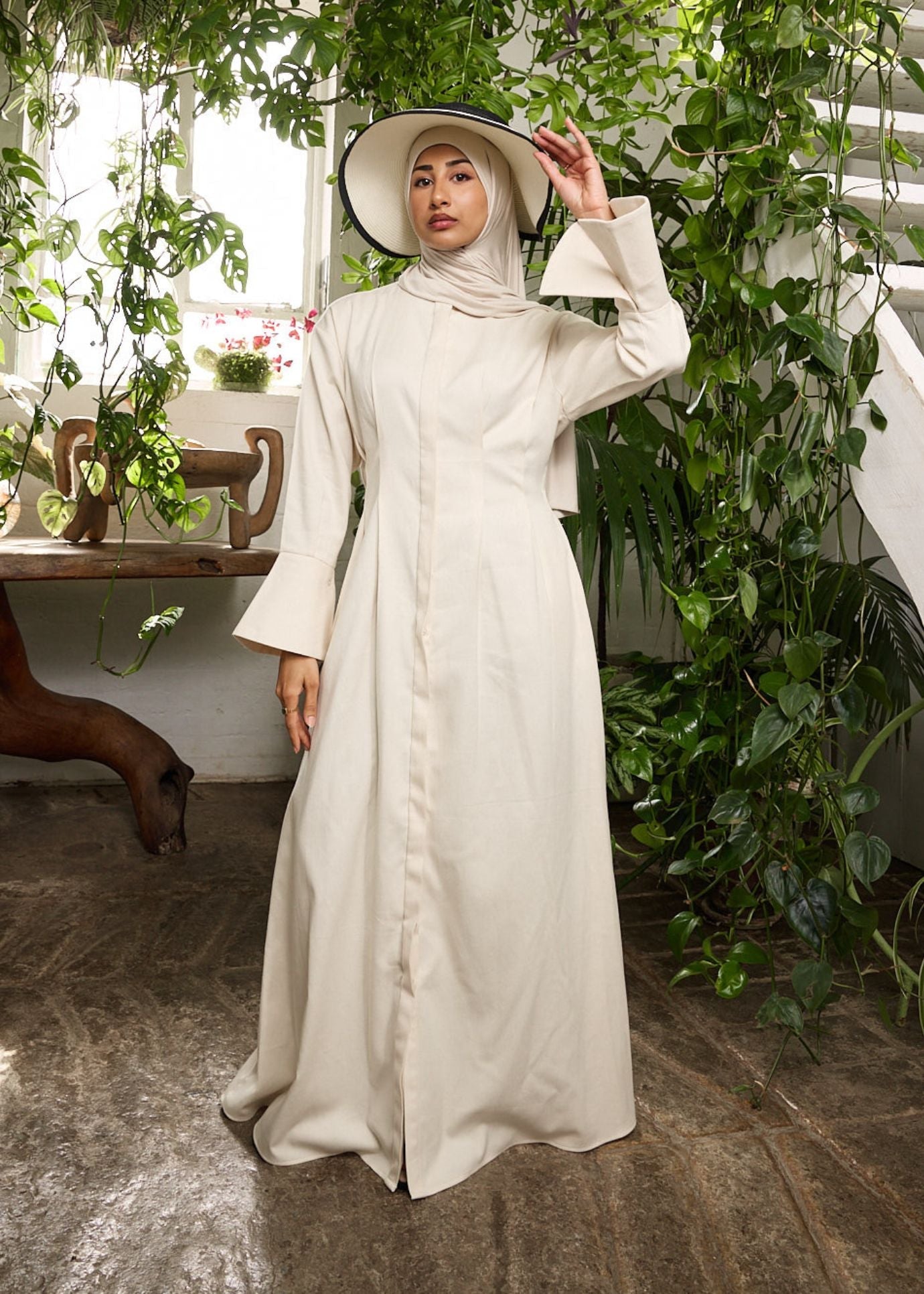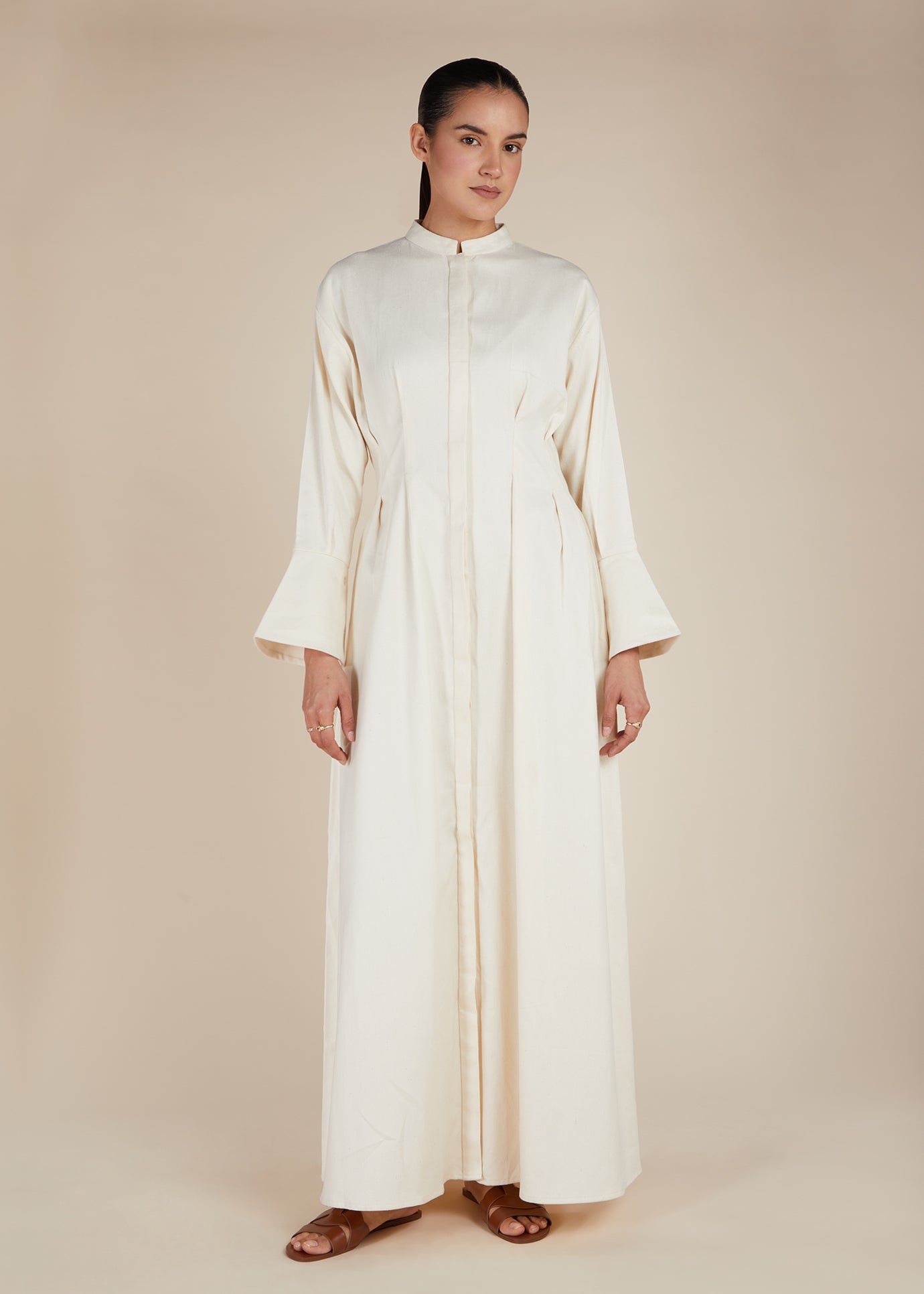 Elevate your wardrobe with this elegant and timeless full-length garment, designed with understated sophistication in mind. Made from a soft, natural-toned fabric, this piece features tailored panelling for a flattering silhouette and is perfect for both everyday refinement and special occasions