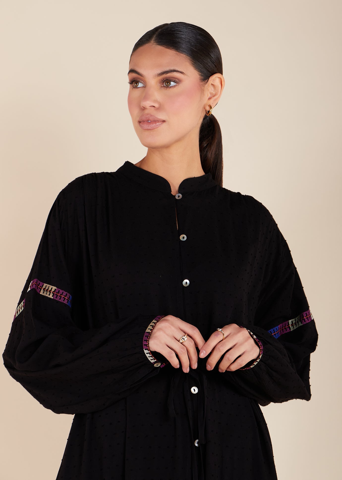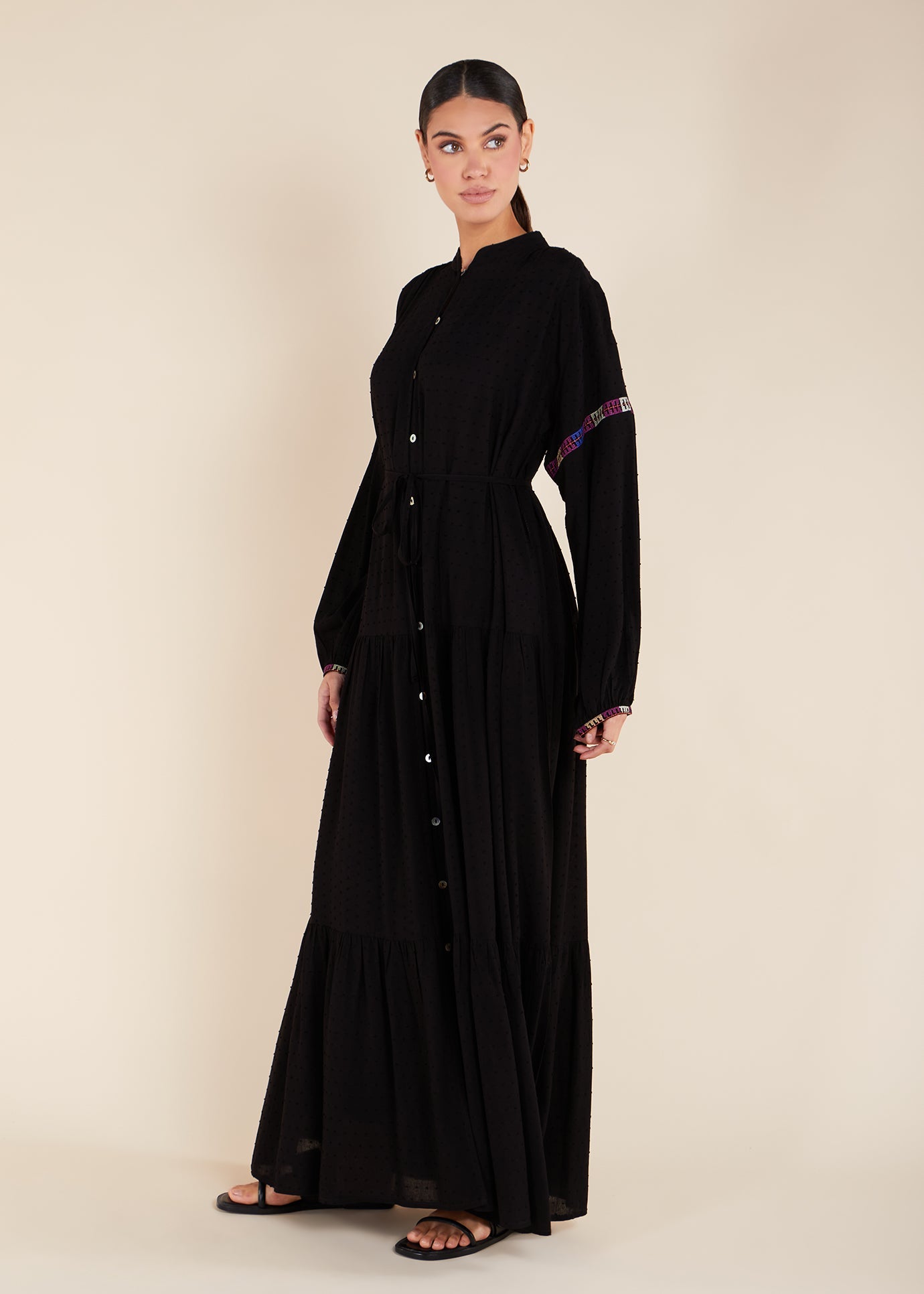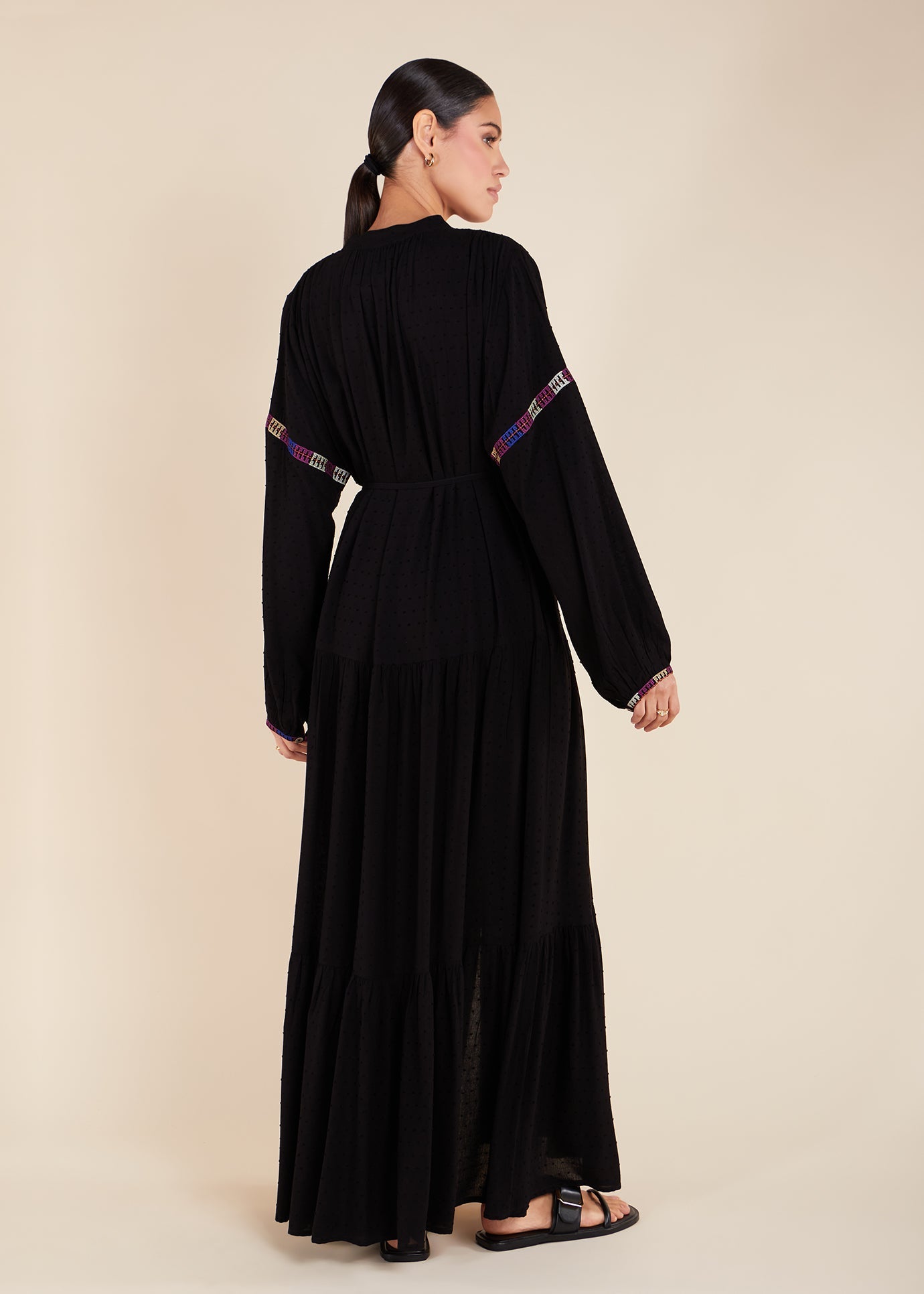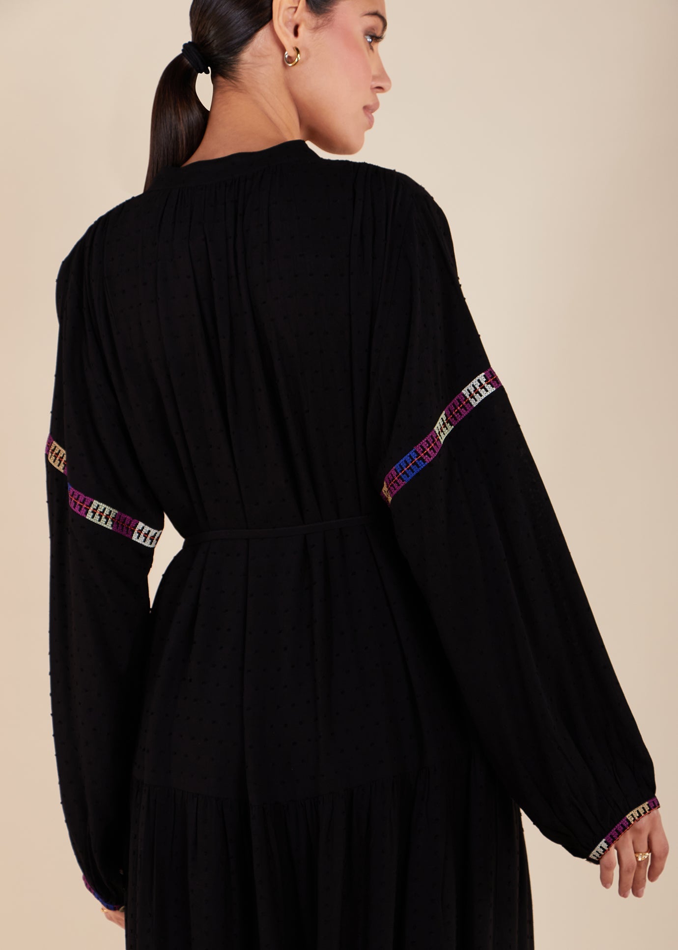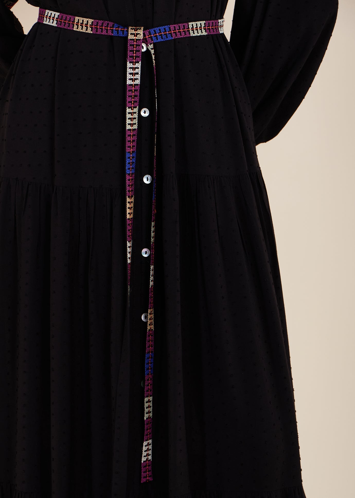 Berberis Maxi has a boho-inspired design complete with subtle tiers and balloon-style sleeves. The colourful cross-stitch embroidery motif on the cuffs and upper arm adds a touch of elegance. Maxi includes a plain belt or purchase the embroidered one to enhance the outfit. This Maxi also features shell buttons for a refined finish.