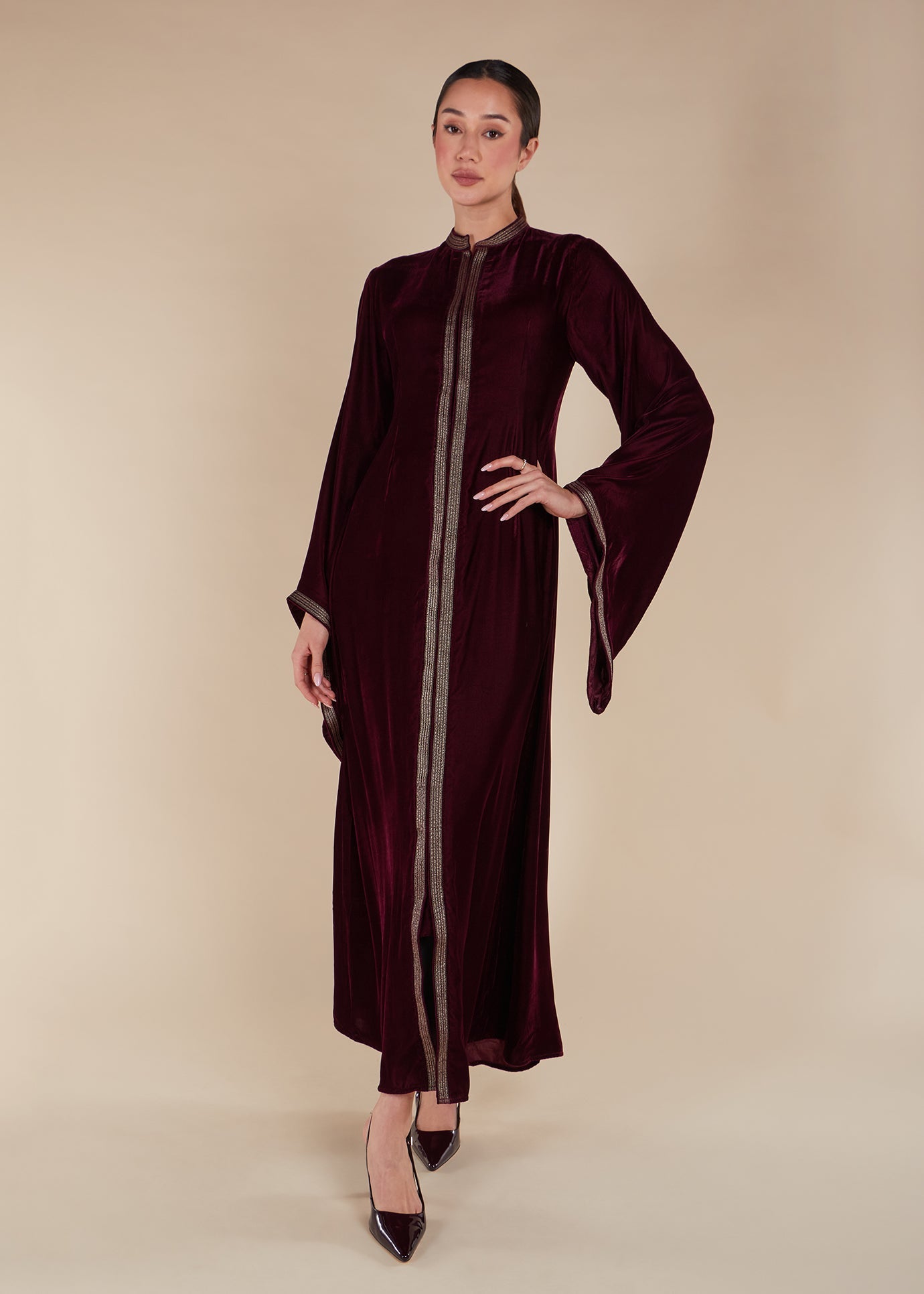 This full-length abaya is crafted from deep burgundy velvet, offering a luxurious feel and a sophisticated look. The abaya features an elegant front closure with an intricately embellished embroidered trim that runs vertically from the neckline to the hemline, adding a refined and timeless touch. Its wide sleeves provide a graceful silhouette, complementing the overall flowing design.