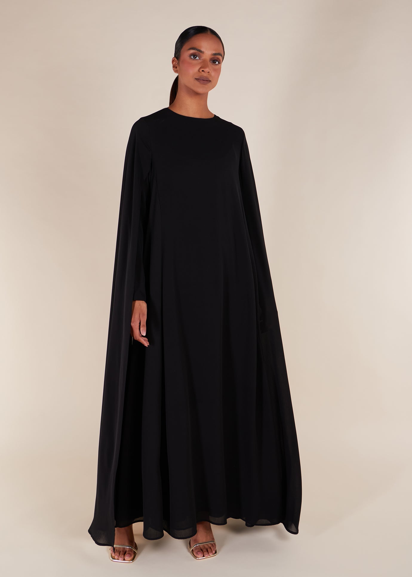 This striking maxi gown features an attached cape crafted from flowing black chiffon, offering an elegant drape ideal for formal occasions such as graduations and evening events. Designed with a regular fit for the main body and a gracefully draping cape. Opens at the back neckline, this all-in-one piece can be effortlessly styled with your preferred accessories to create a sophisticated statement look.
