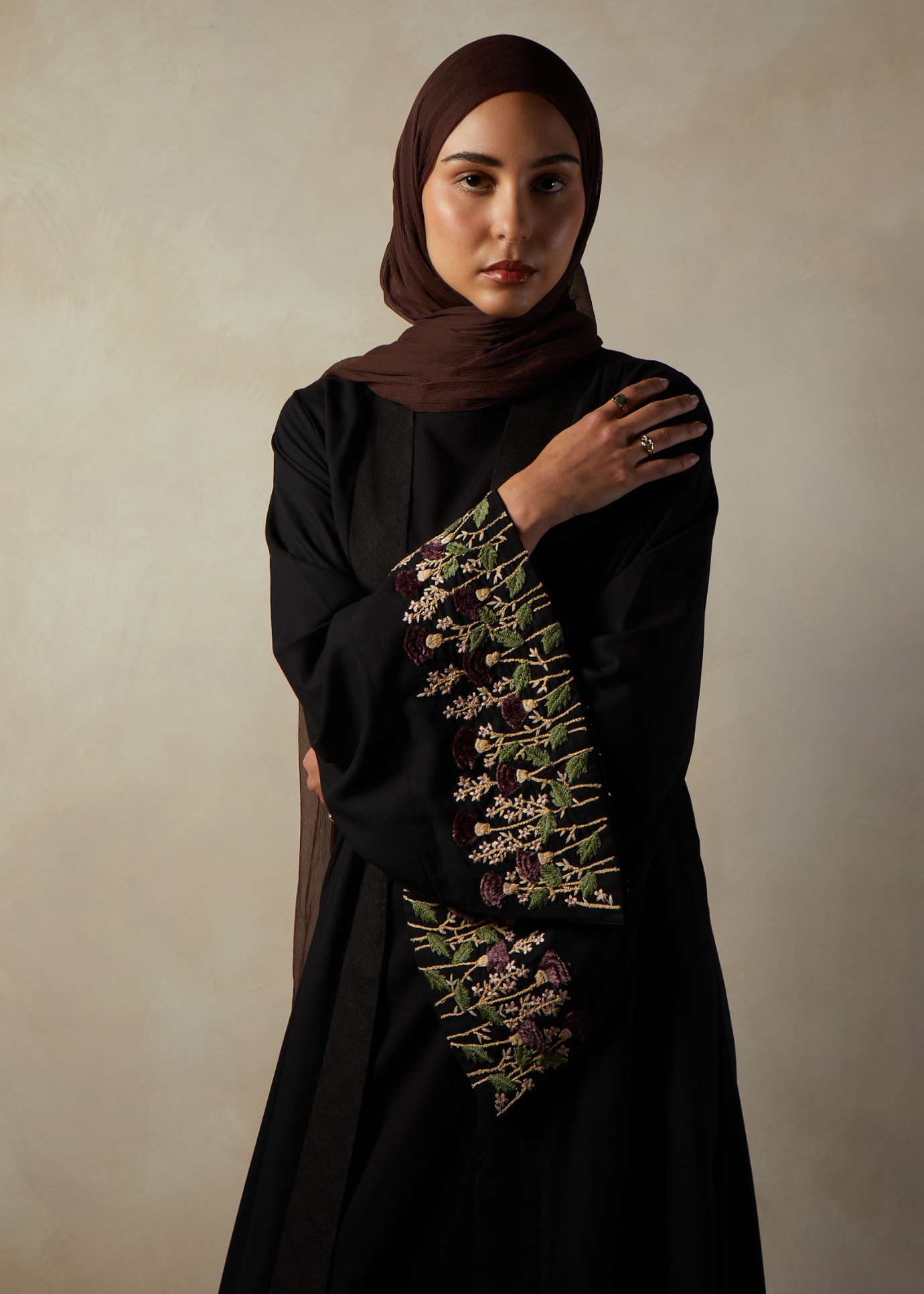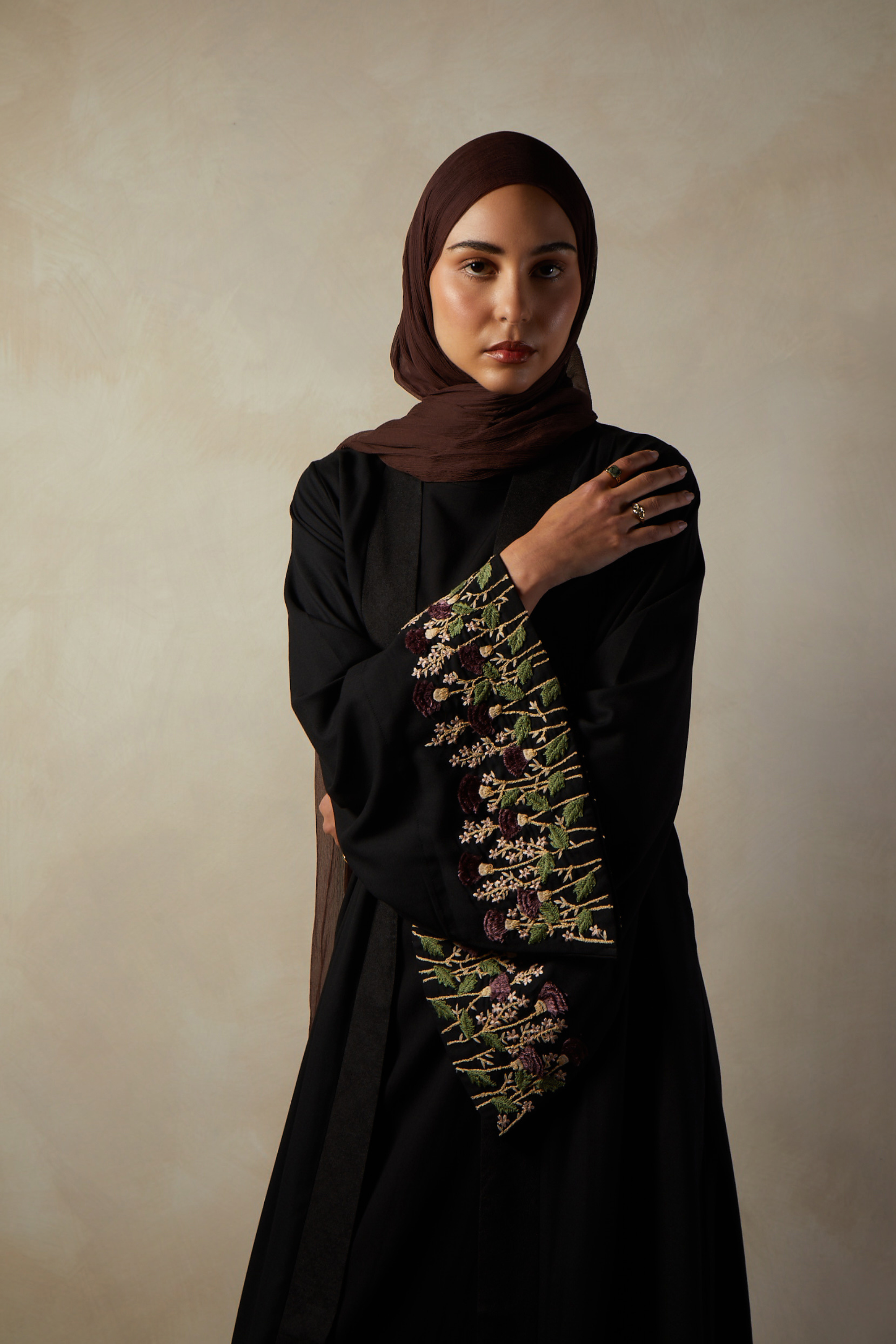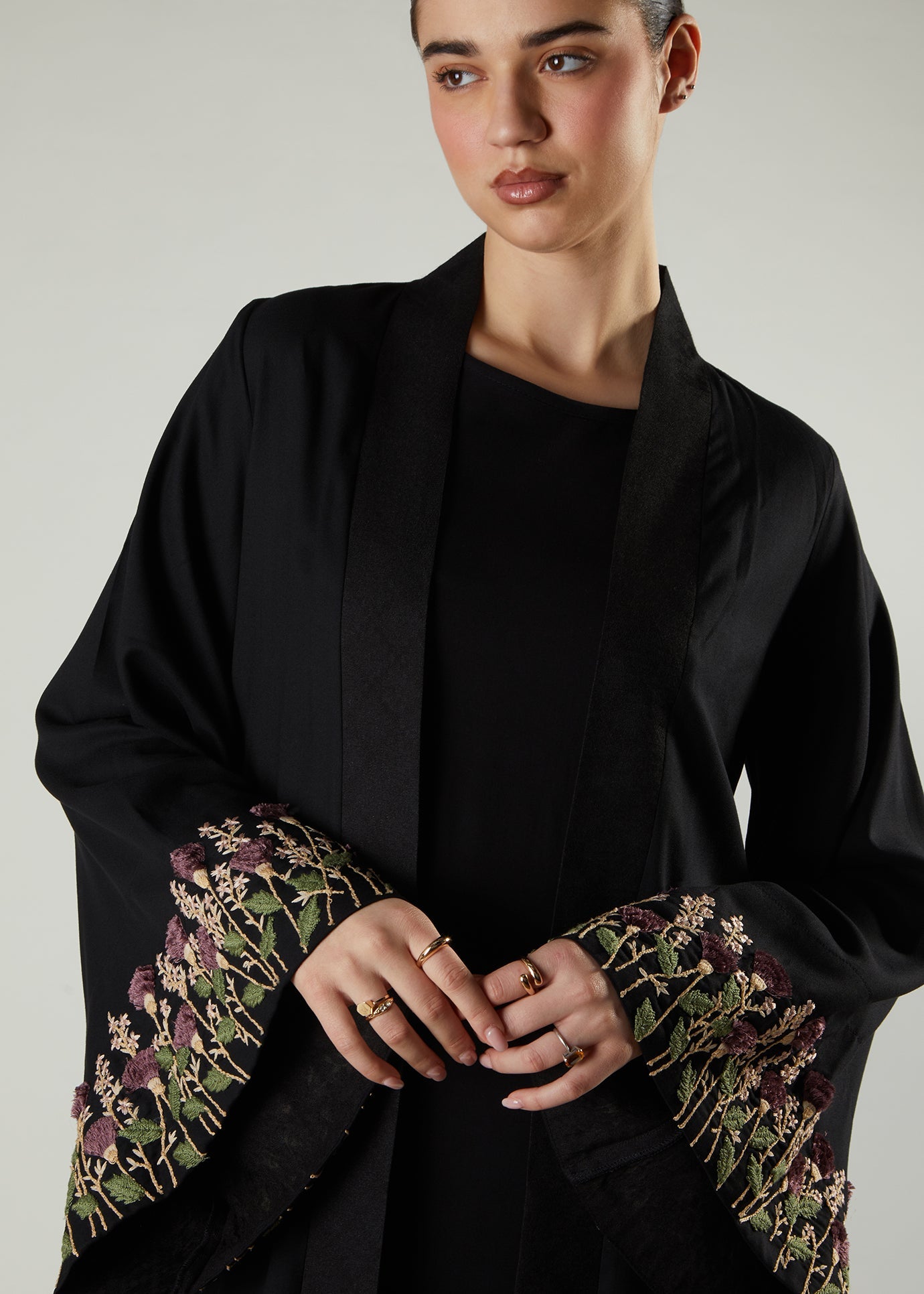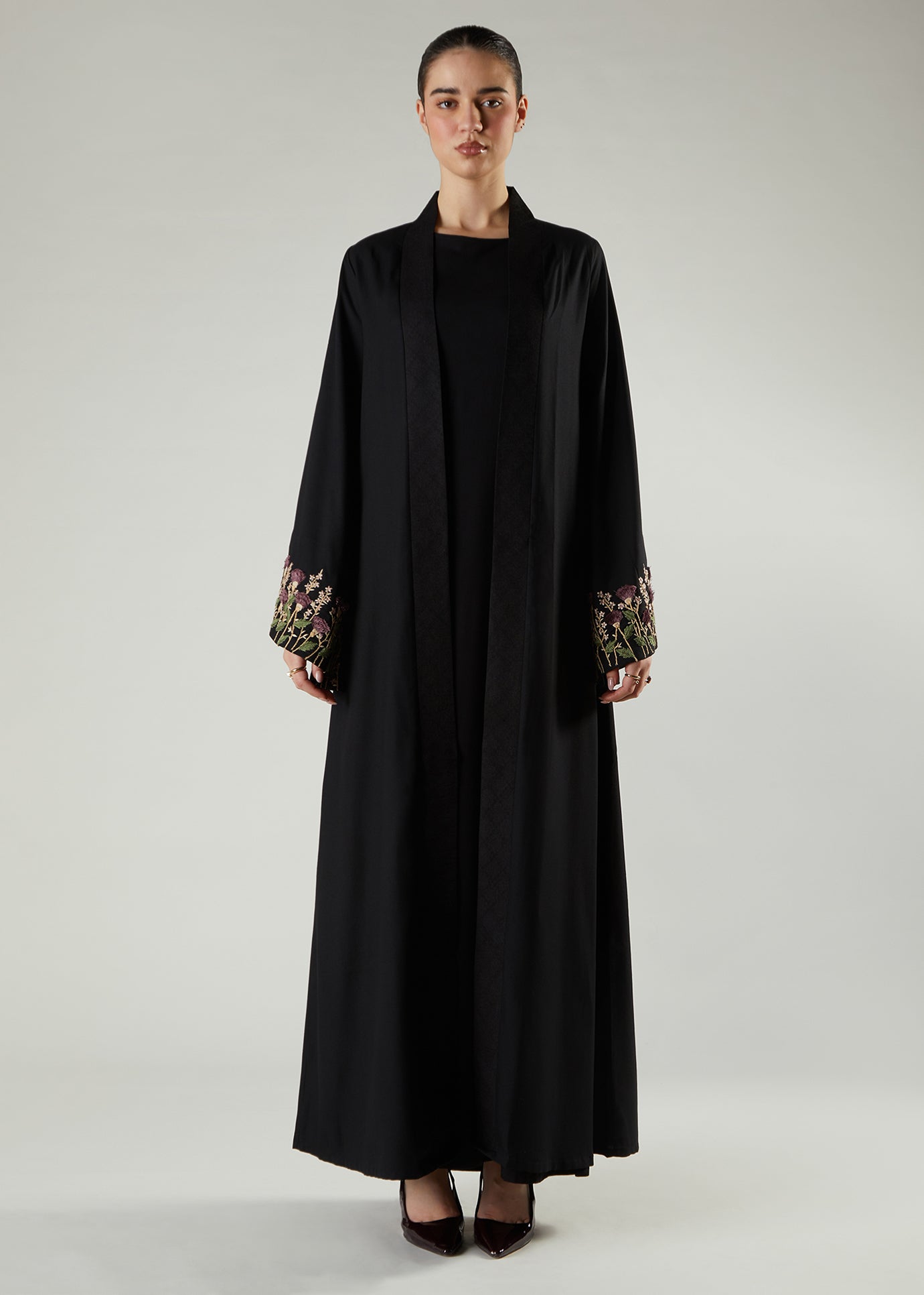 This Open Abaya features a woven placket and heavily embroidered sleeves featuring 3D style embroidery. Thistle themed flowers are featured adding a subtle pop of colour to this beautiful open style Abaya.
