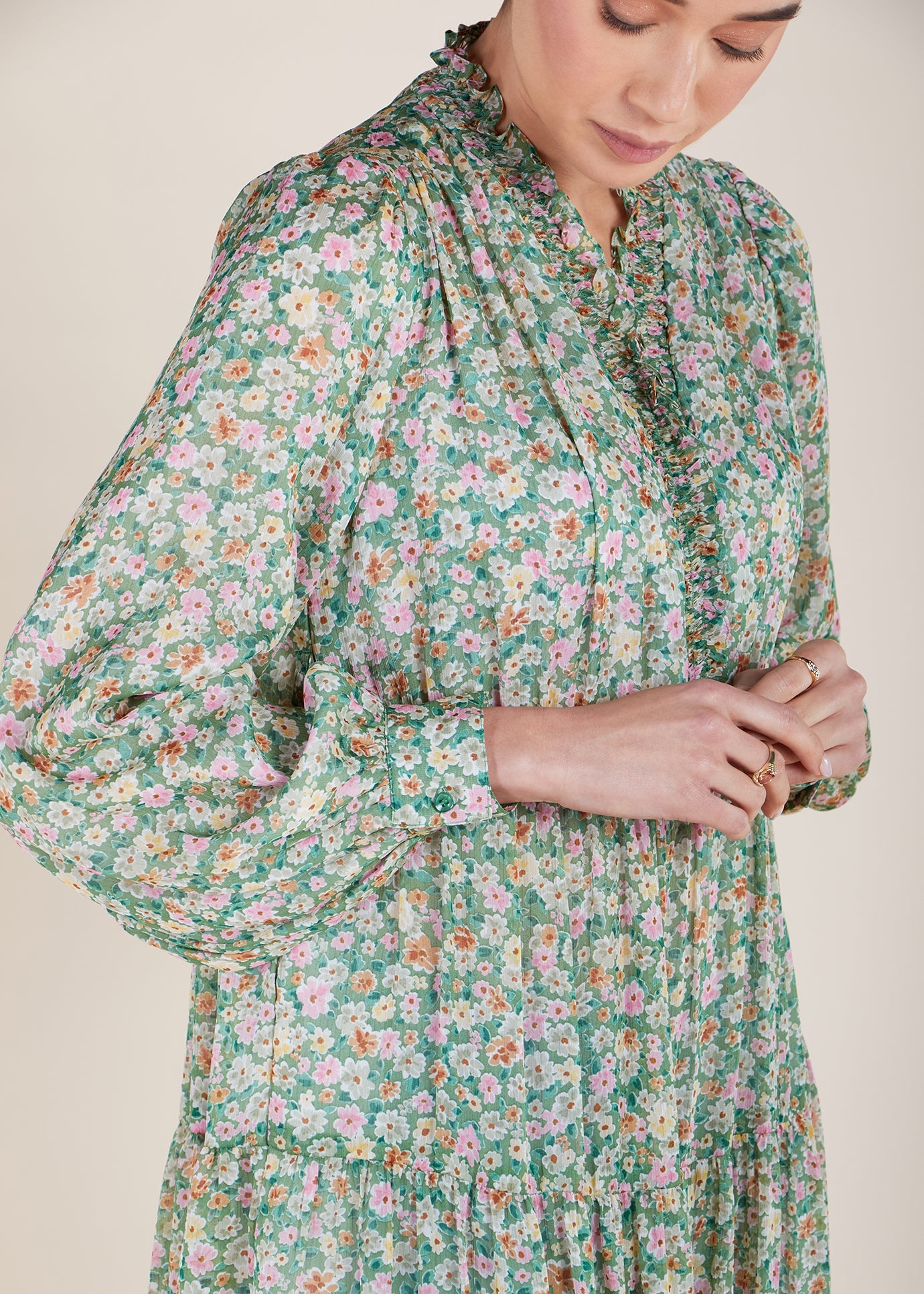 Elegant and feminine, the Bloomcore Maxi Dress features a delicate ditsy floral print in soft pastel tones. Its fluid and flowy design is accentuated by a tiered cut and is complemented by natural shell buttons and a cinching belt that adds shape to the waist. This must-have maxi dress is perfect for any occasion.