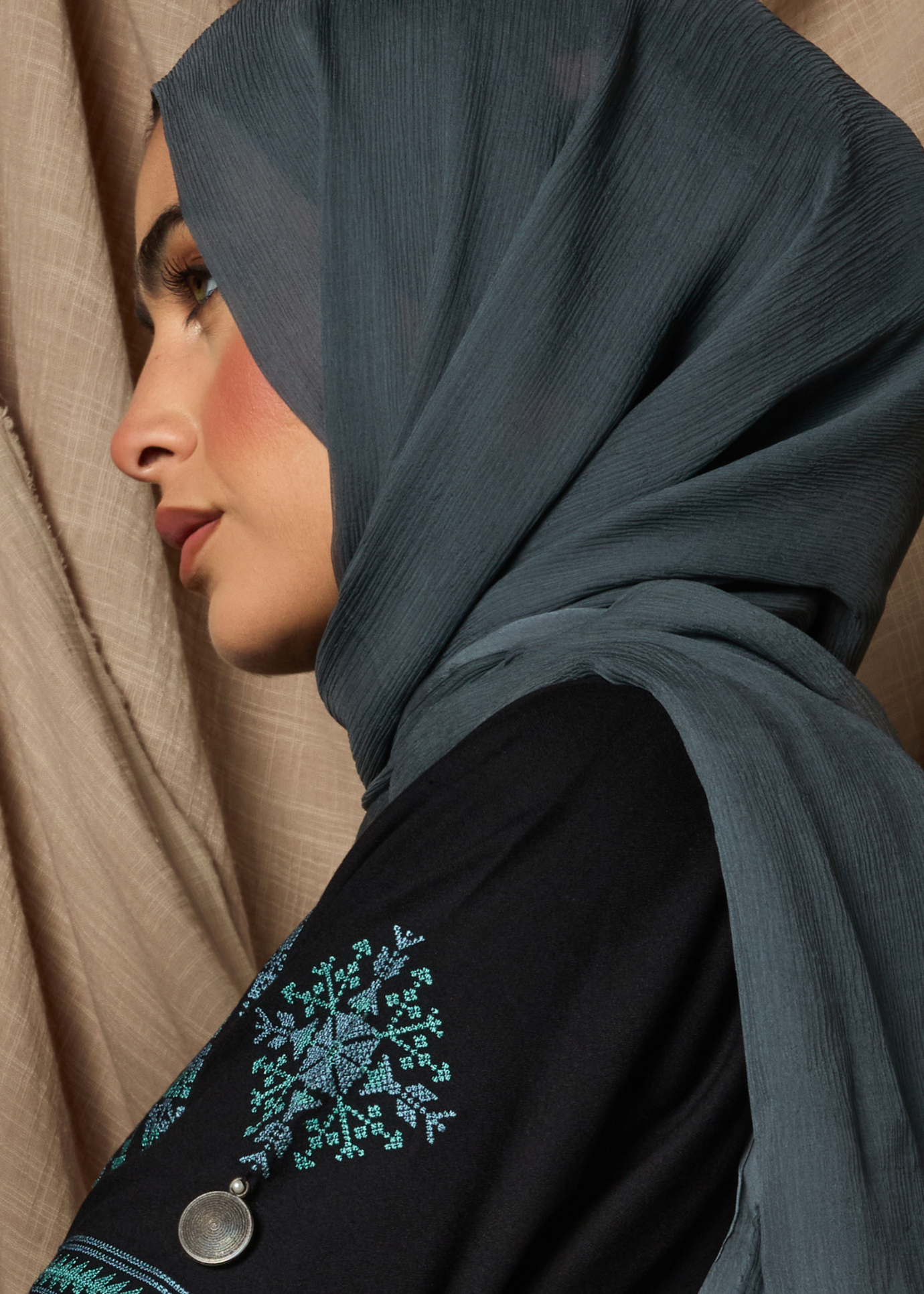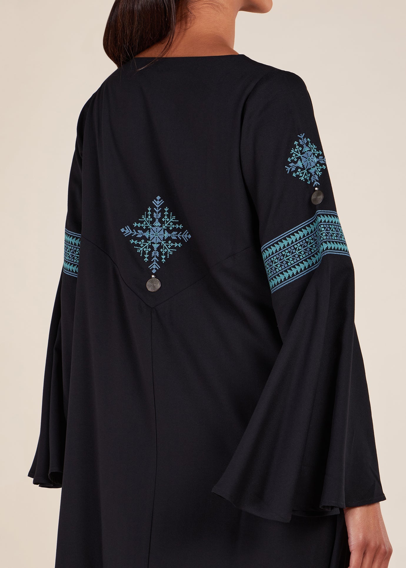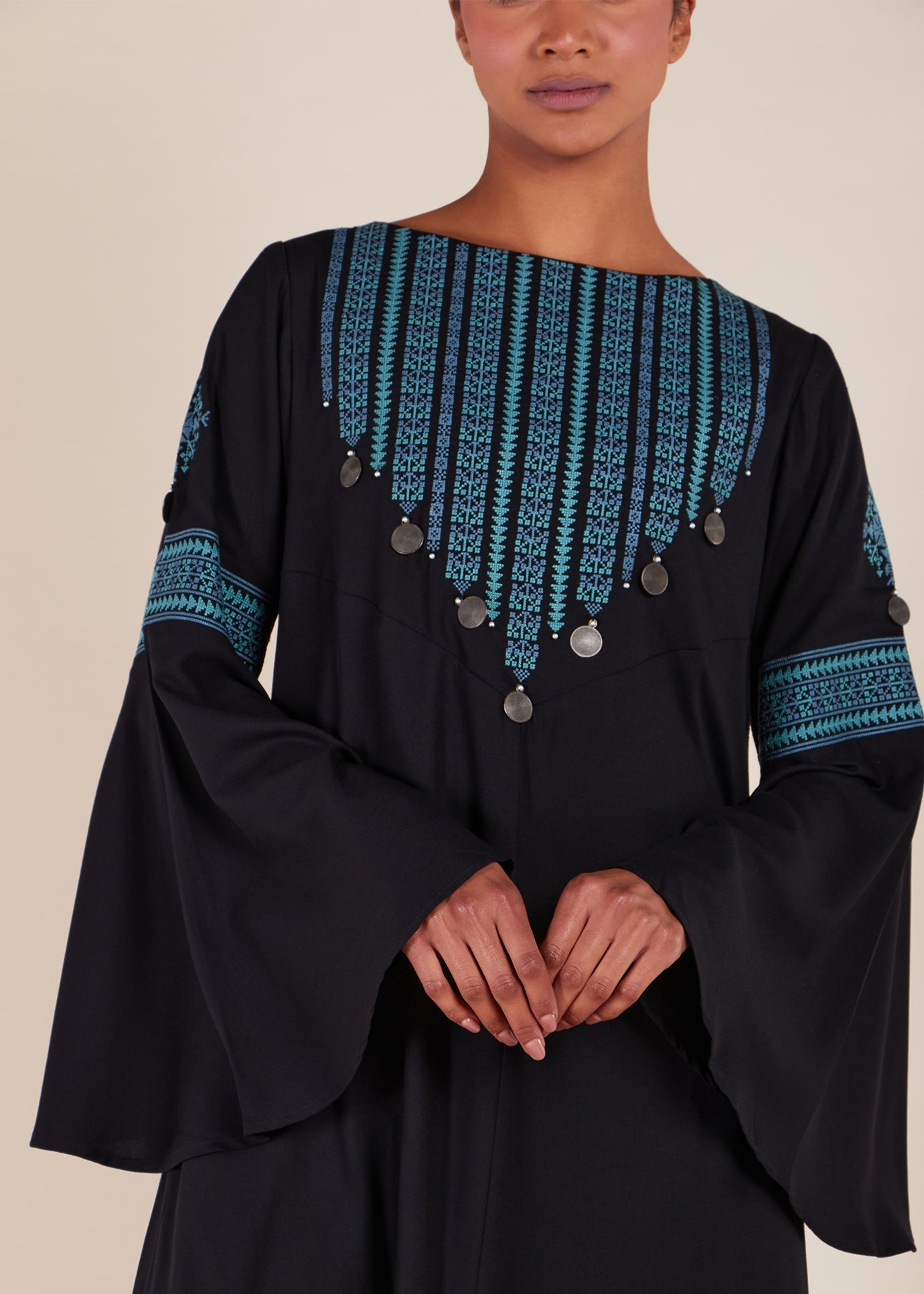 The Blue Heriz Abaya has traditional Tatreez embroidery in striking shades of blue, prominently displayed on the back, bodice, and sleeves, enhanced with decorative coins. Designed with a flared A-line shape, this abaya is an elegant choice for formal events.