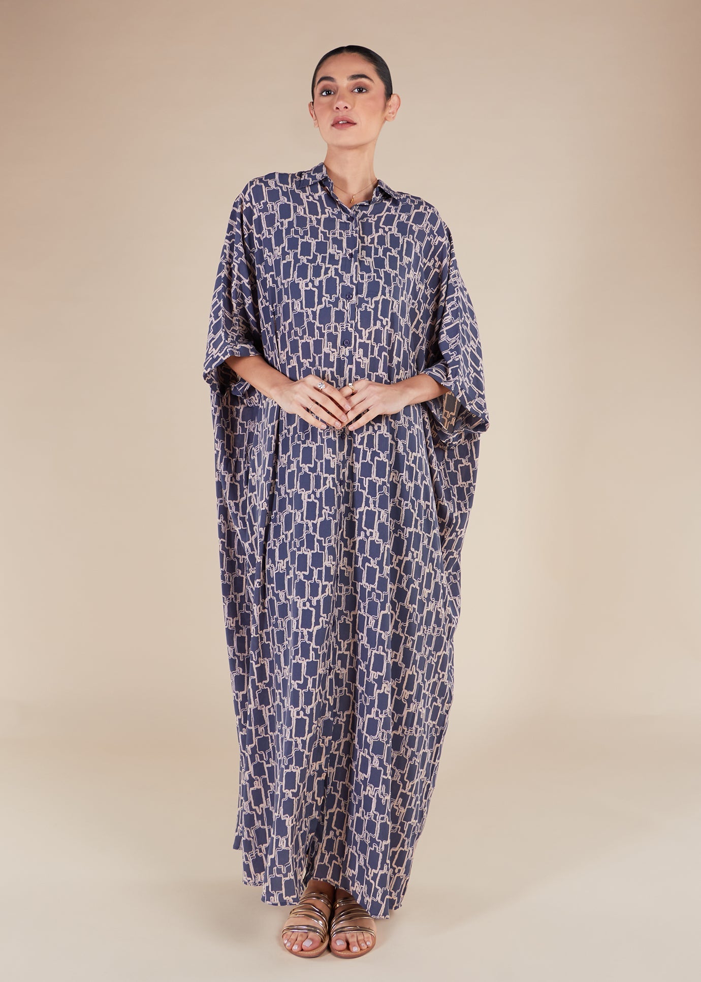 This kaftan is designed in a loose fitting, maxi style with a vibrant graphic print. It is lightweight and ideal for summer travels, featuring a front button opening. Its lightweight design makes it perfect for travelling and can be worn over swimwear for quick drying.