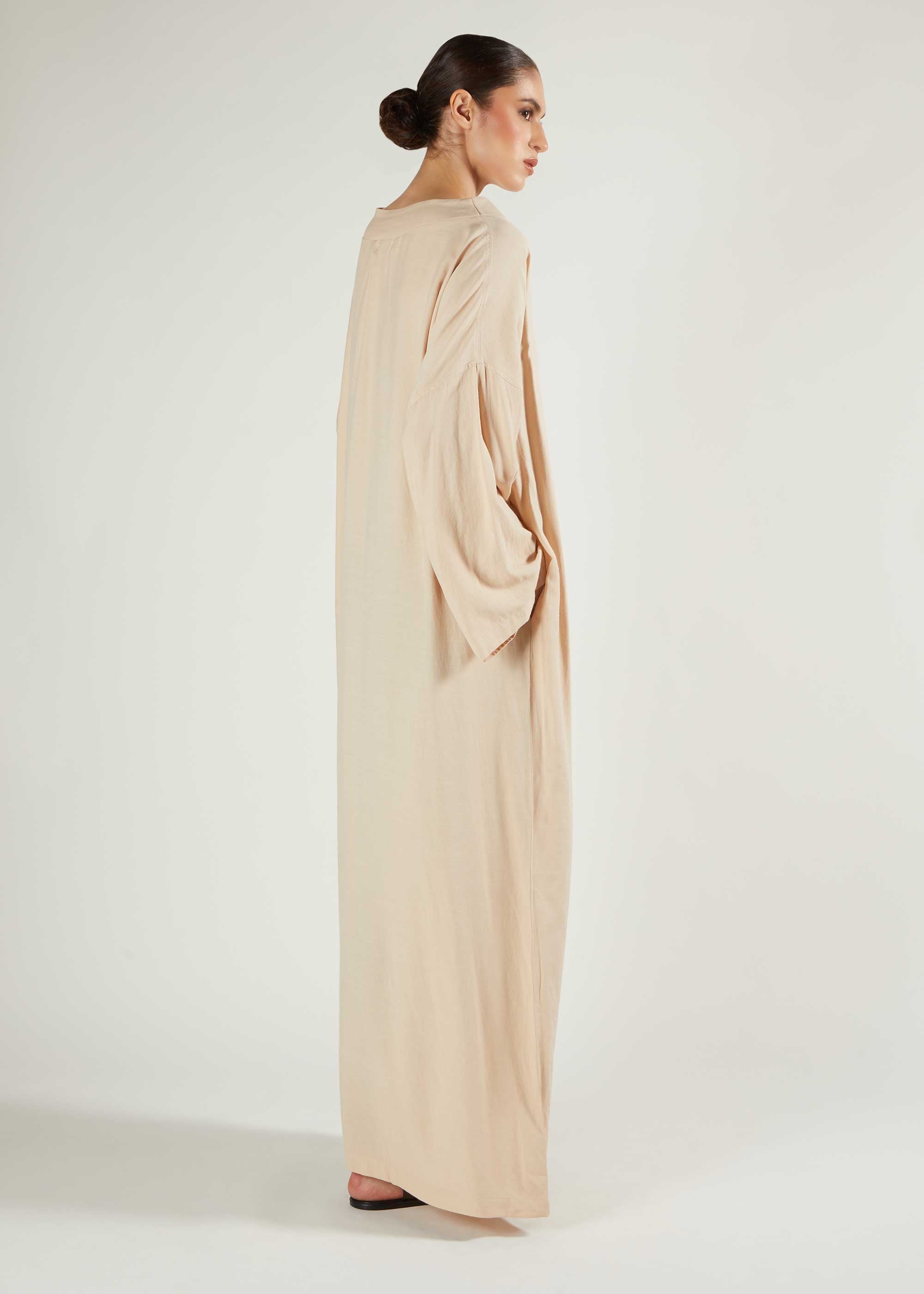 This abaya showcases a boat neckline and a modest, relaxed silhouette. Ideal for both home and travel, it seamlessly integrates into your daily wardrobe and works well for layering. It also includes subtle side pockets for added convenience.