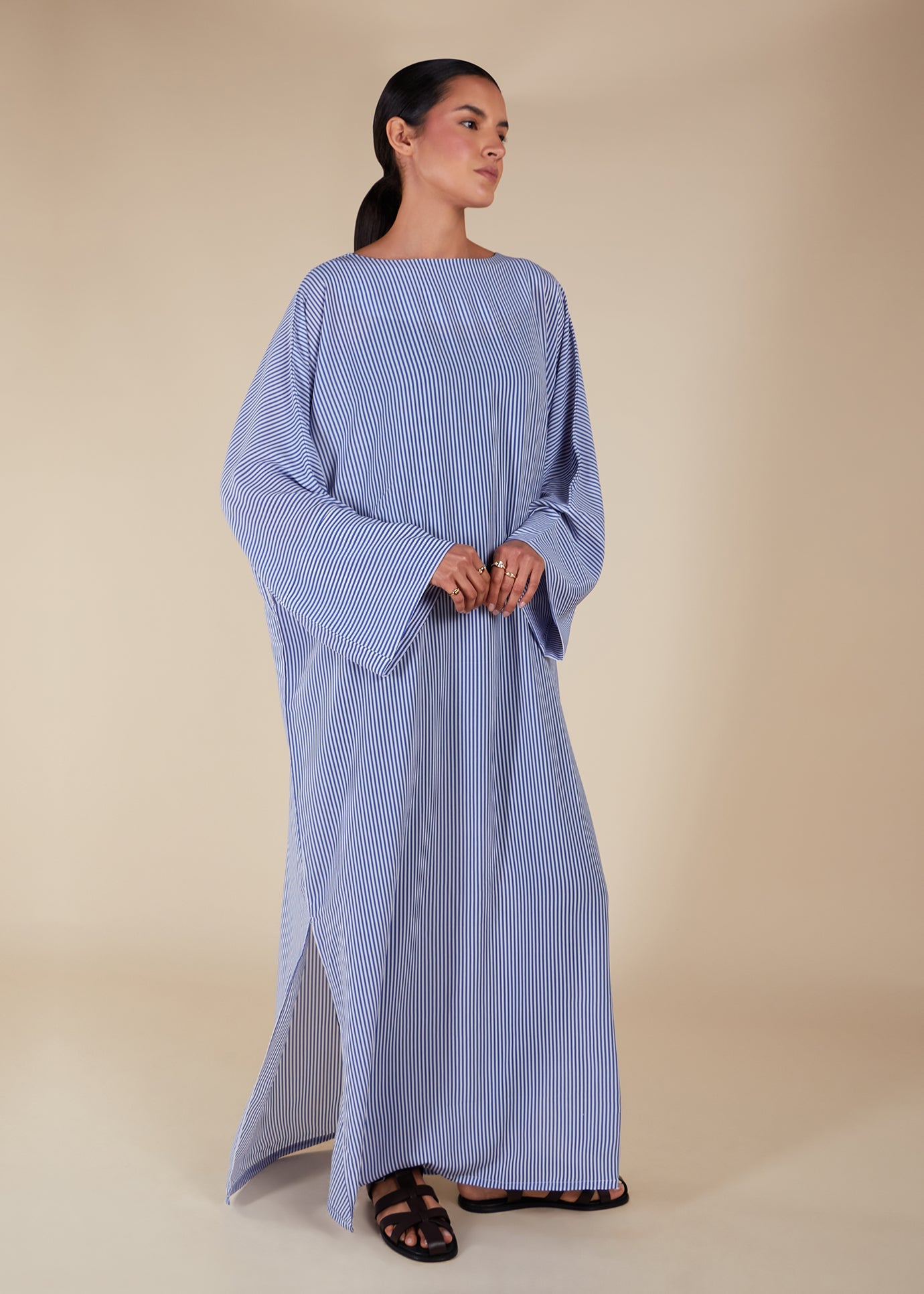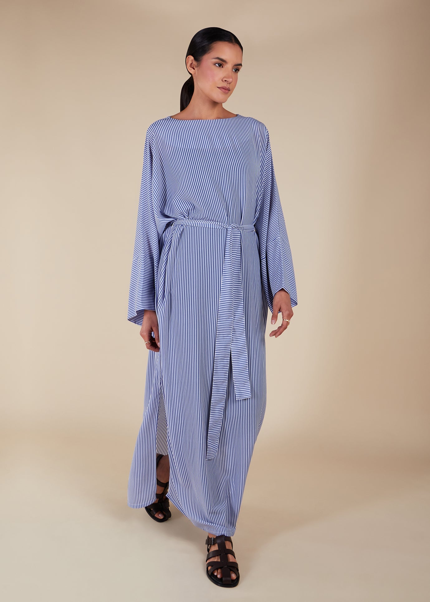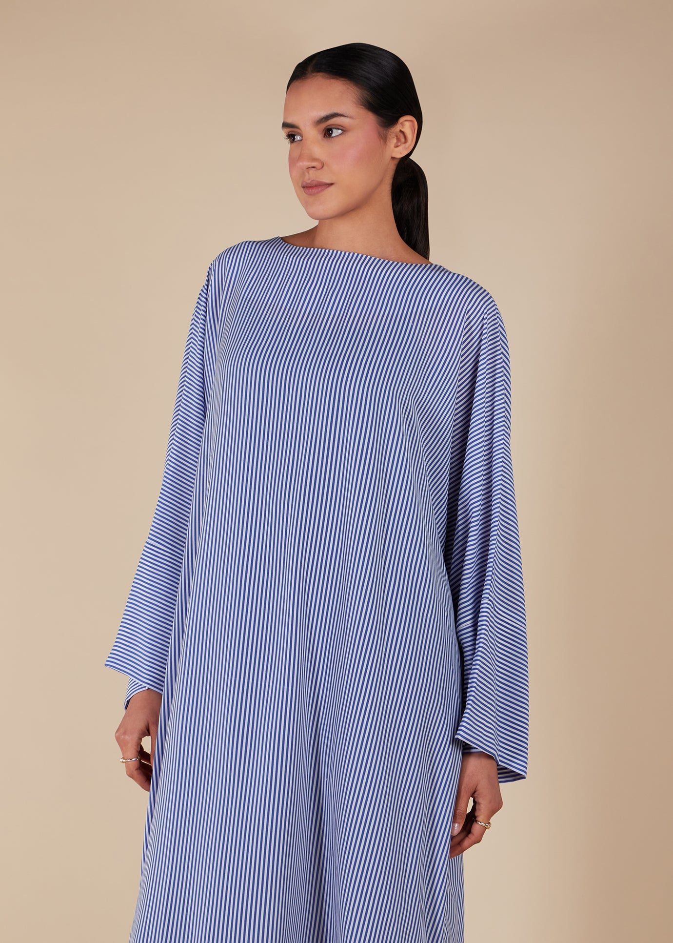Effortlessly elevate your summer wardrobe with our blue striped maxi. Featuring a boat neckline and a fluid, loose fit, this maxi is fully lined for maximum modesty. Whether you're at home or abroad, this is the perfect addition to any summer ensemble.