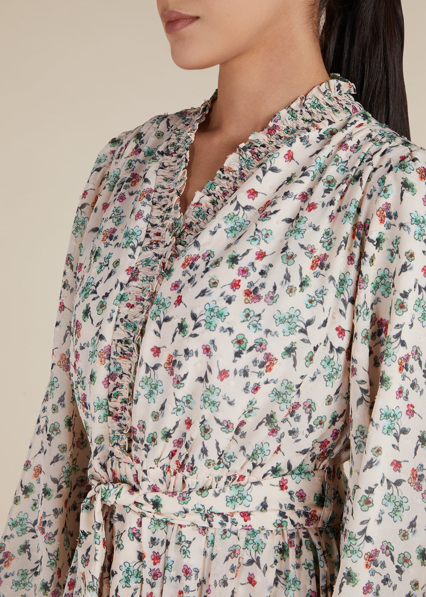 This soft floaty floral maxi has a delicate mini pastel floral print on a creamy base. Fully lined and designed with feminine tiers and ruffles, the maxi can be cinched at the waist with the self-fabric belt or paired with your own belt for a versatile look. Its loose cut silhouette accommodates the tiers, and we suggest ordering your usual size for the perfect fit. However, if you prefer a more fitted look, you may want to consider sizing down.