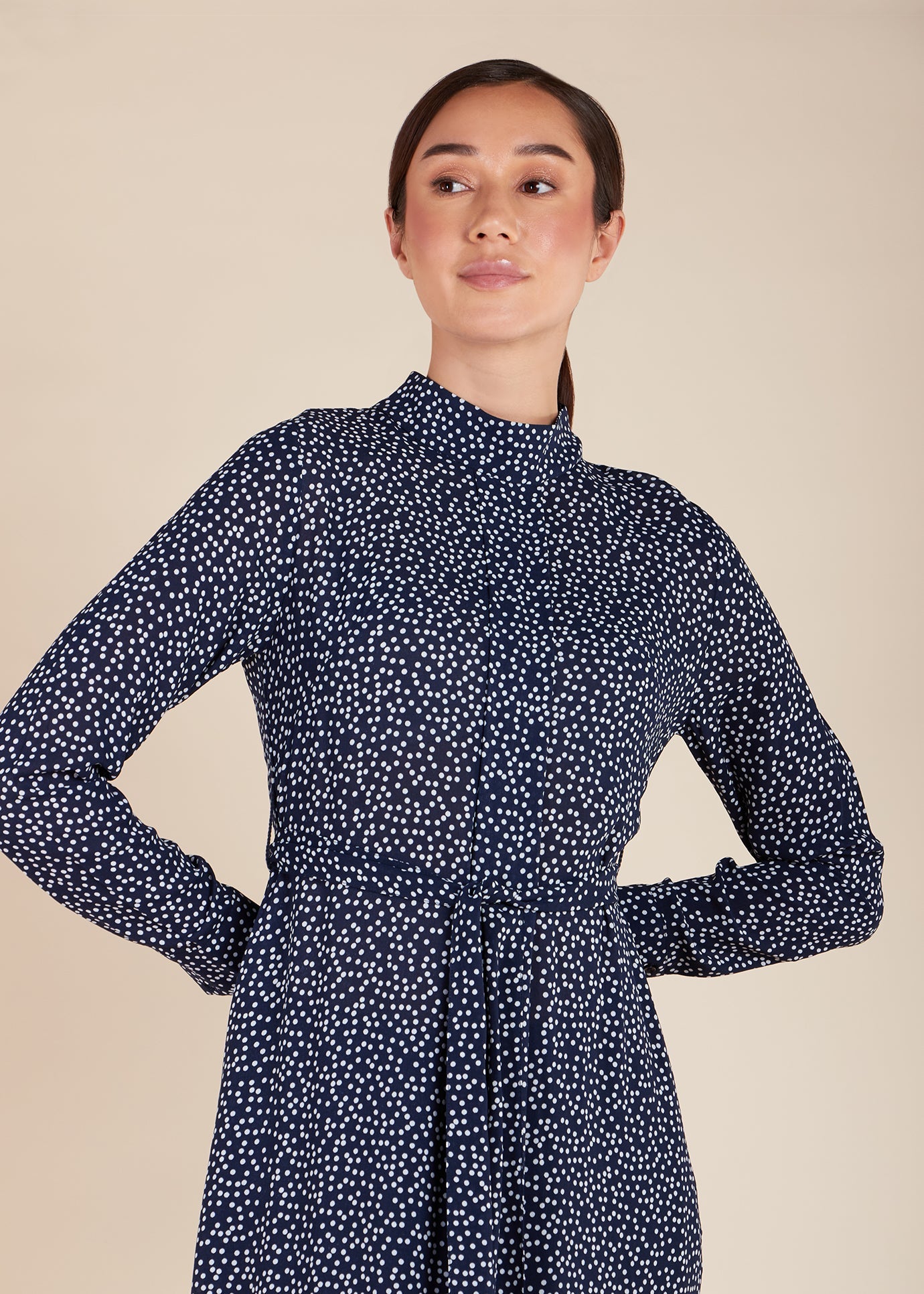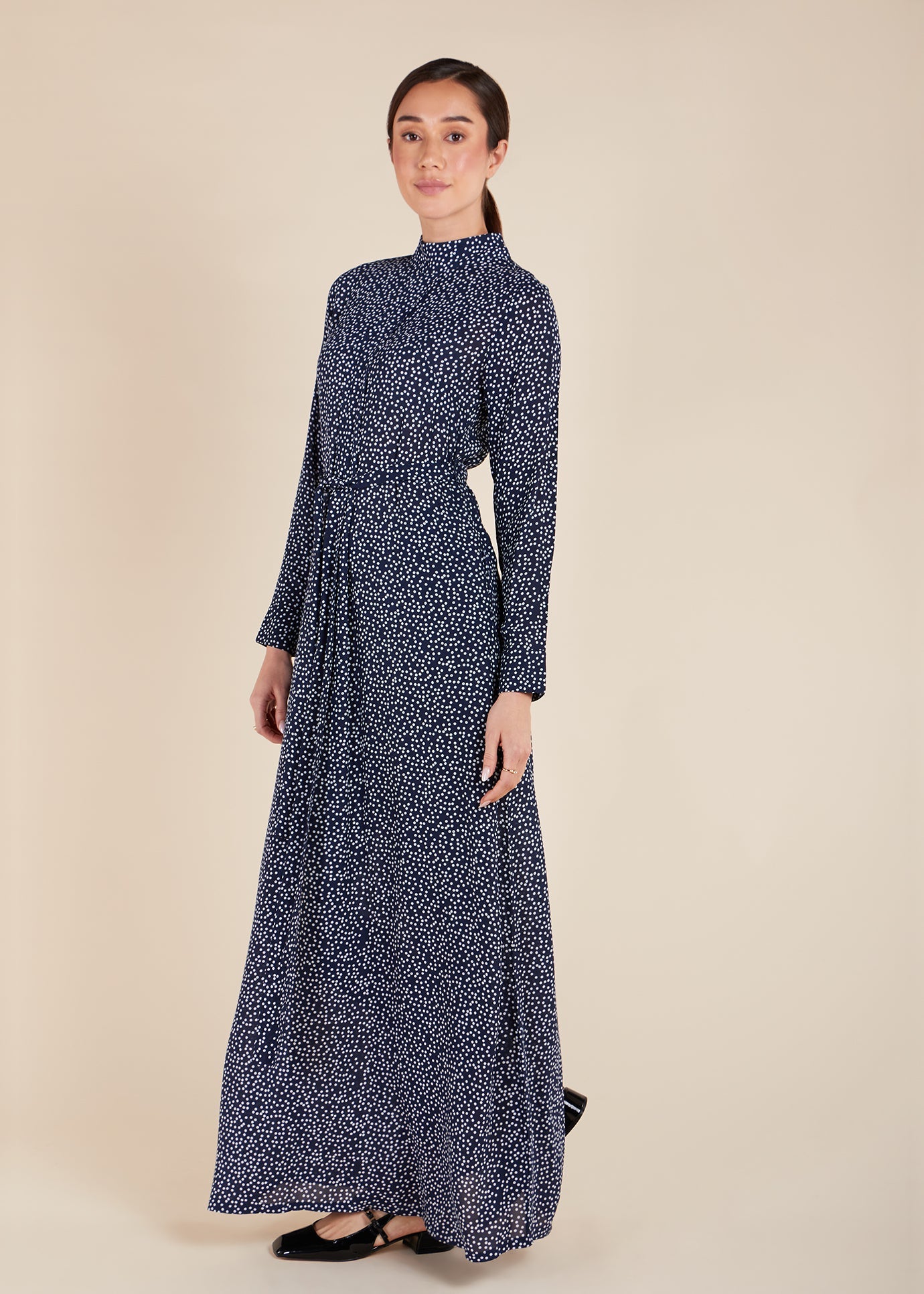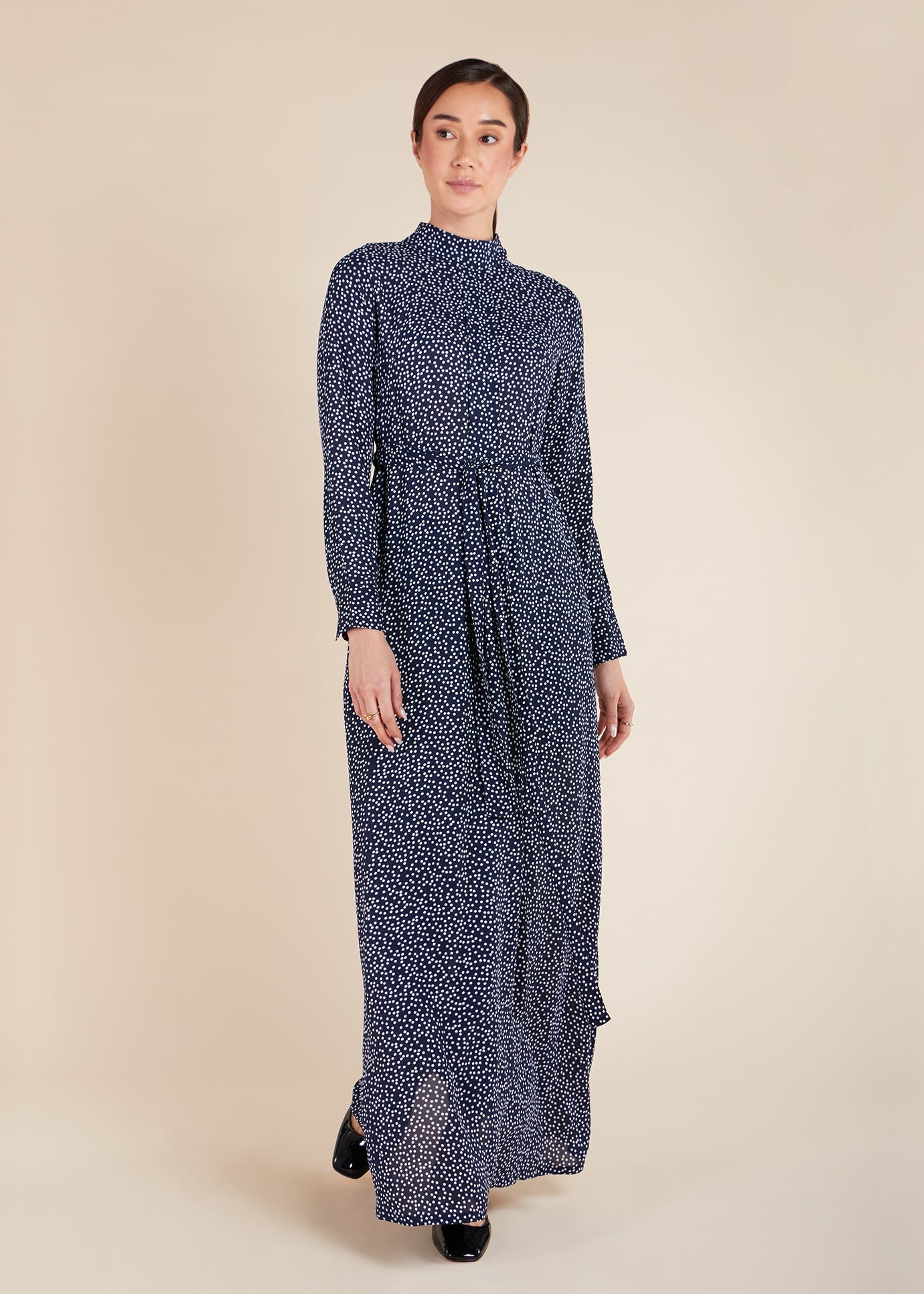 This maxi dress has a turtleneck design and a busy polka dot pattern. It also includes a concealed zip at the back and the option to add a belt. Alternatively, you can pair it with your own belt for a more personalised look. The dress features a fluid A-line silhouette and discreet side pockets.