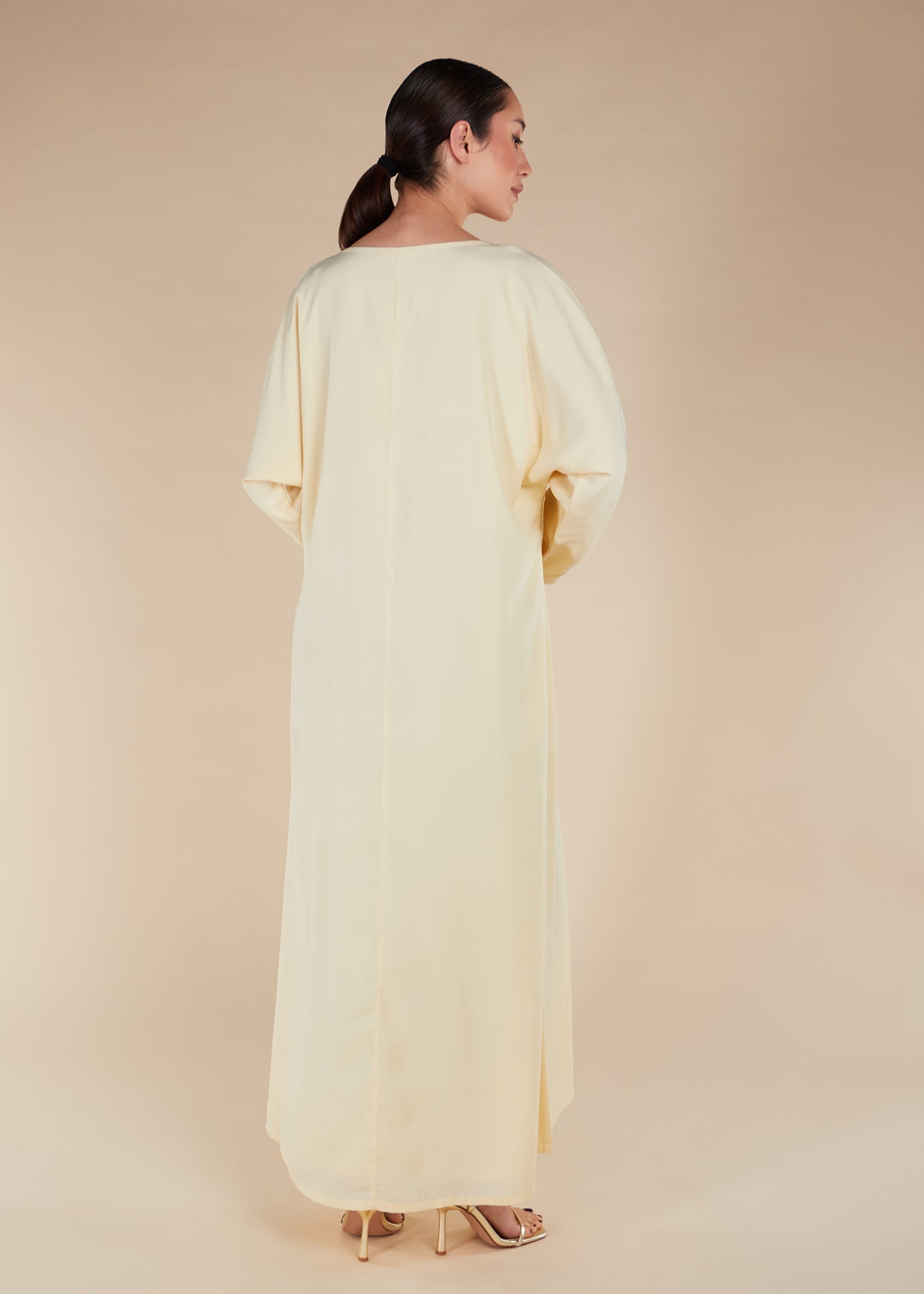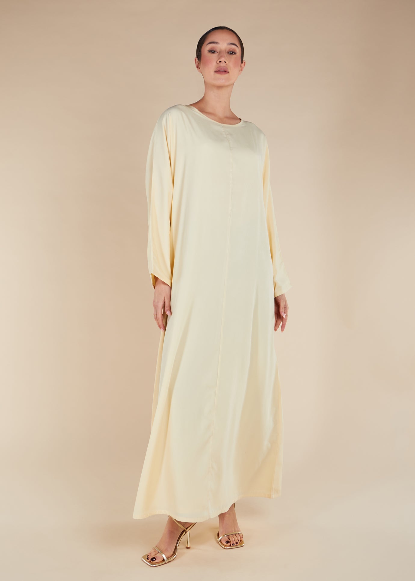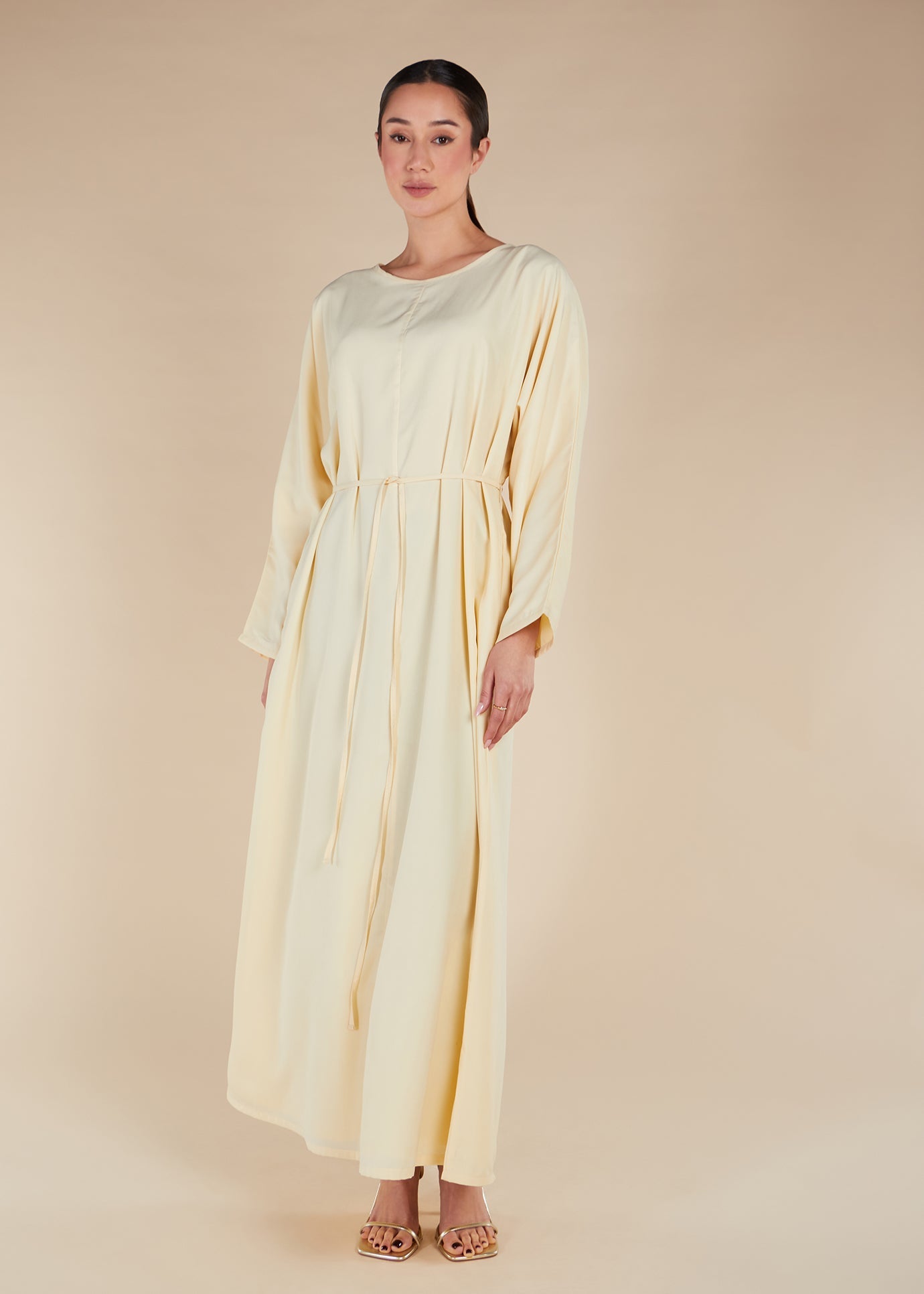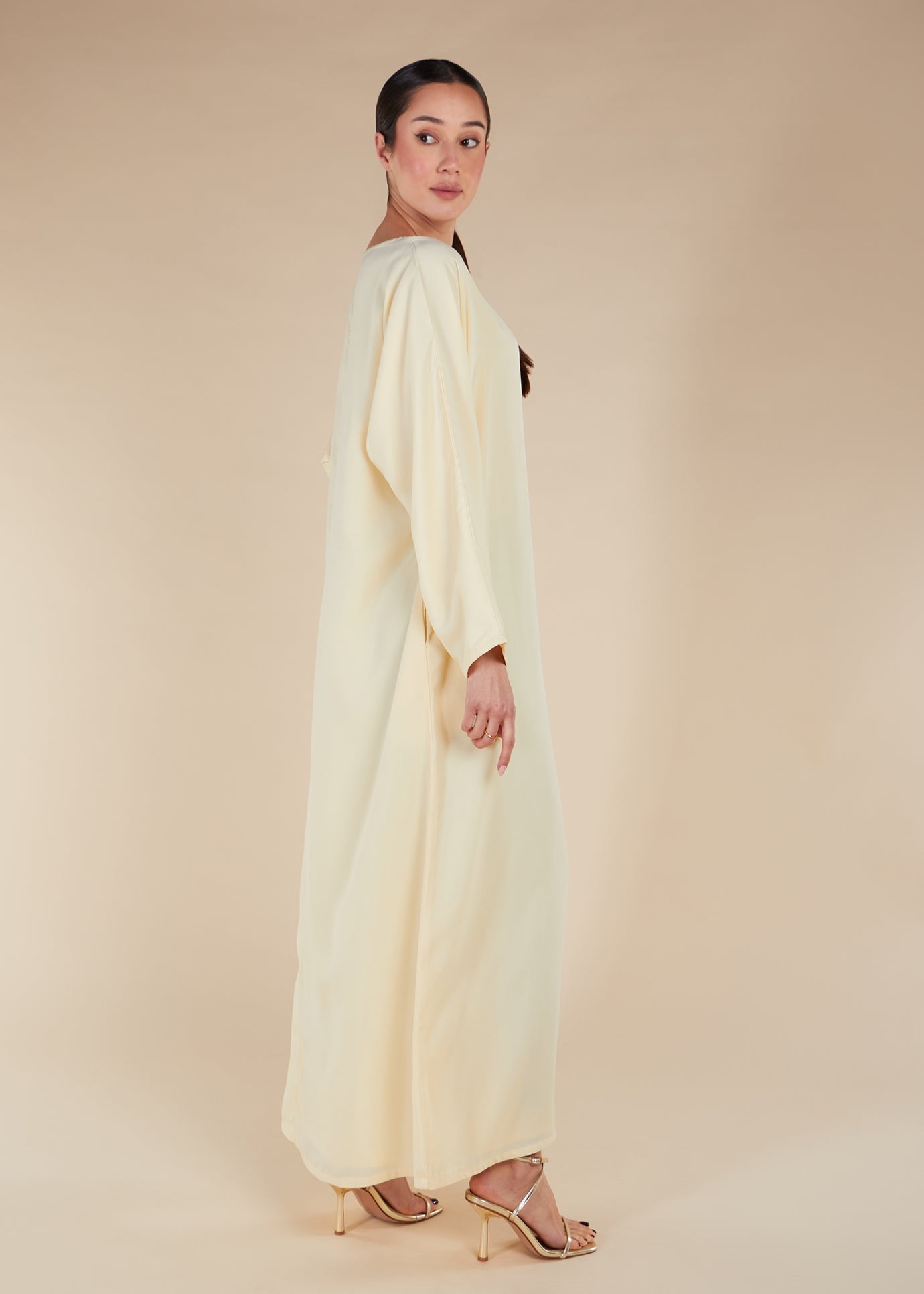 This Buttercream Abaya features a clean front seam at the front and back for a loose fit. It is made of lightweight materials and comes with a thin self-fabric belt for waist-cinching. Perfect for a casual look and comfortable feel, this abaya won't weigh you down.