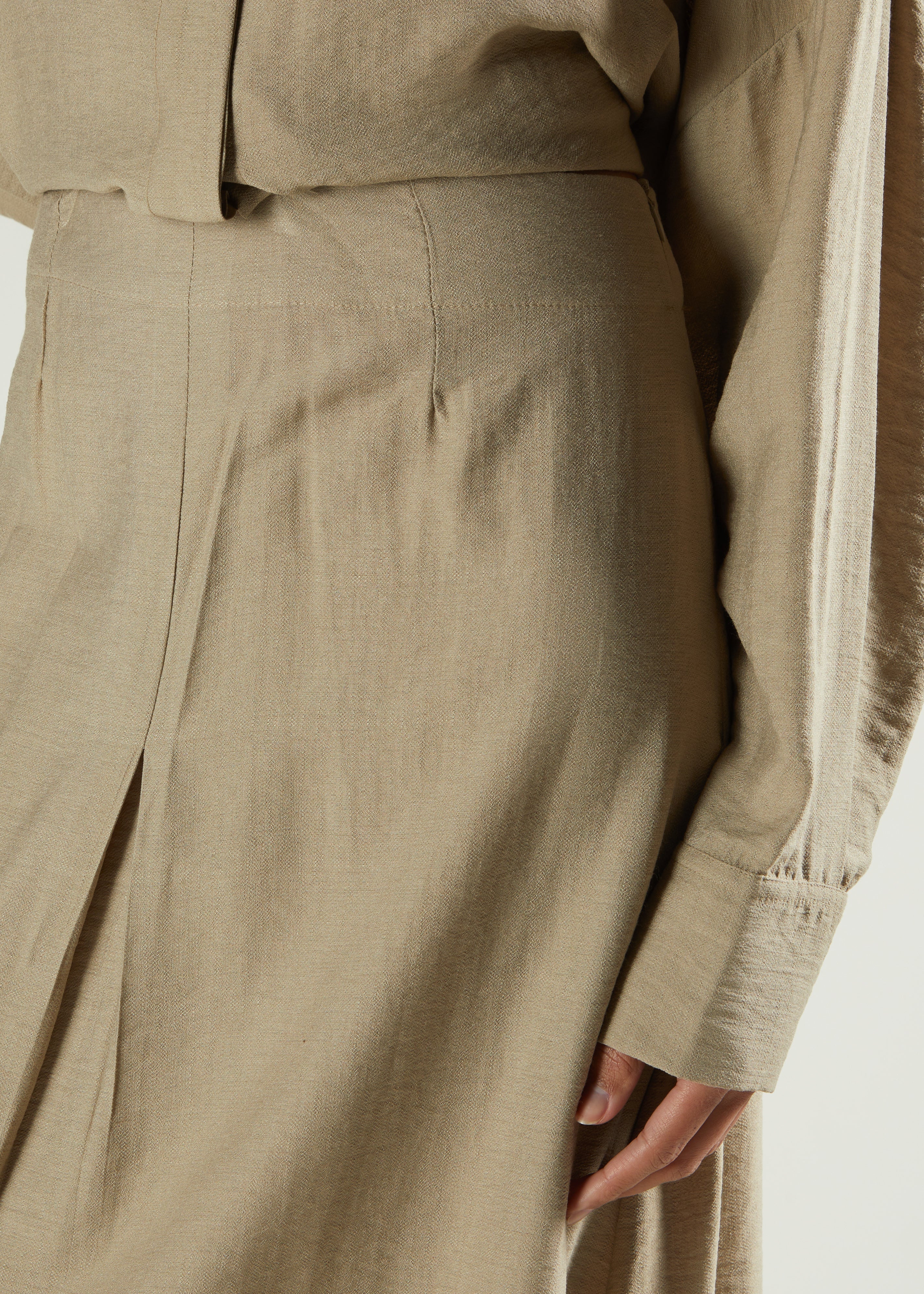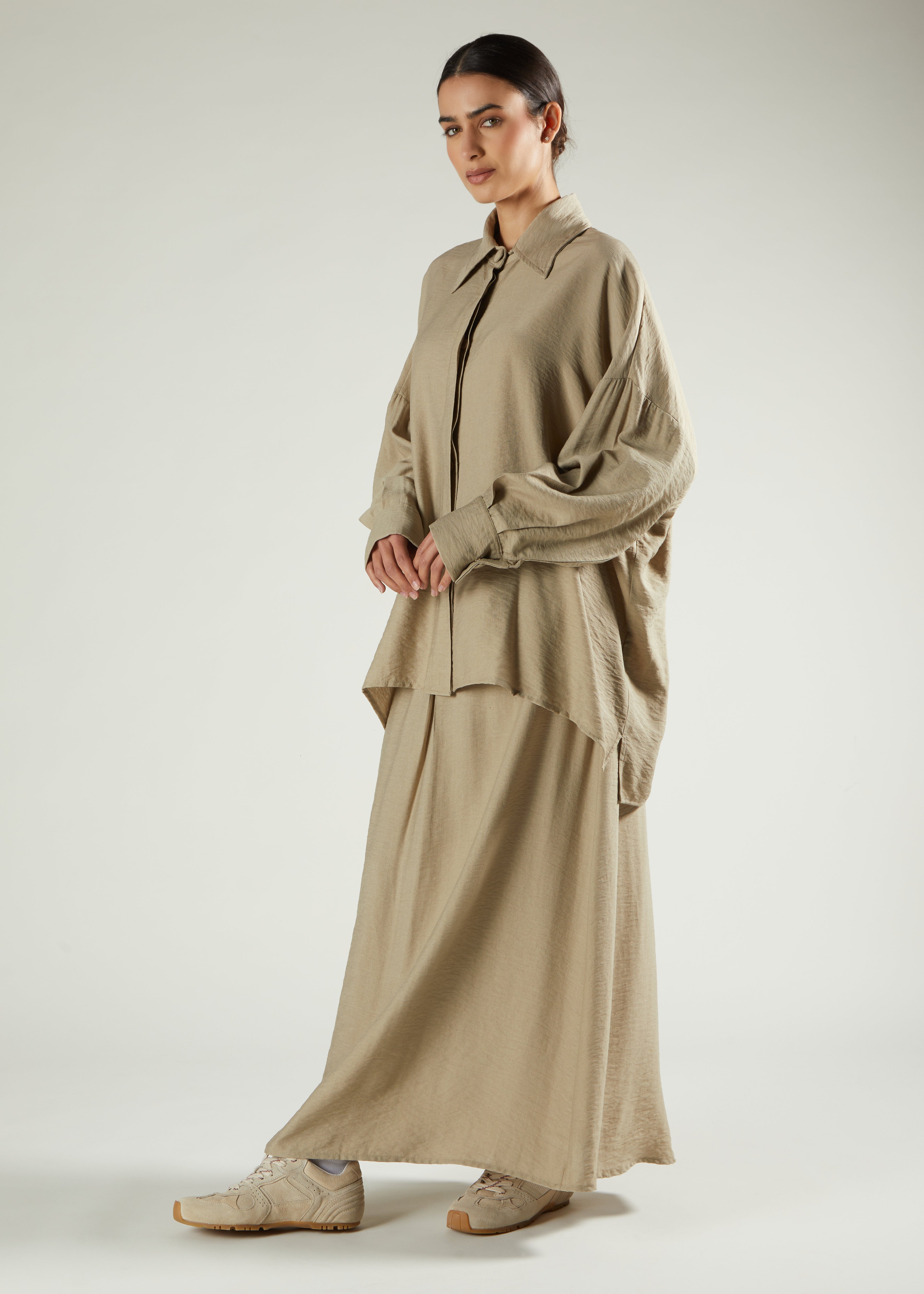 This casual co-ord ensemble includes a skirt and top made from fluid fabric, tailored to offer a subtly oversized silhouette. The top features hidden buttons, while the skirt is designed with a mid-flare shape for a refined finish.