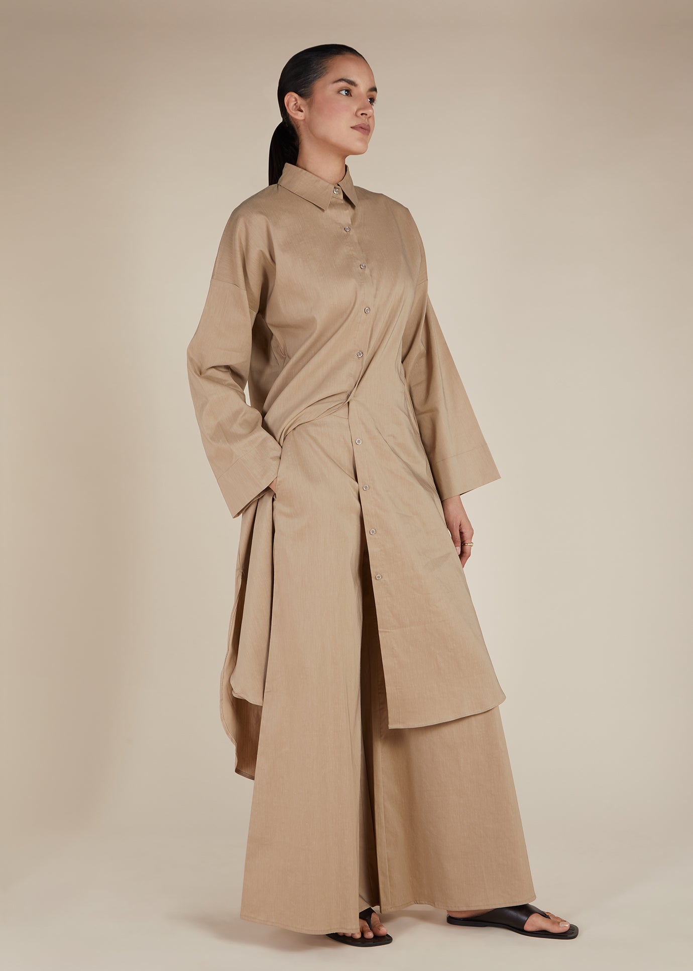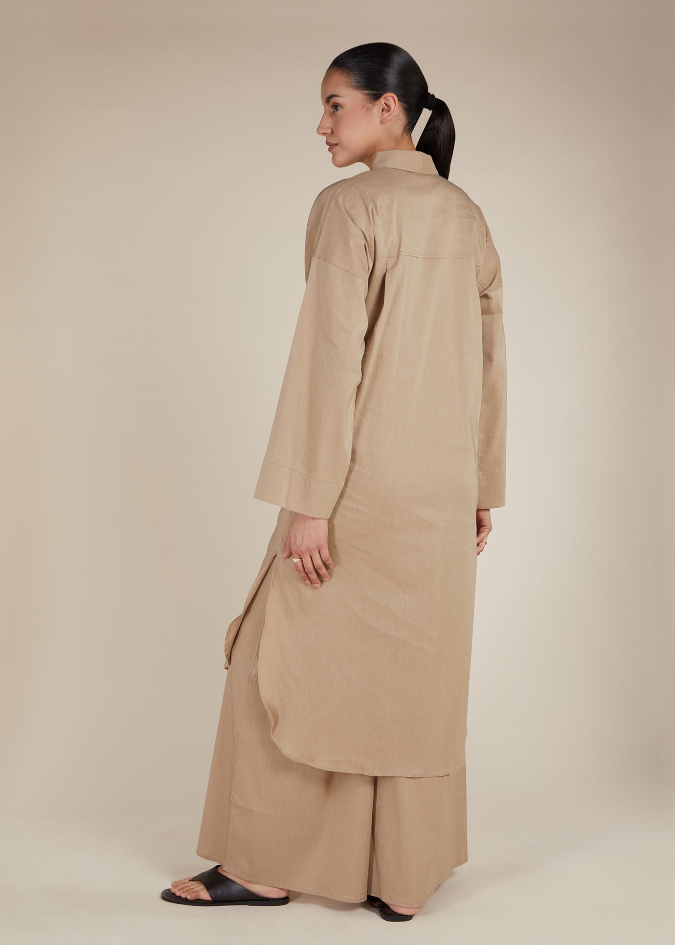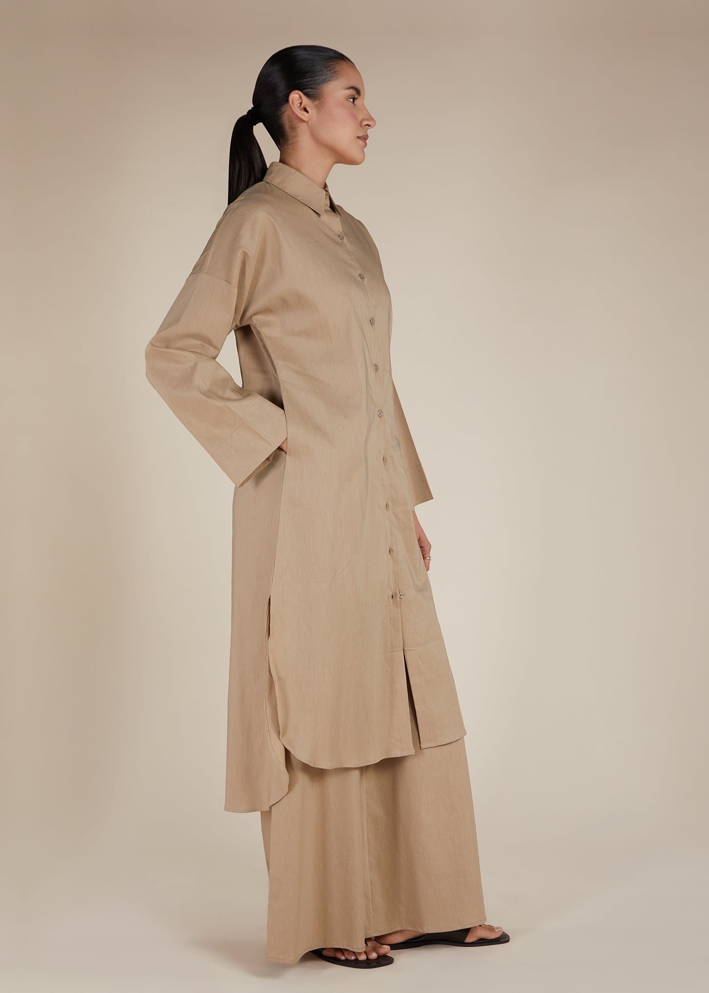 Made from breathable viscose in a versatile sandy hue, this Co-Ord Set features a relaxed silhouette ideal for summer wear. The trousers offer comfort with an elasticated waistband, while the shirt includes practical front button closure, convenient pockets, and refined cuffed sleeves.