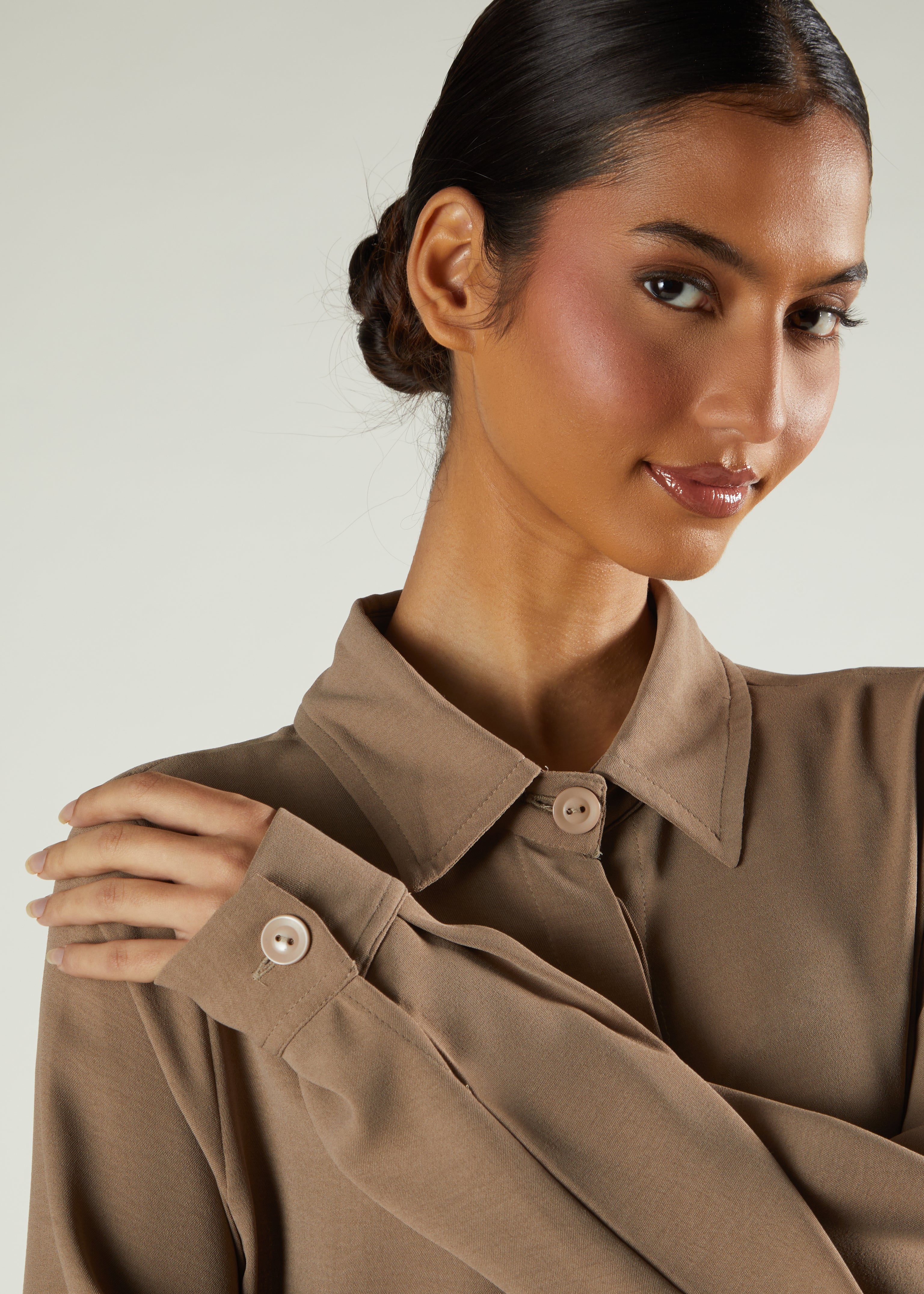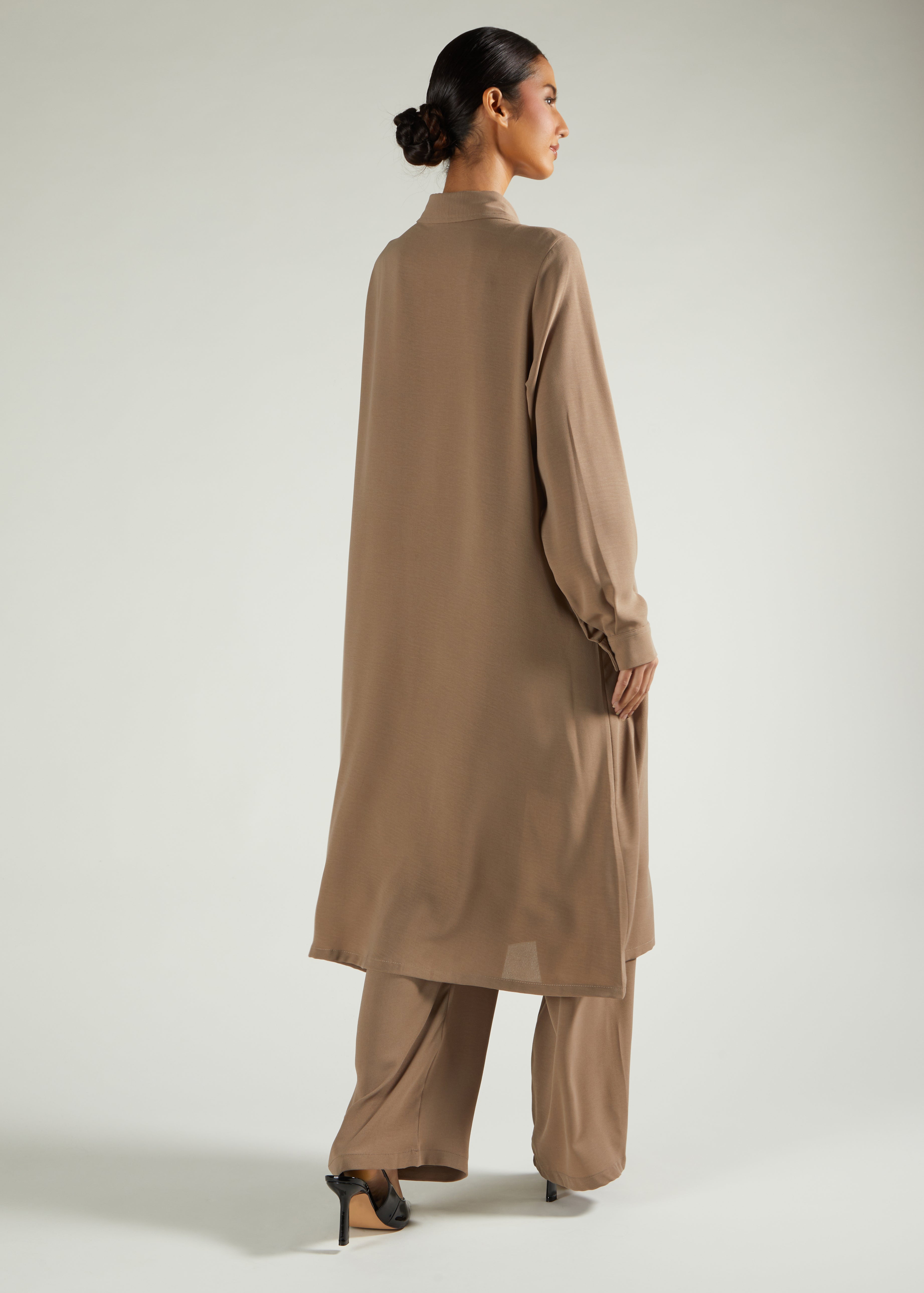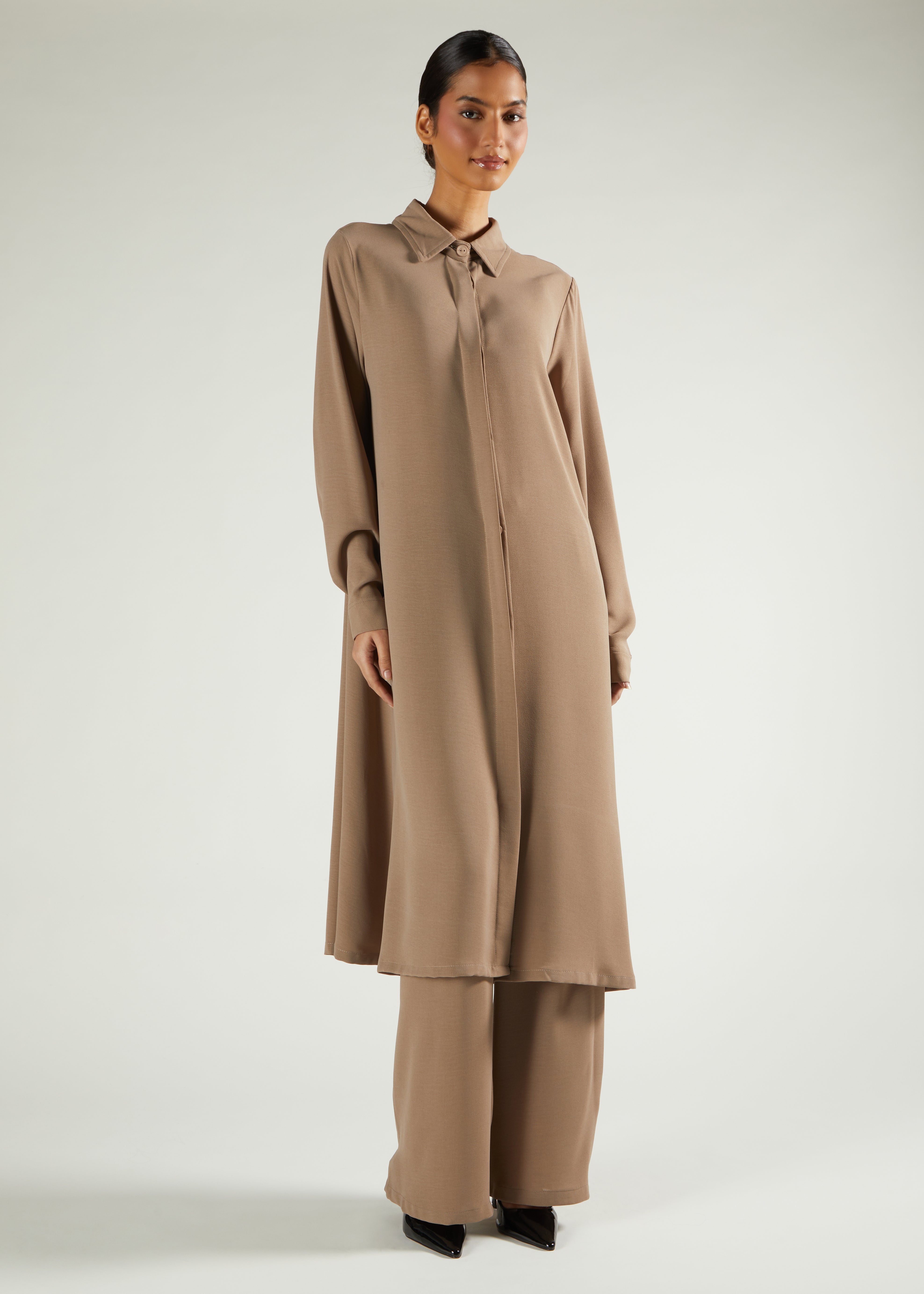 This versatile co-ord set combines a relaxed-fit shirt with mid-flare trousers in carefully curated seasonal hues. The modest proportions and generous cut allow effortless layering, making it an excellent foundation piece for transitional dressing. Designed to work seamlessly with outerwear or paired with our Second Skin collection for added warmth and dimension. Choose from three colour options that complement any seasonal wardrobe.