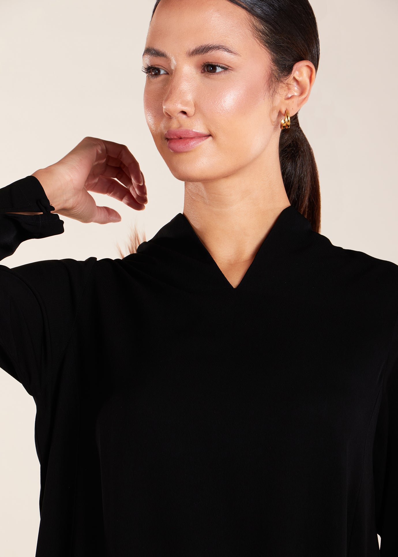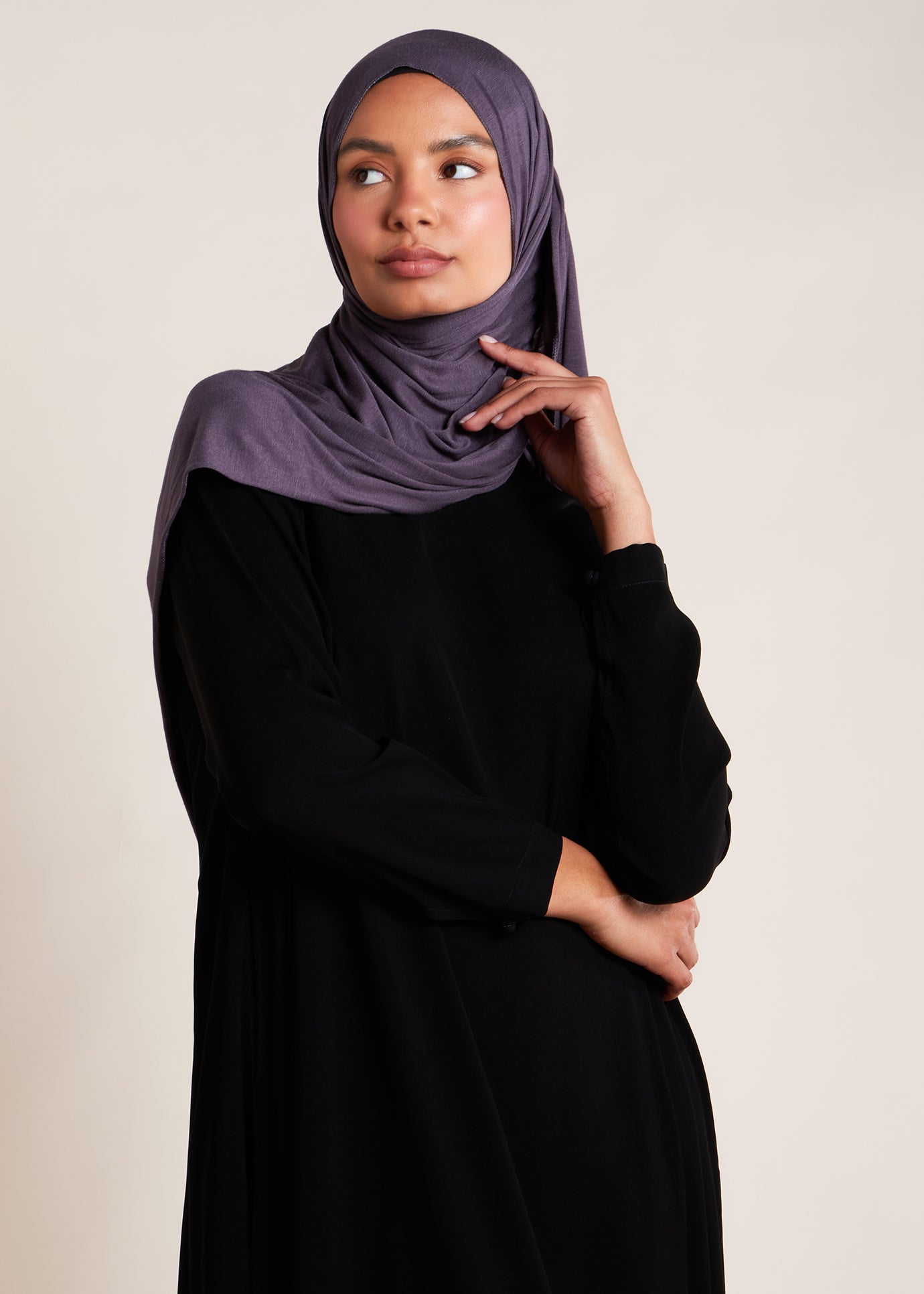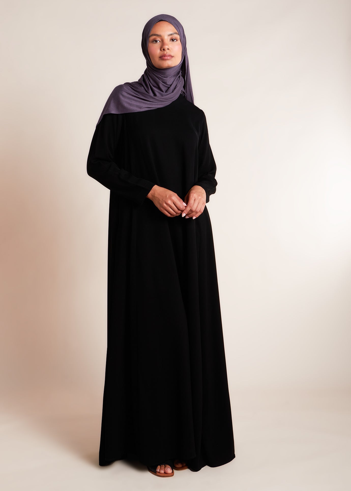 Crafted from a luxurious, textured fabric, this abaya boasts a figure-flattering silhouette that is both crease-free and versatile for all body shapes. With a slightly fitted upper bodice and flowing waist down, the raised neck line adds an elegant touch. The fabric also has a slight stretch, while self-fabric buttons on the cuffs add a touch of subtle sophistication.