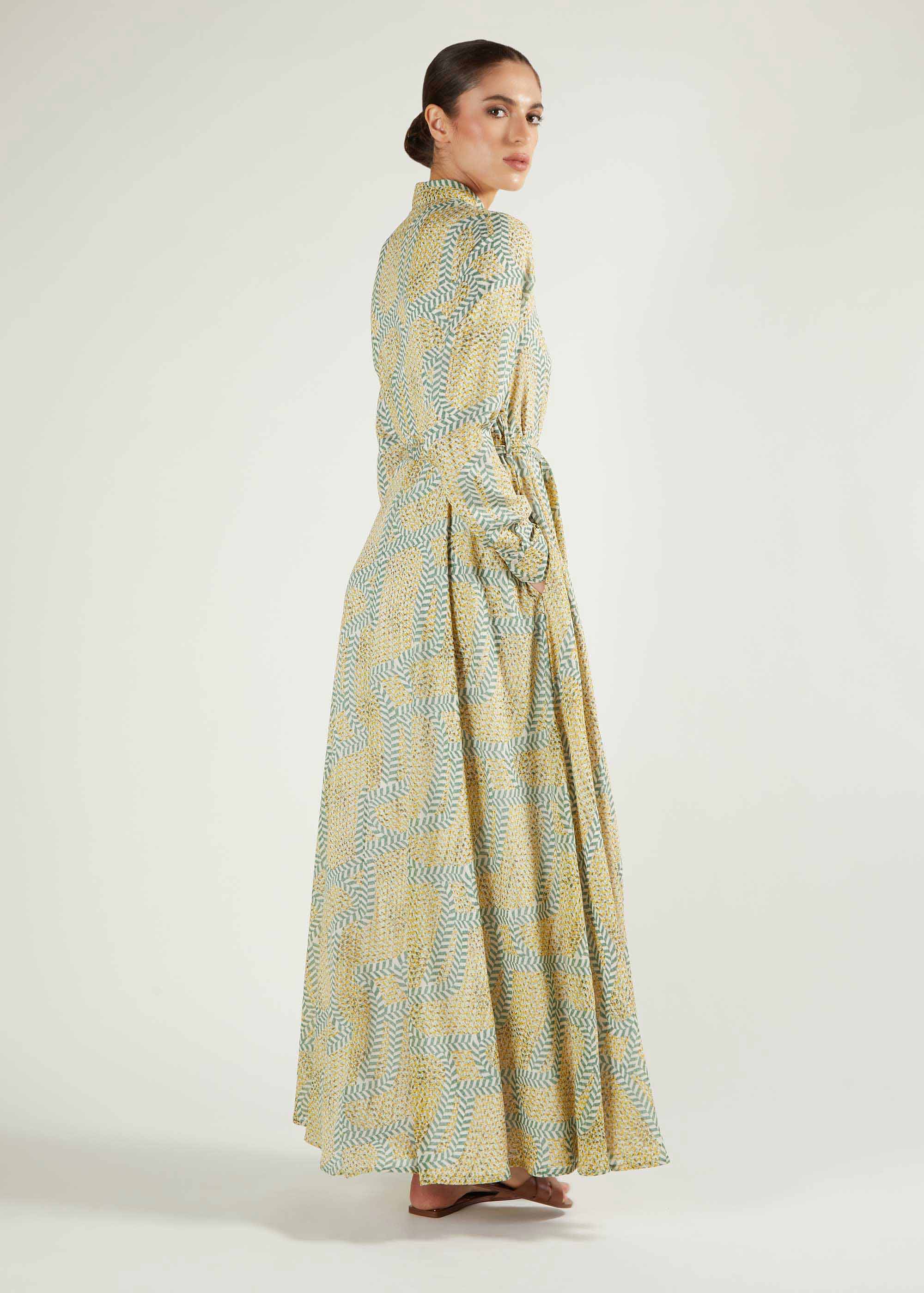 Introduce vibrant hues this season with the Como Maxi. It has a yellow and green pattern, designed as a long shirt dress with hidden buttons, subtle side pockets, and an optional belt to define the waist.