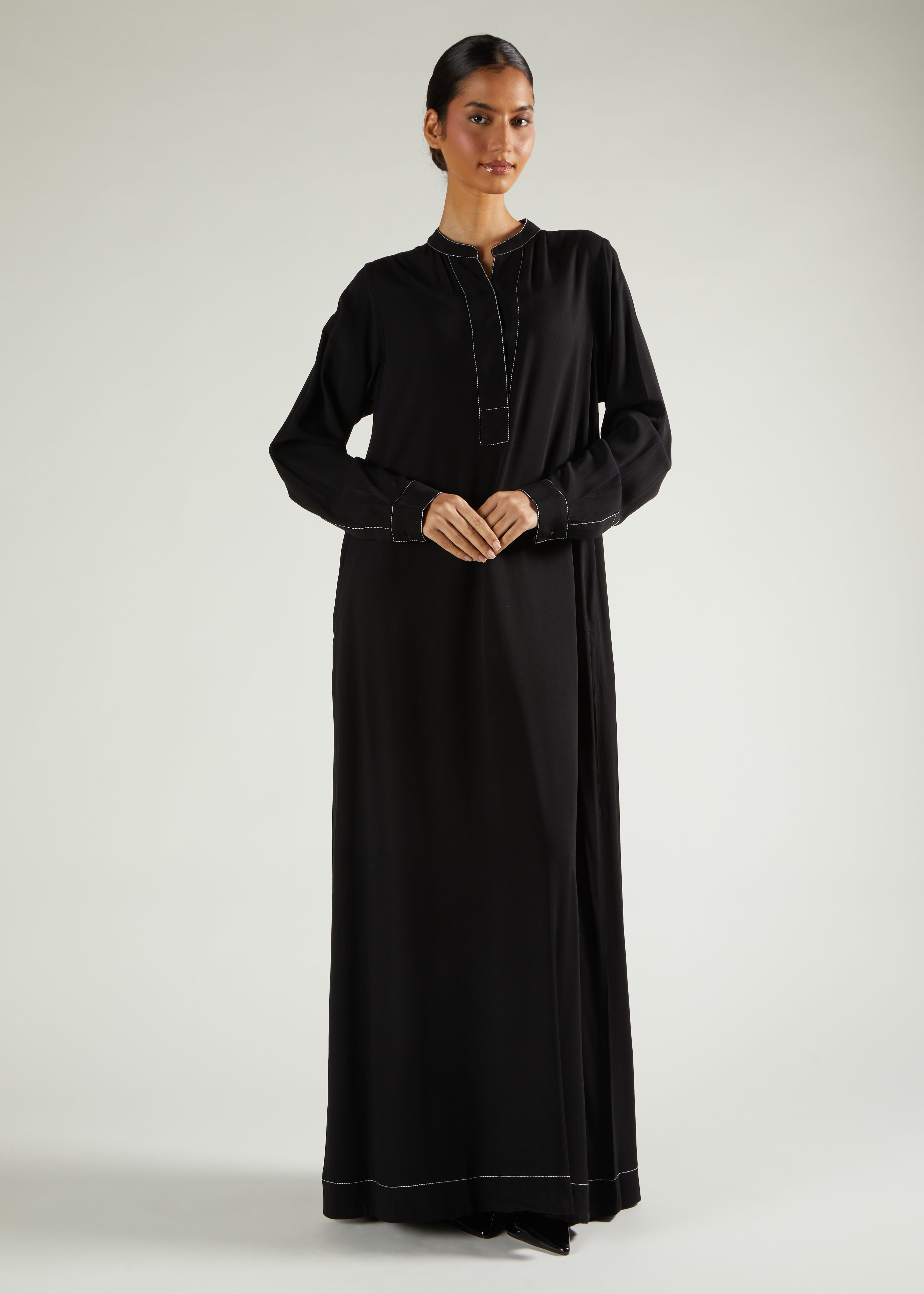 This abaya features a sleek contrast-coloured single line stitch along the front seam, cuffs, neckline and hemline, embodying refined simplicity and sophisticated elegance.