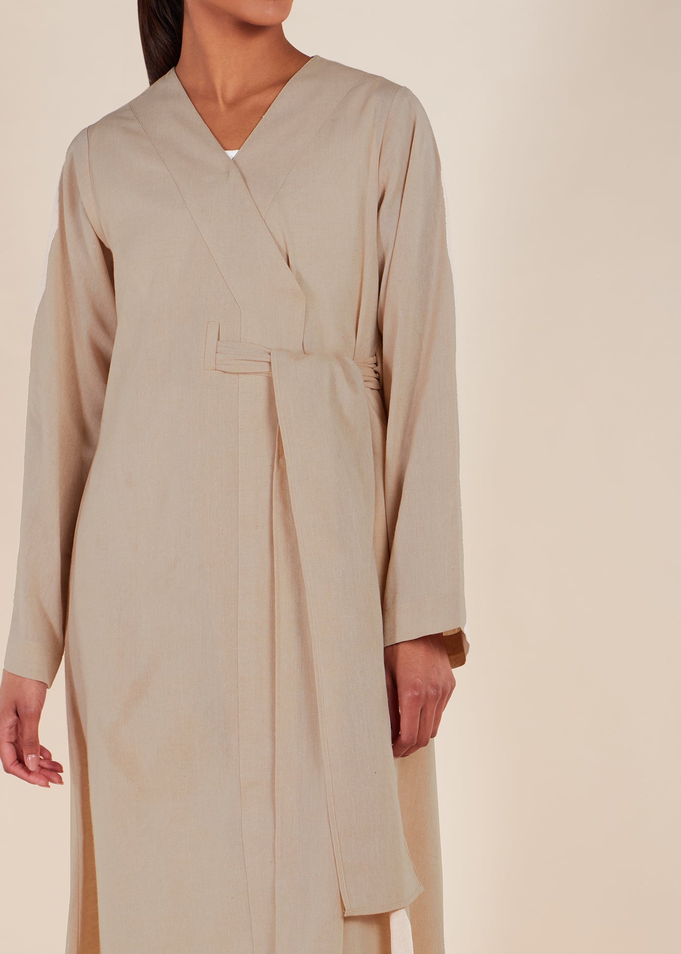 Made from lightweight cotton, this wrap abaya offers a clean, minimal silhouette with soft structure. Designed with a cross-over front and an attached sash at the waist, it allows for effortless shaping and adjustable coverage. The abaya falls fluidly to the floor, finished with a straight hem, long sleeves, and discreet in-seam pockets for a practical touch.