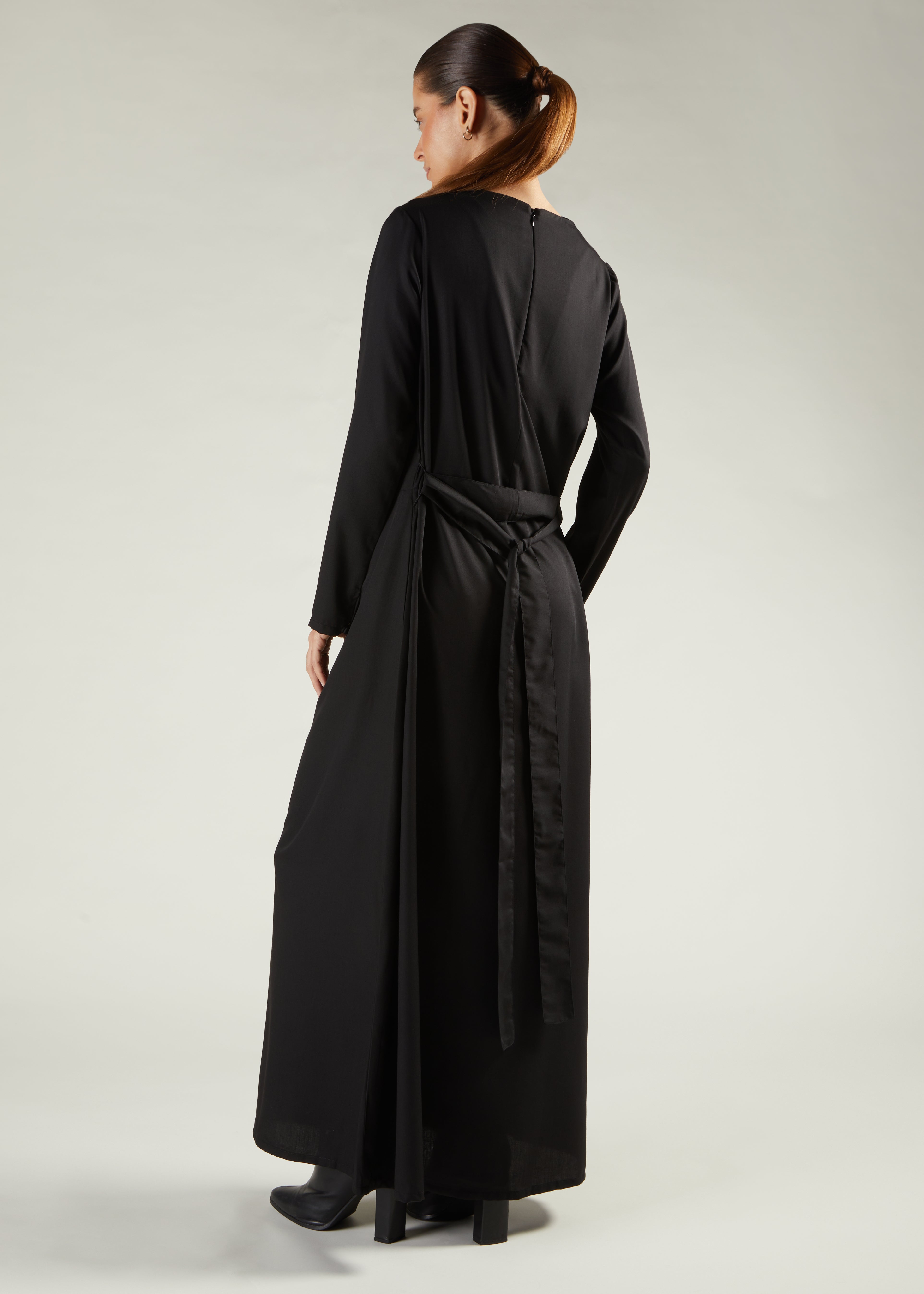 The timeless Cowl Neck Abaya is an essential addition to any wardrobe, featuring a sleek, slim fit made from soft twill fabric. It includes a matching fabric belt to accentuate the waist as desired. Ideal for formal events, this abaya can be effortlessly enhanced with statement accessories to create a refined look.