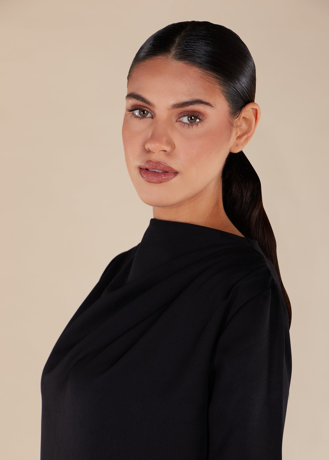The Cowl Neck Midi Black has a soft cowl neck and a chic silhouette, making it the perfect choice for a fluid, modest look from desk to dinner. Pair it with our flared trousers to complete the ensemble.