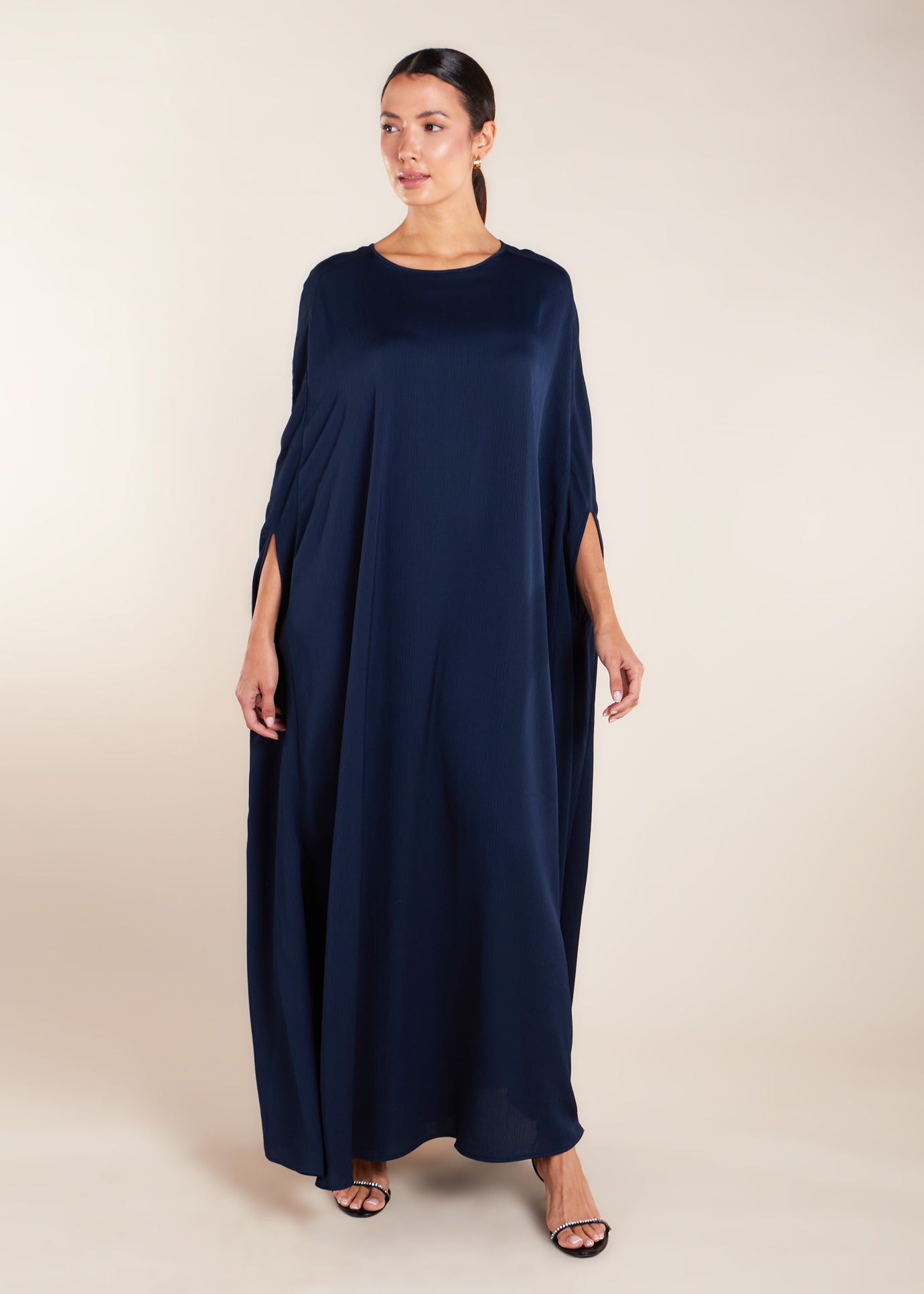 Add a touch of elegance to your wardrobe with our Crinkled Kaftan Navy. Made from a lightweight soft crinkle non-crease fabric, this gown is perfect for warmer weather.