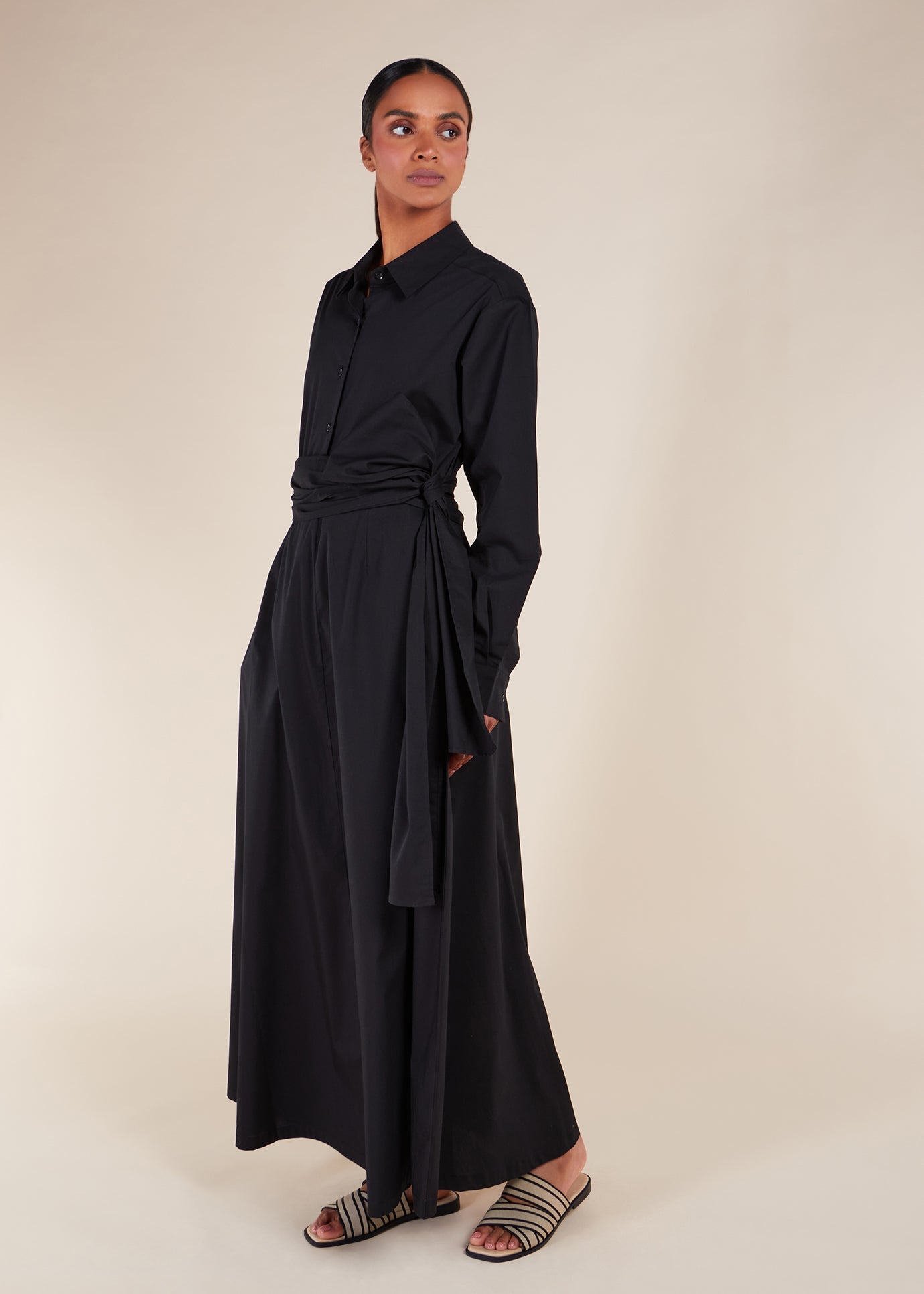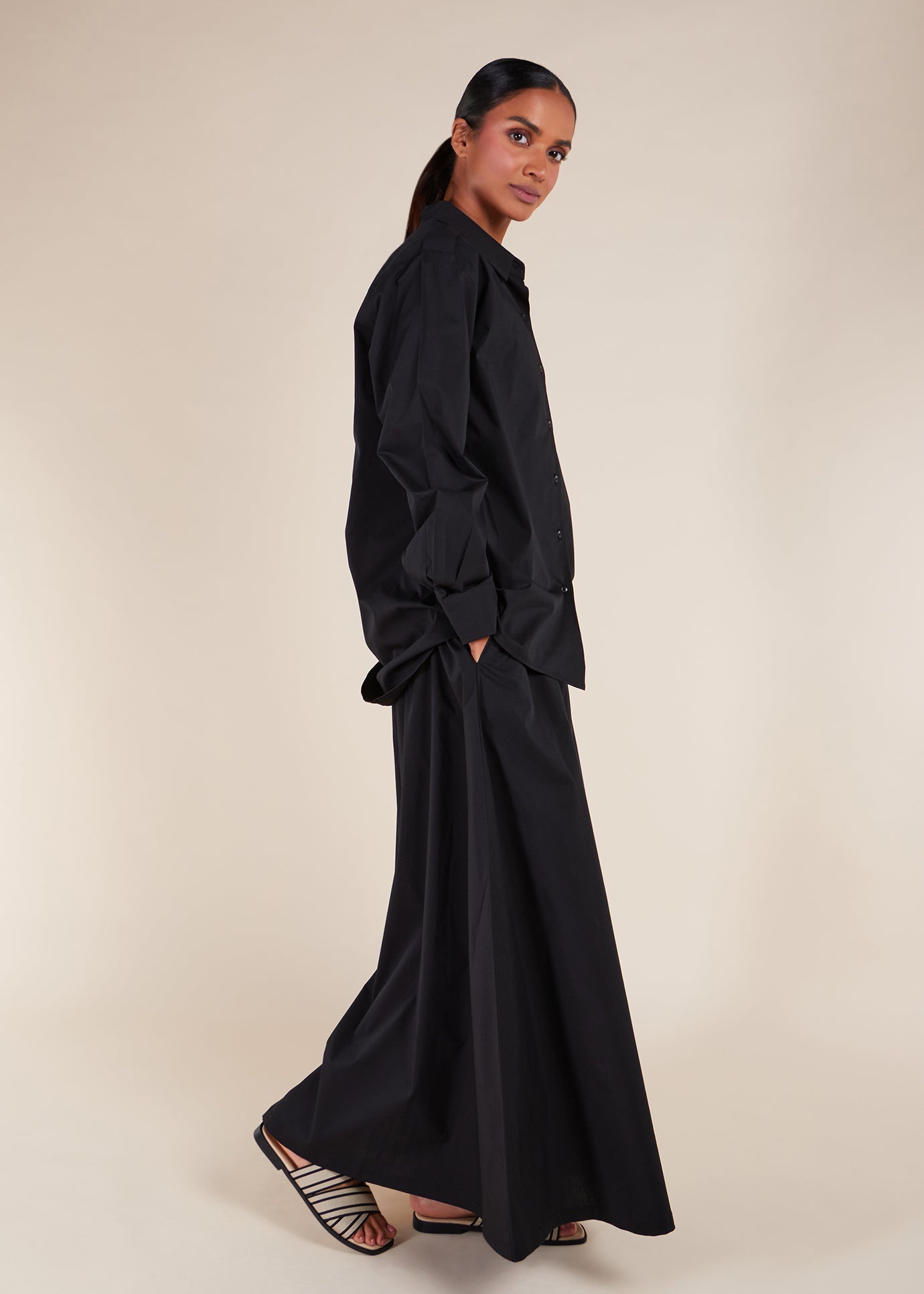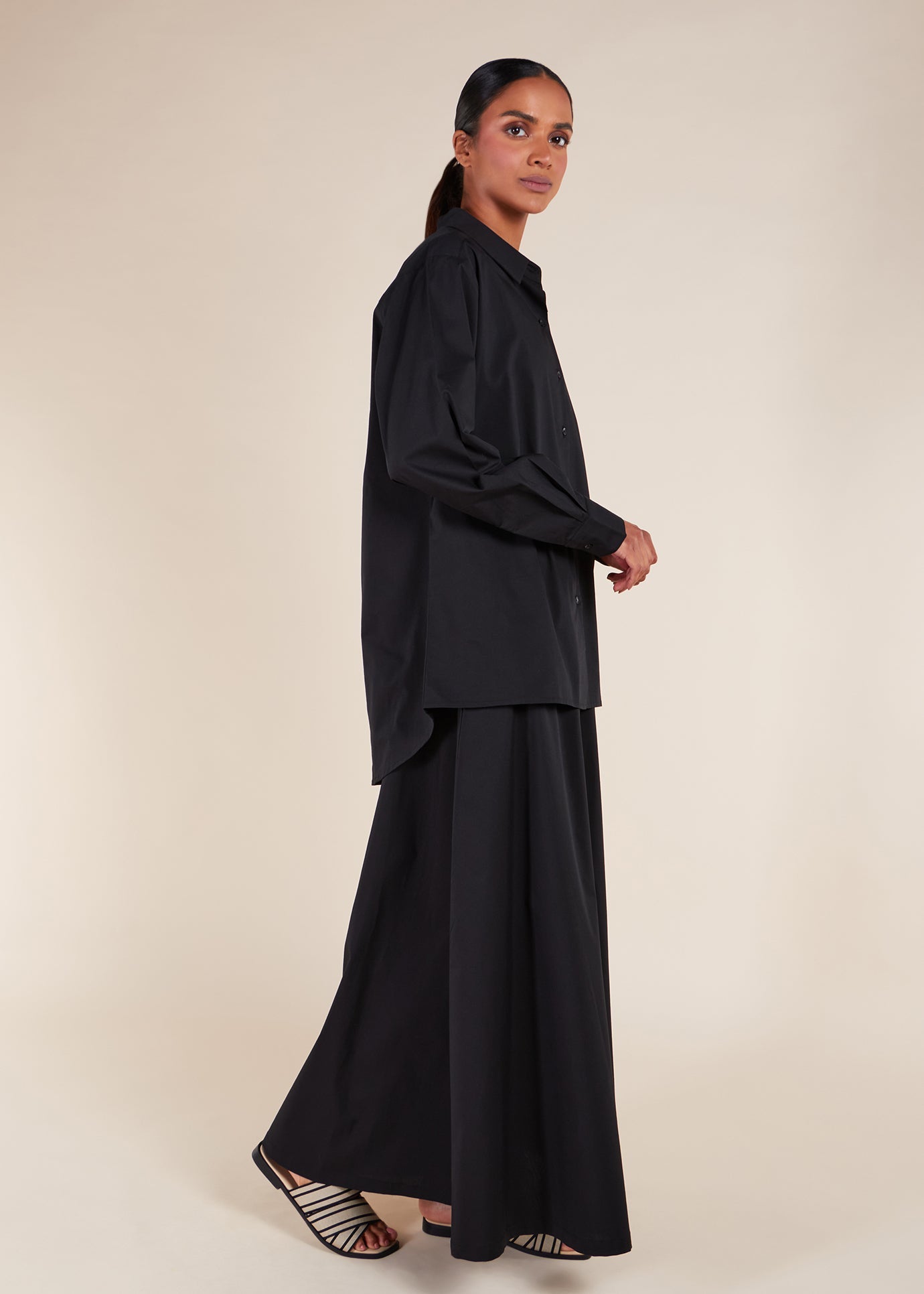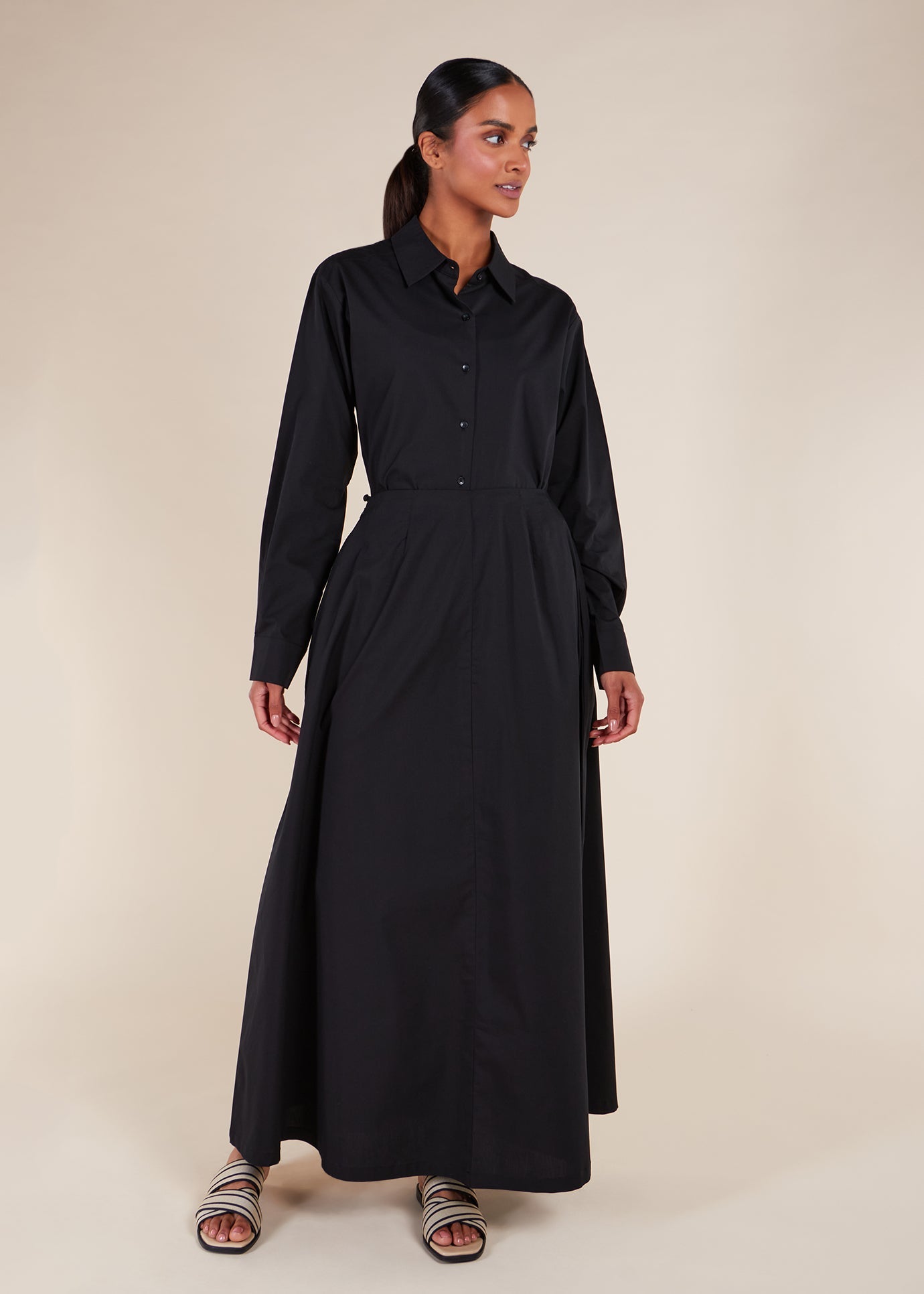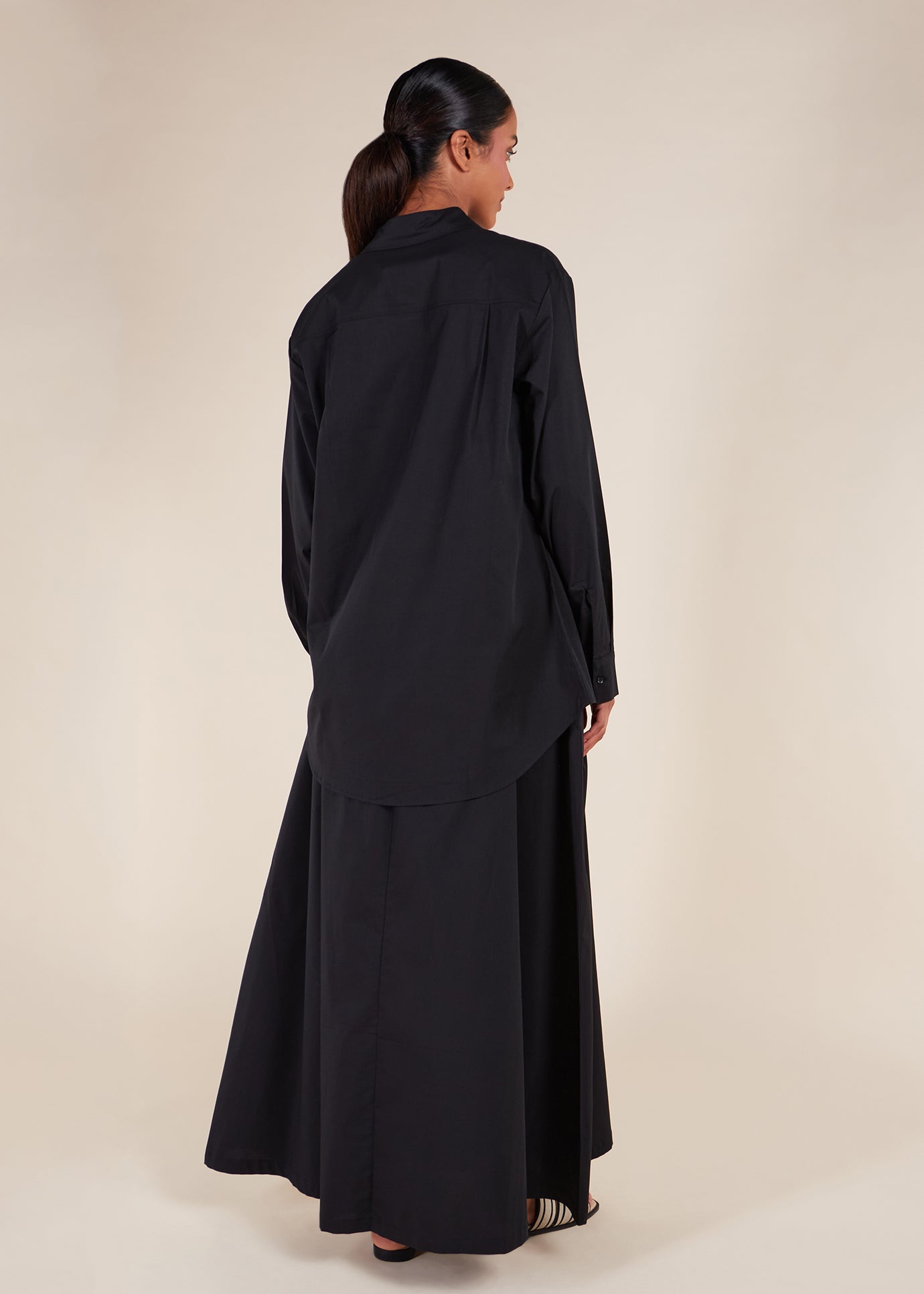 Made from cotton poplin, this cropped shirt is ideal for summer and transitional seasons. Its length provides modest coverage and complements the matching skirt effortlessly. Featuring a loose, modest fit, we recommend selecting your usual regular size. The shirt cuffed sleeves add a tailored structure to the design.