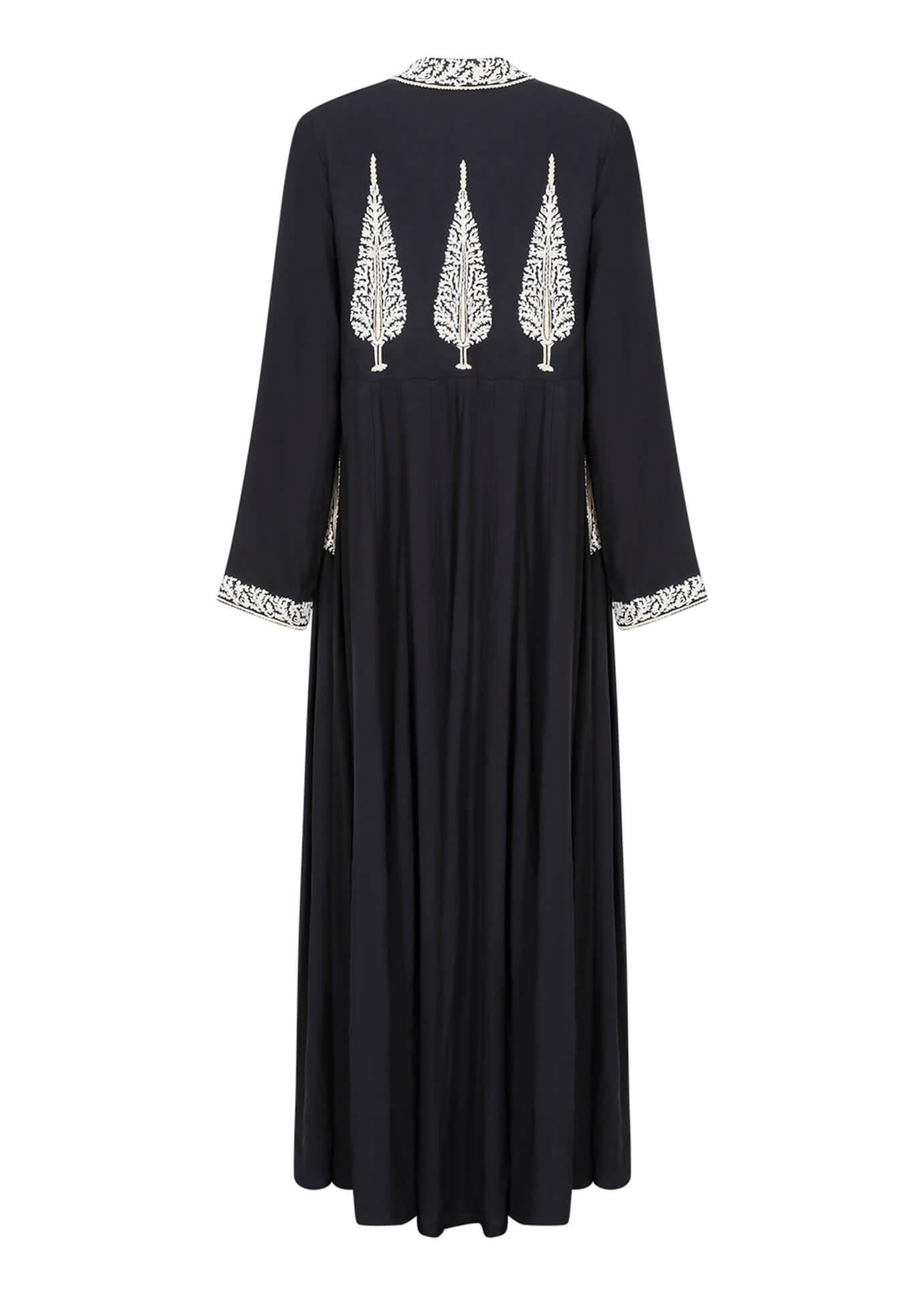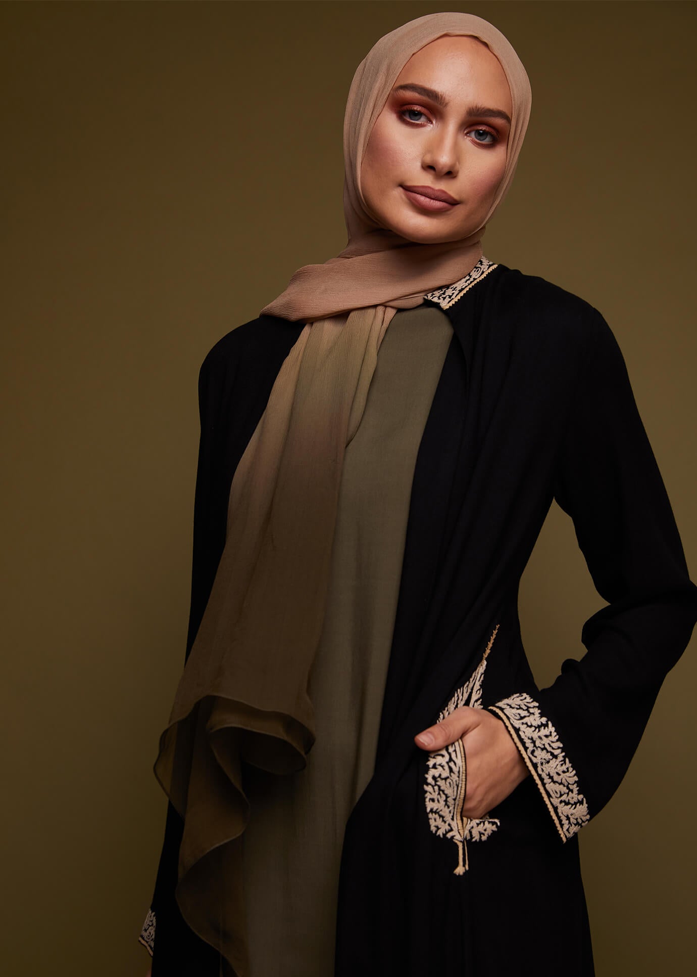 This open Abaya detailed embroidery on the collars, pockets, sleeves, and back, making it a stunning option for any event. Complete your ensemble by pairing it with one of our slips.
