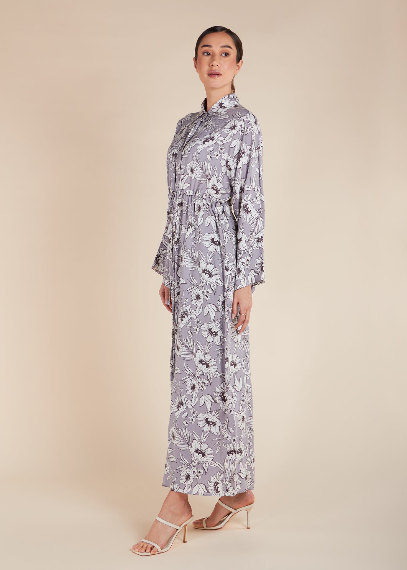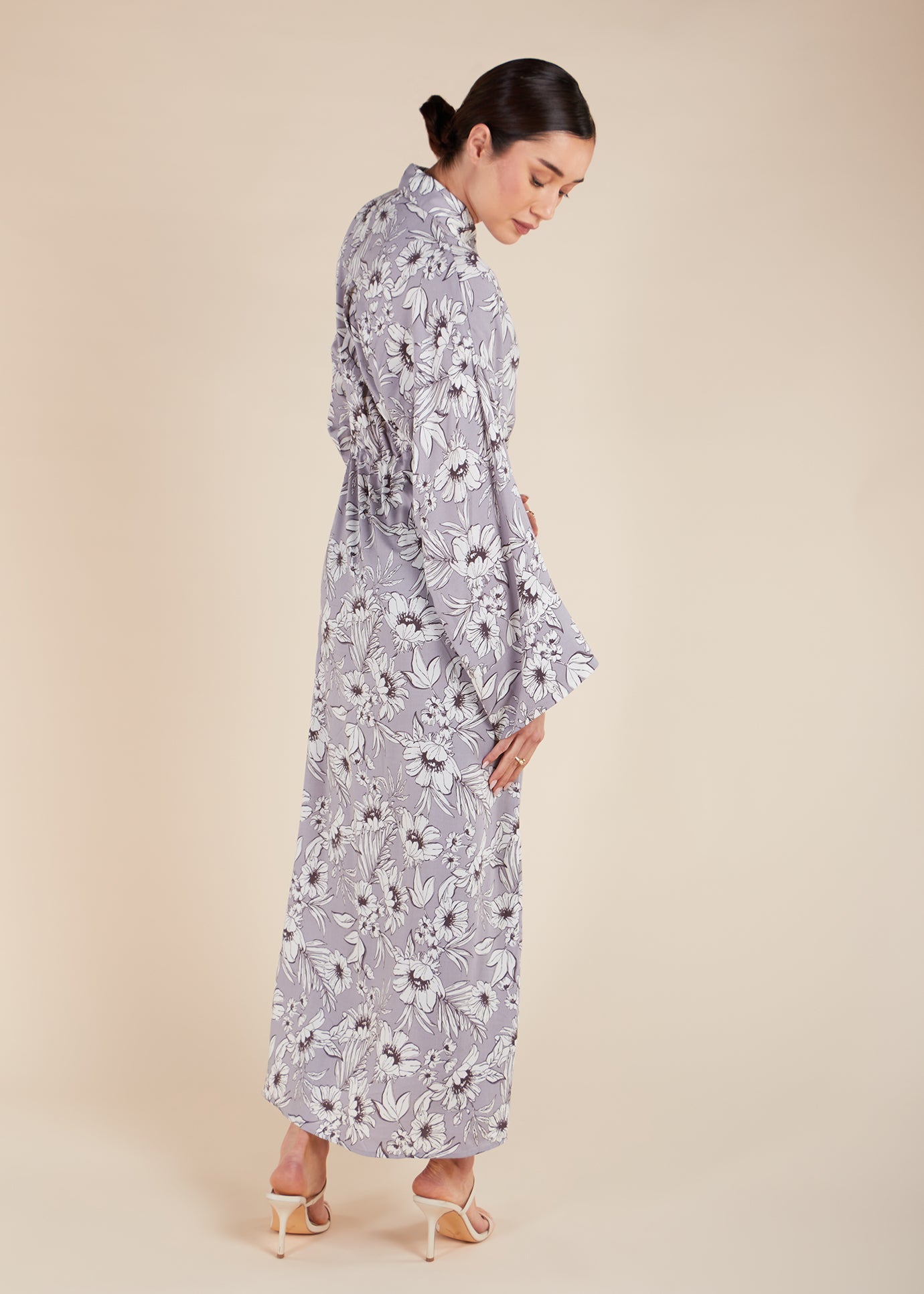 A bold floral print contrasts against a mauve tone in the Dahlia Maxi Dress, featuring a straight cut with loose upper body and sleeves. The built-in drawcord allows you to define your waist, while a button opening and wide sleeves add a touch of elegance.