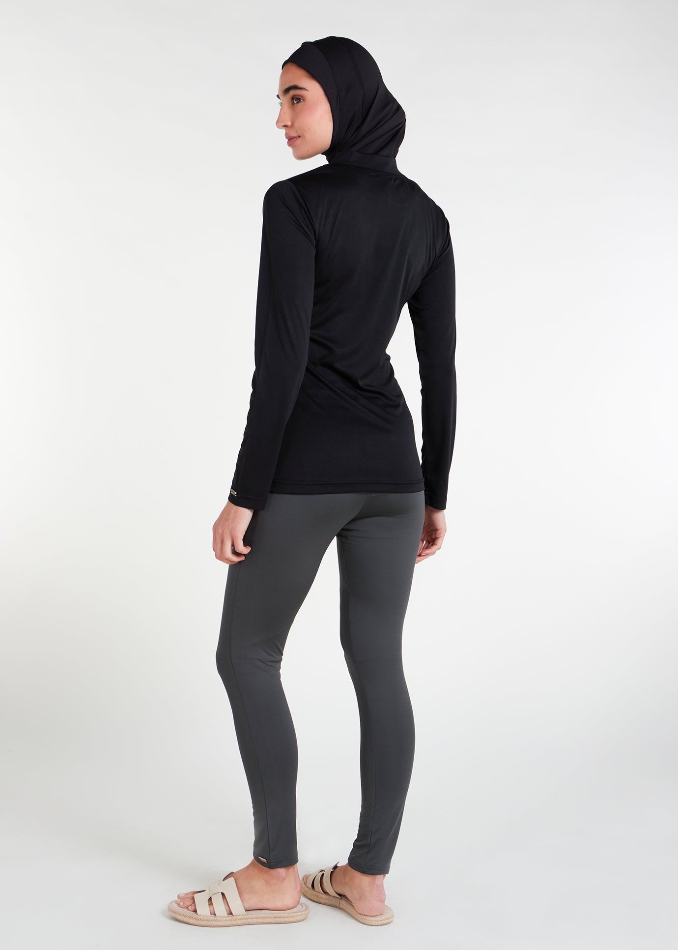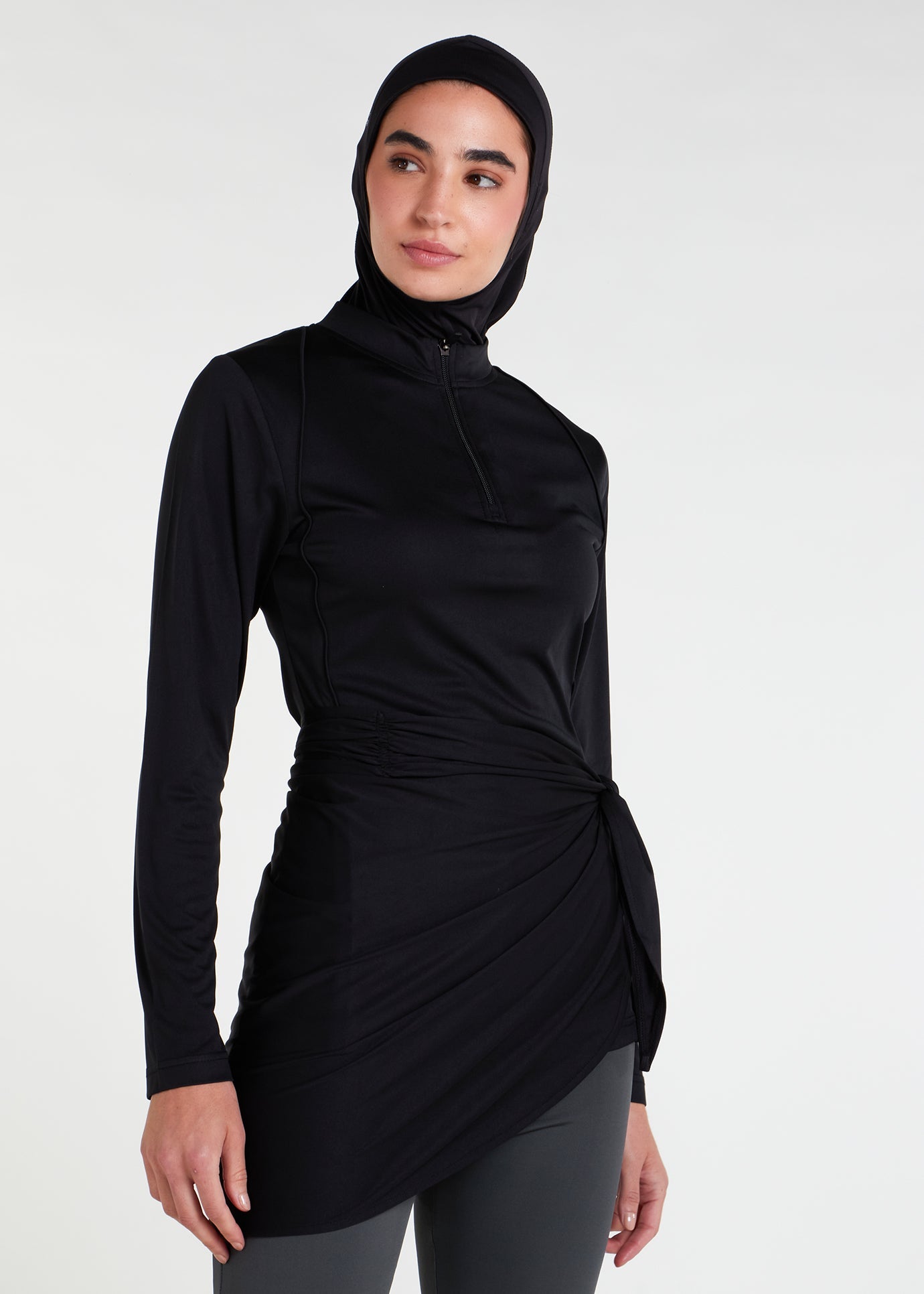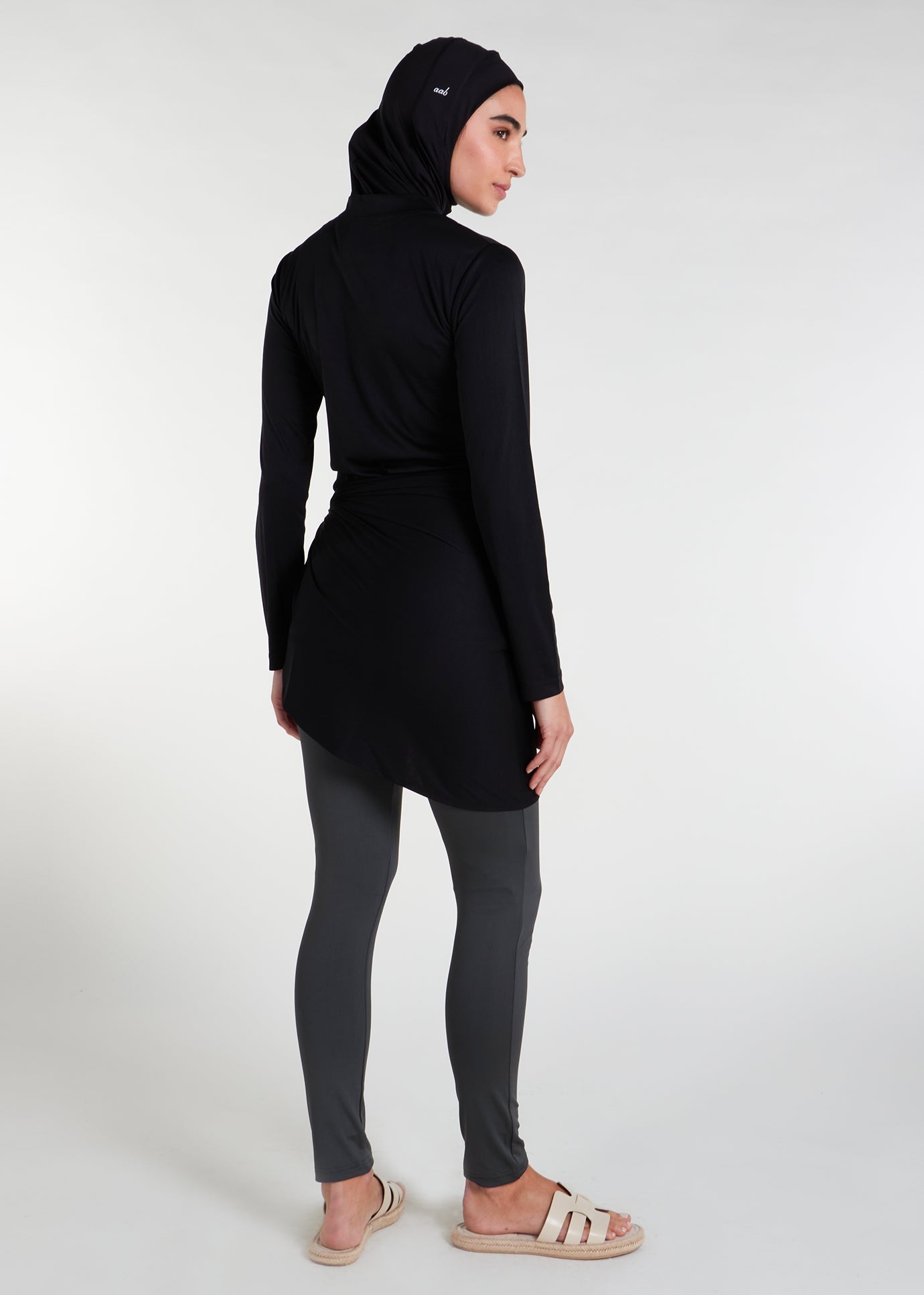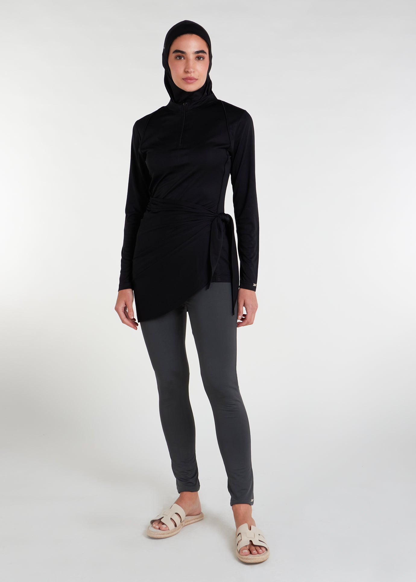 Introducing our Detach Wrap Swim Top Black, a shorter swim top featuring a detachable wrap with a button detail for added coverage. The top also comes with an inner tie for securing to the matching swim bottoms (sold separately).