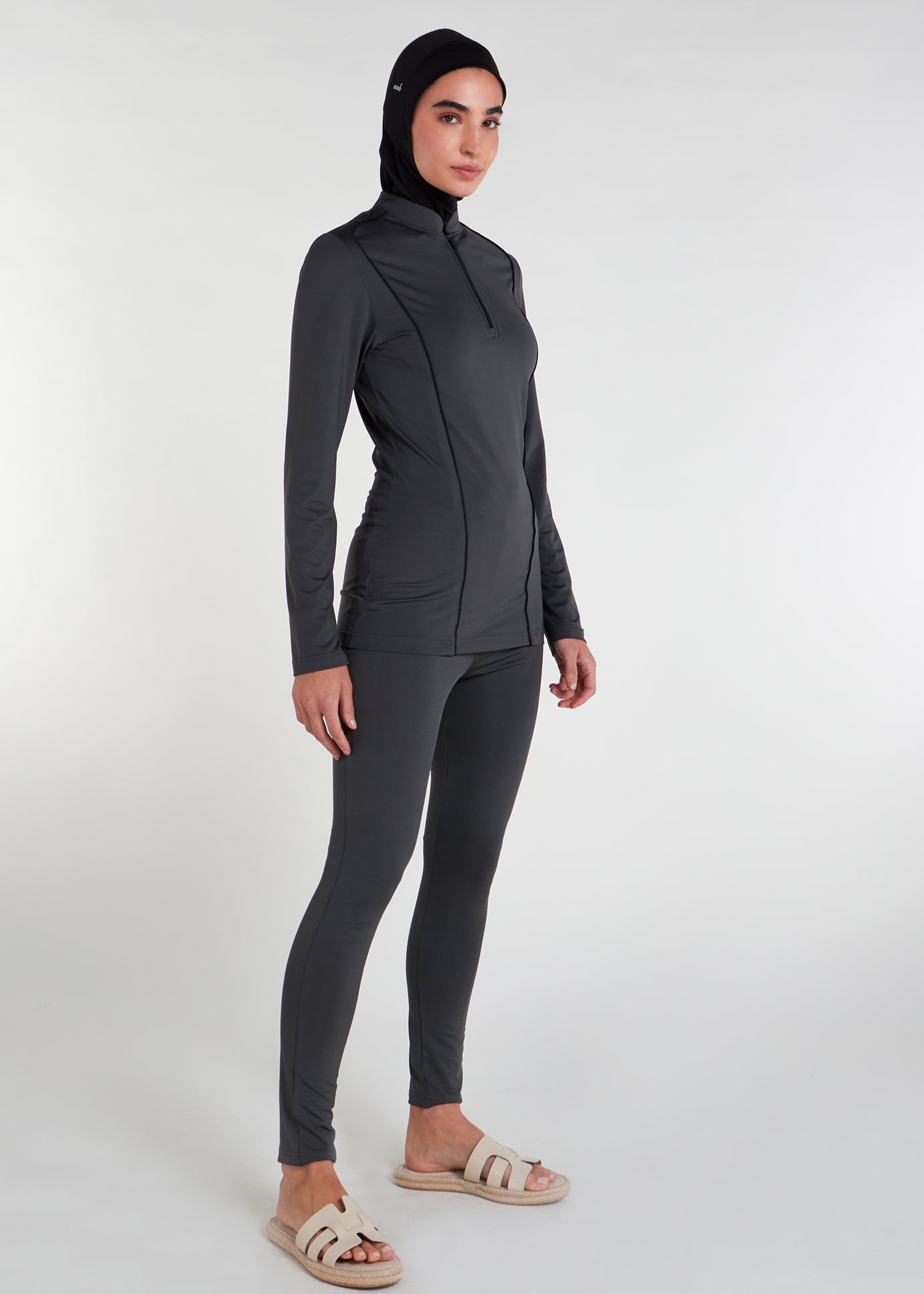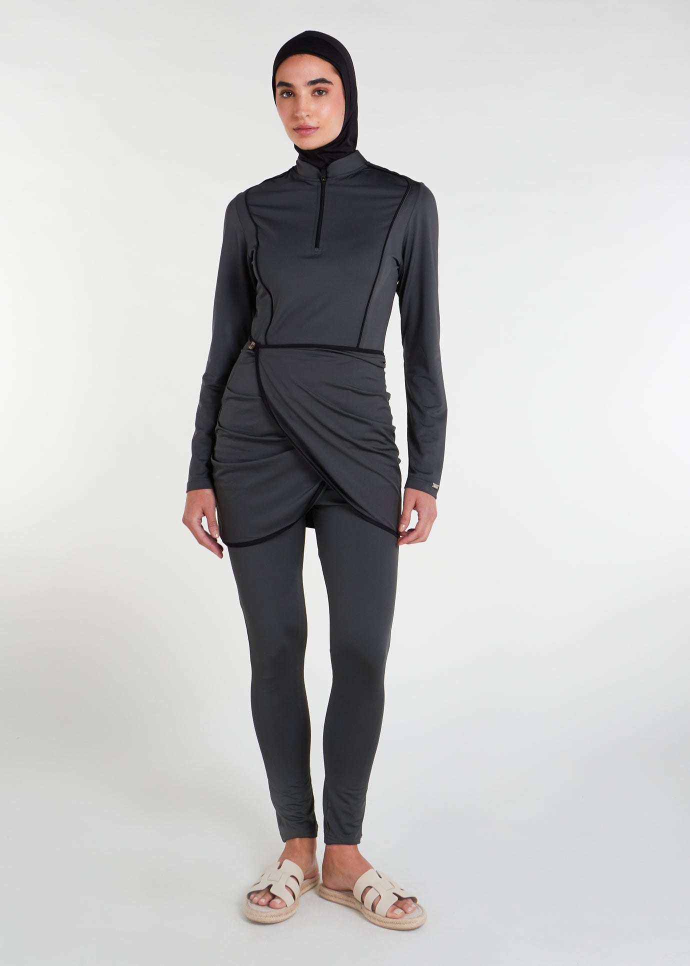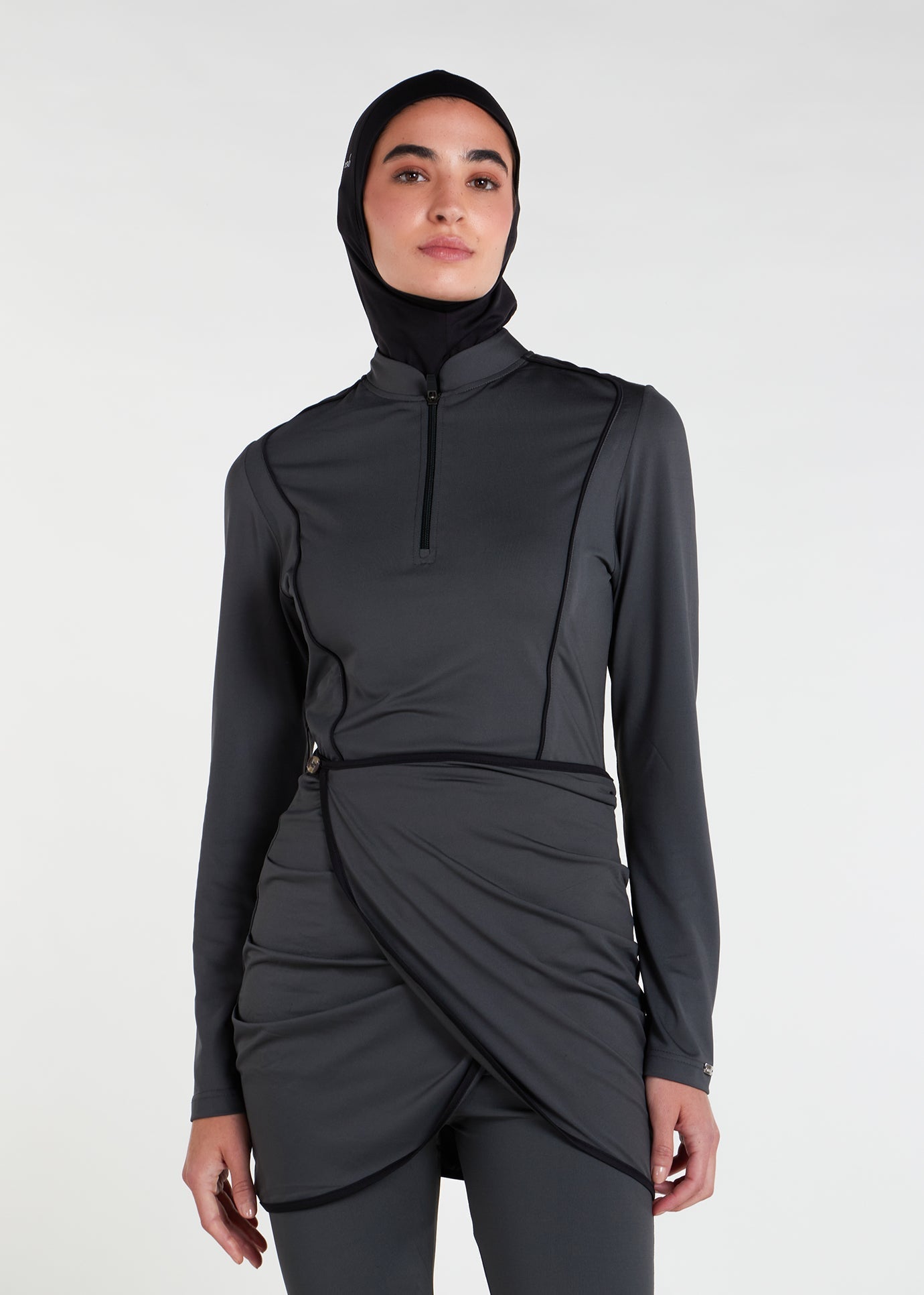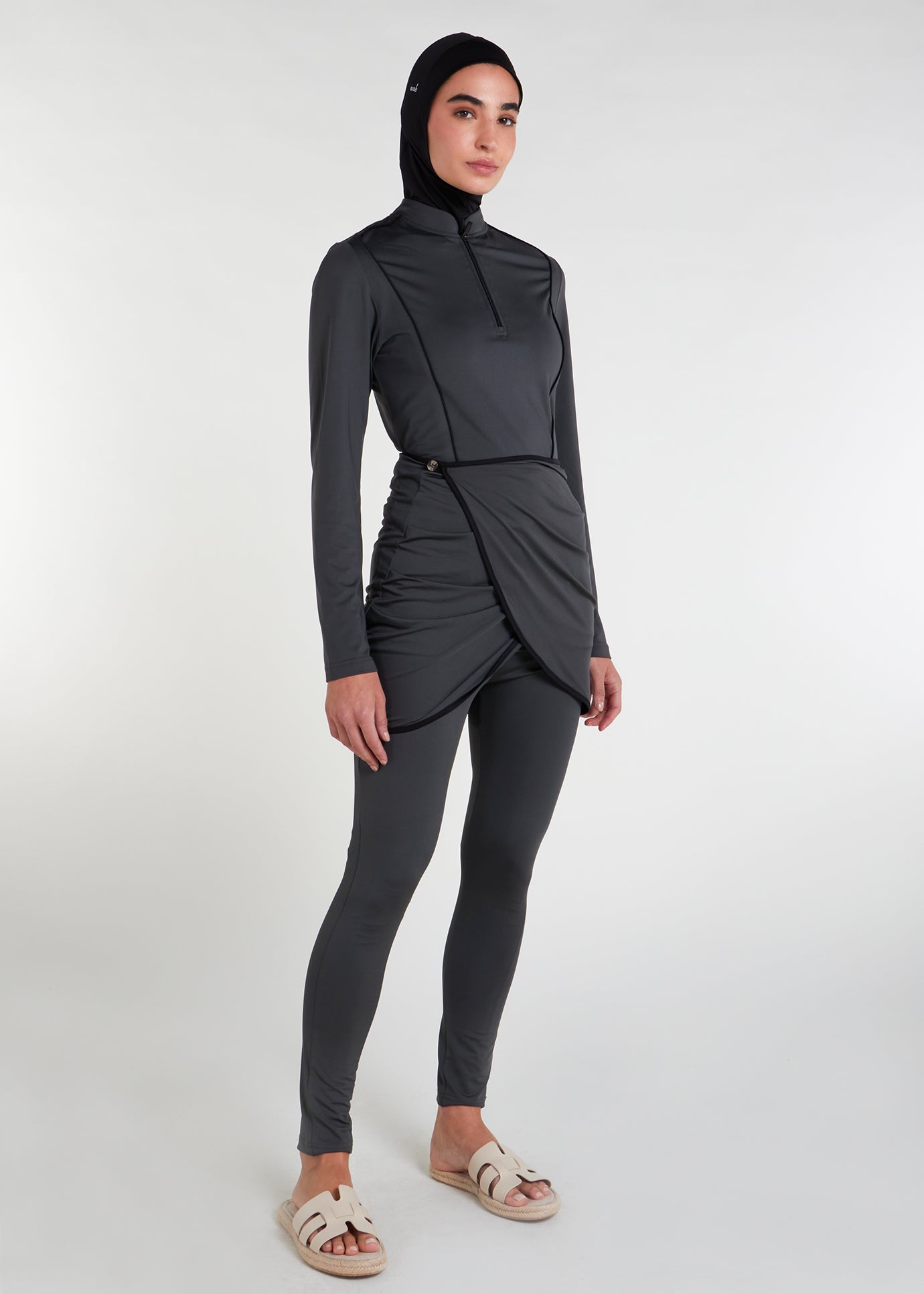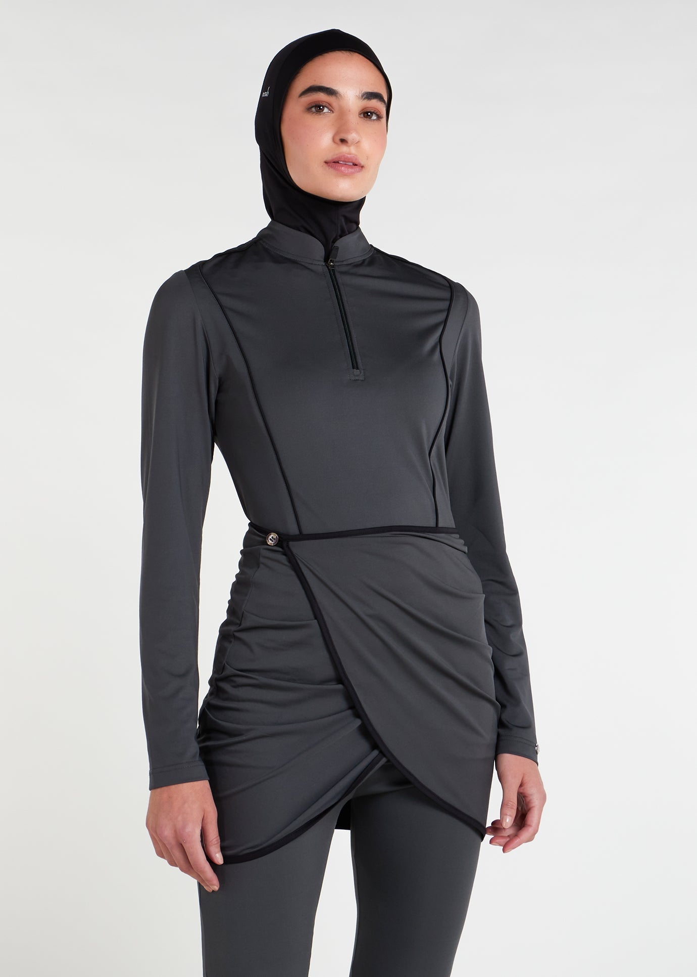 Our swimwear collection now includes a shorter swim top that comes with a detachable wrap and can be buttoned up for more coverage. In addition, the top is equipped with an inner tie that can be connected to our swim bottoms (sold separately).