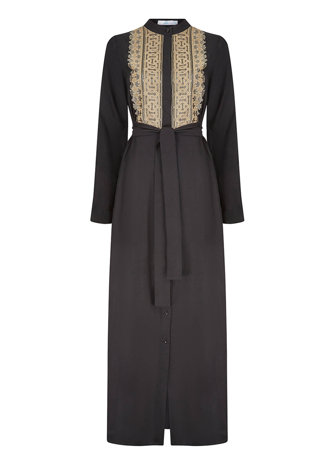 This abaya is cut in a Slim A-line silhouette and features a mandarin neck collar as well as geometric patterns that are embroidered in gold across the bodice. The geometric design is inspired by Islamic Architecture and features pockets and detachable belt.