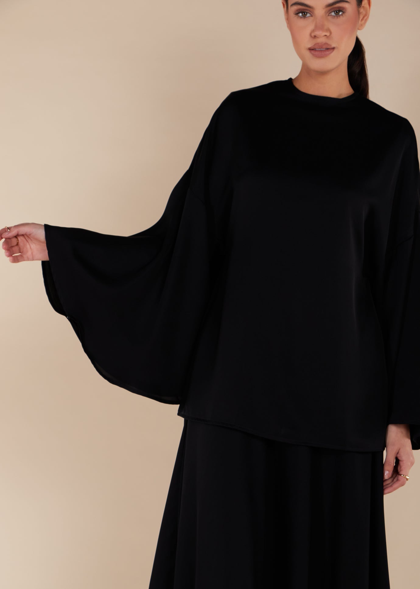 Introducing the Dolmen Top in Black - the ultimate co-ord of the season. Made from a luxurious black shade fabric, this top has a subtle sheen that adds a touch of sophistication to your wardrobe.