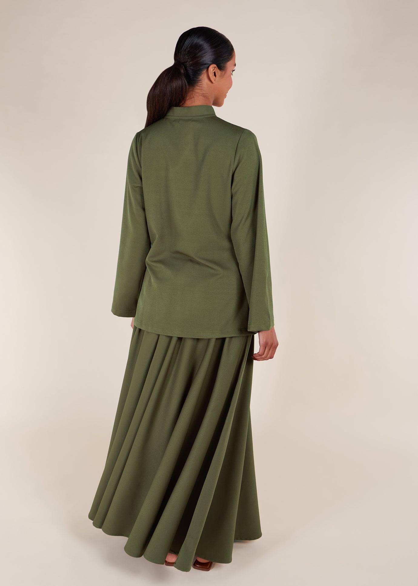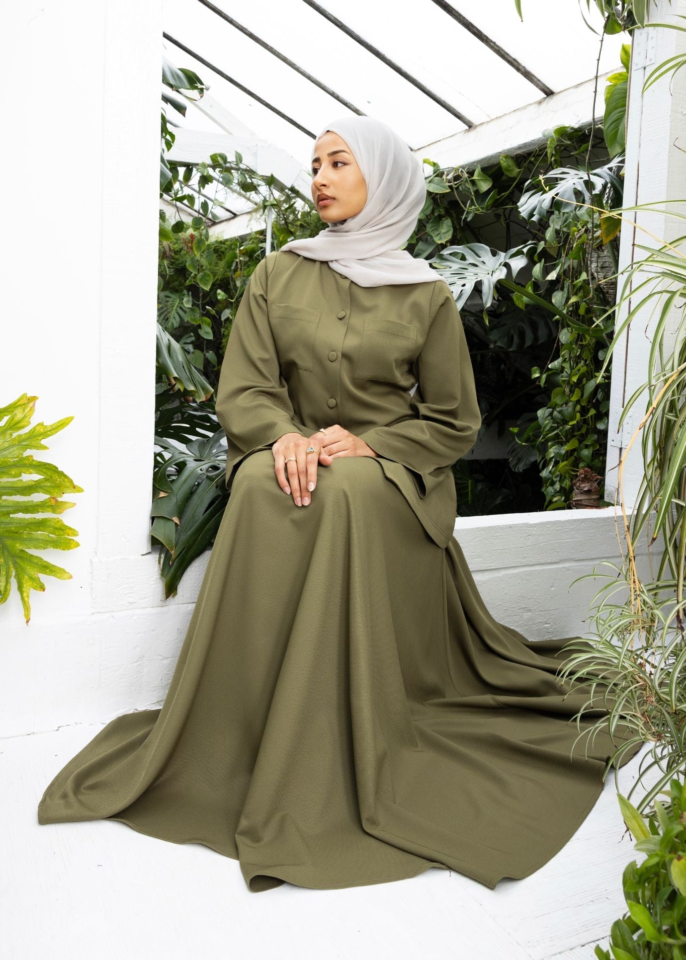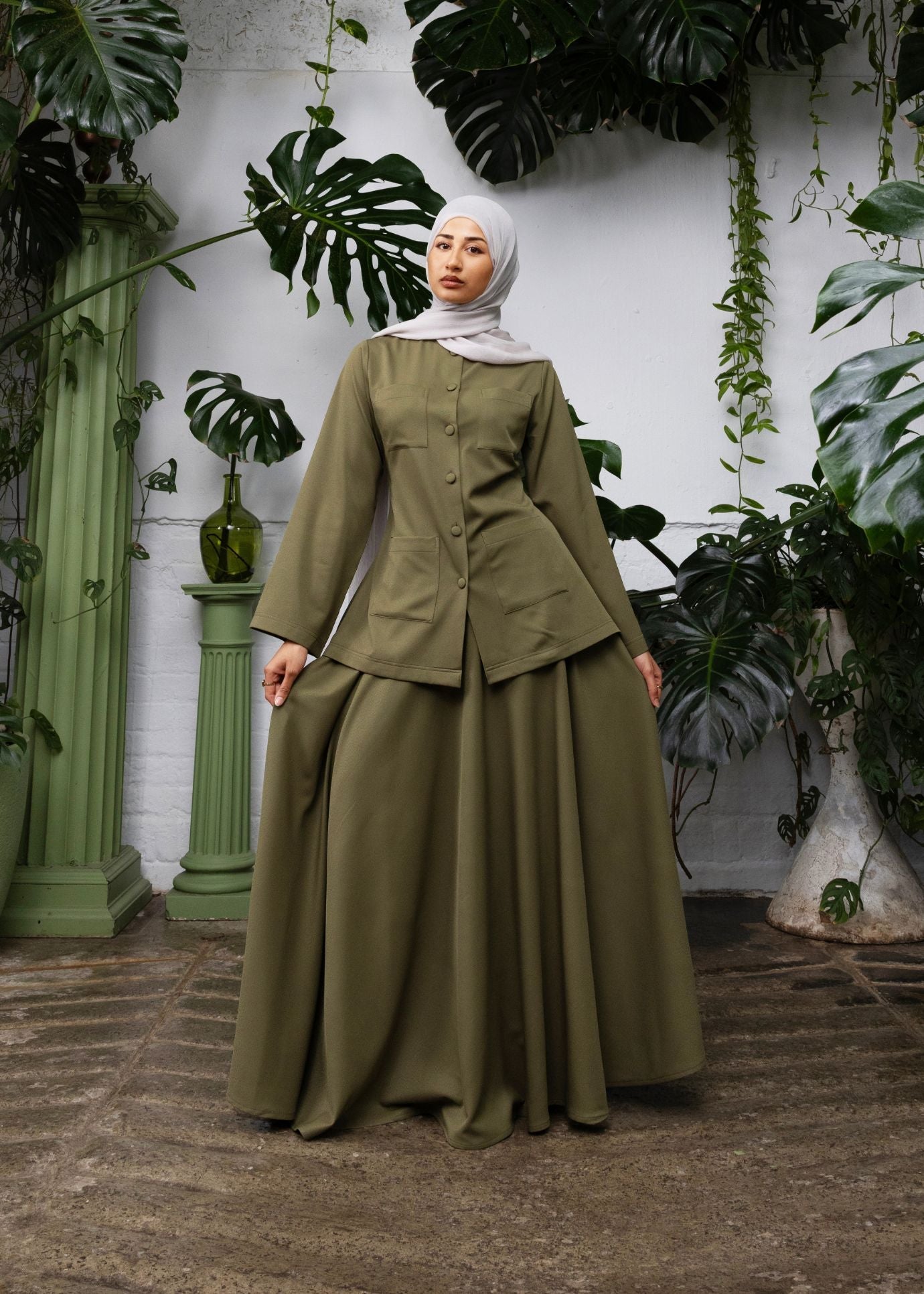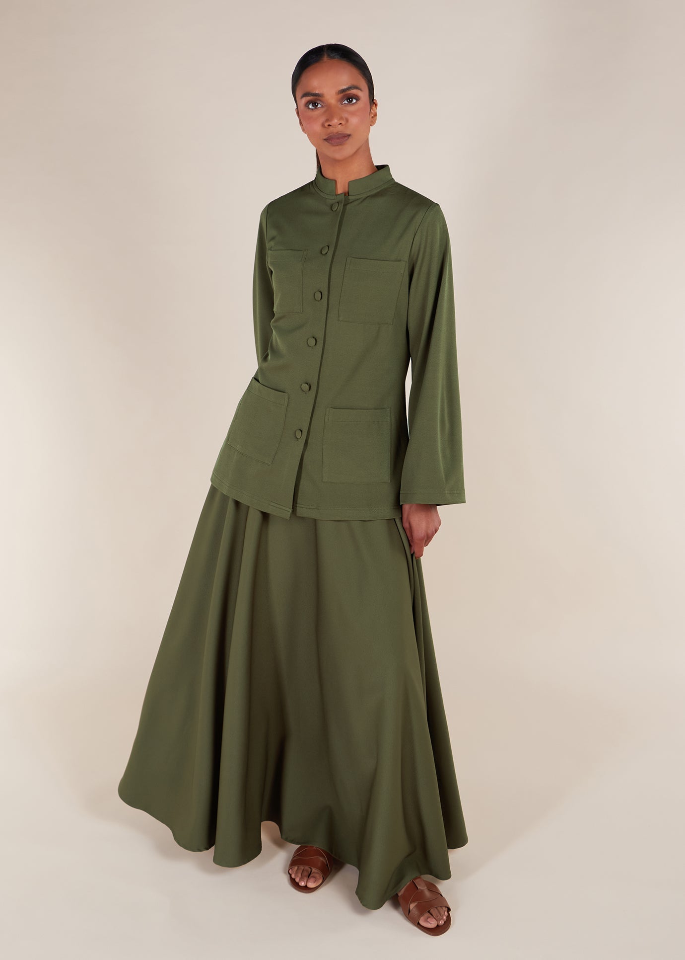 Elevate your everyday wardrobe with our Embossed Cargo Jacket – a refined take on utilitarian style. Made in a structured yet breathable fabric, this jacket features a clean, lightweight, minimalist silhouette with tonal button details and a flattering A-line cut. Its muted olive tone and timeless design make it perfect for layering across seasons while maintaining a modest and contemporary aesthetic.