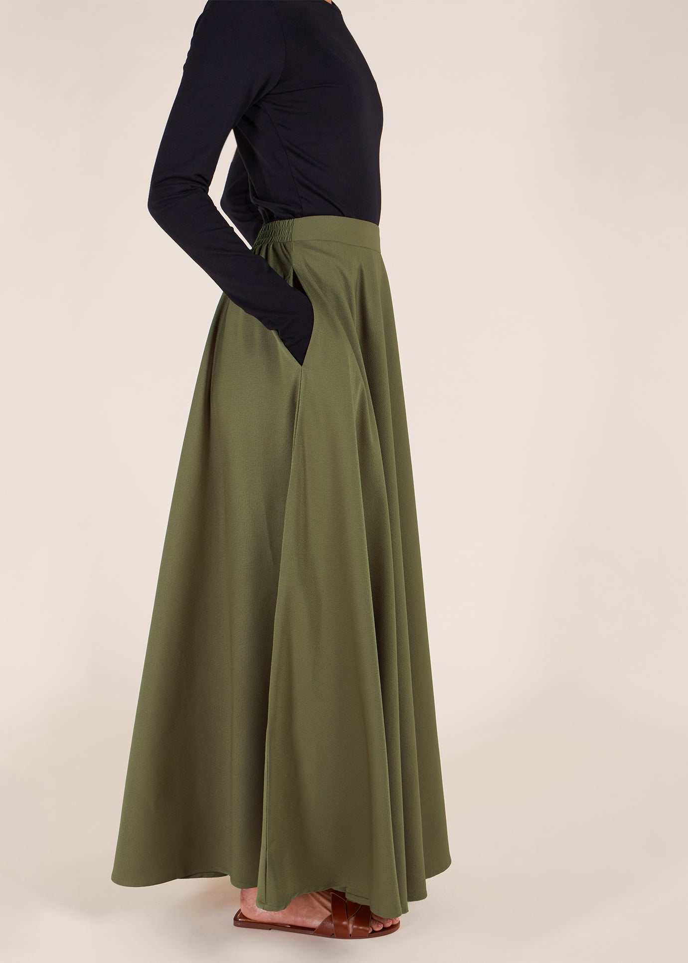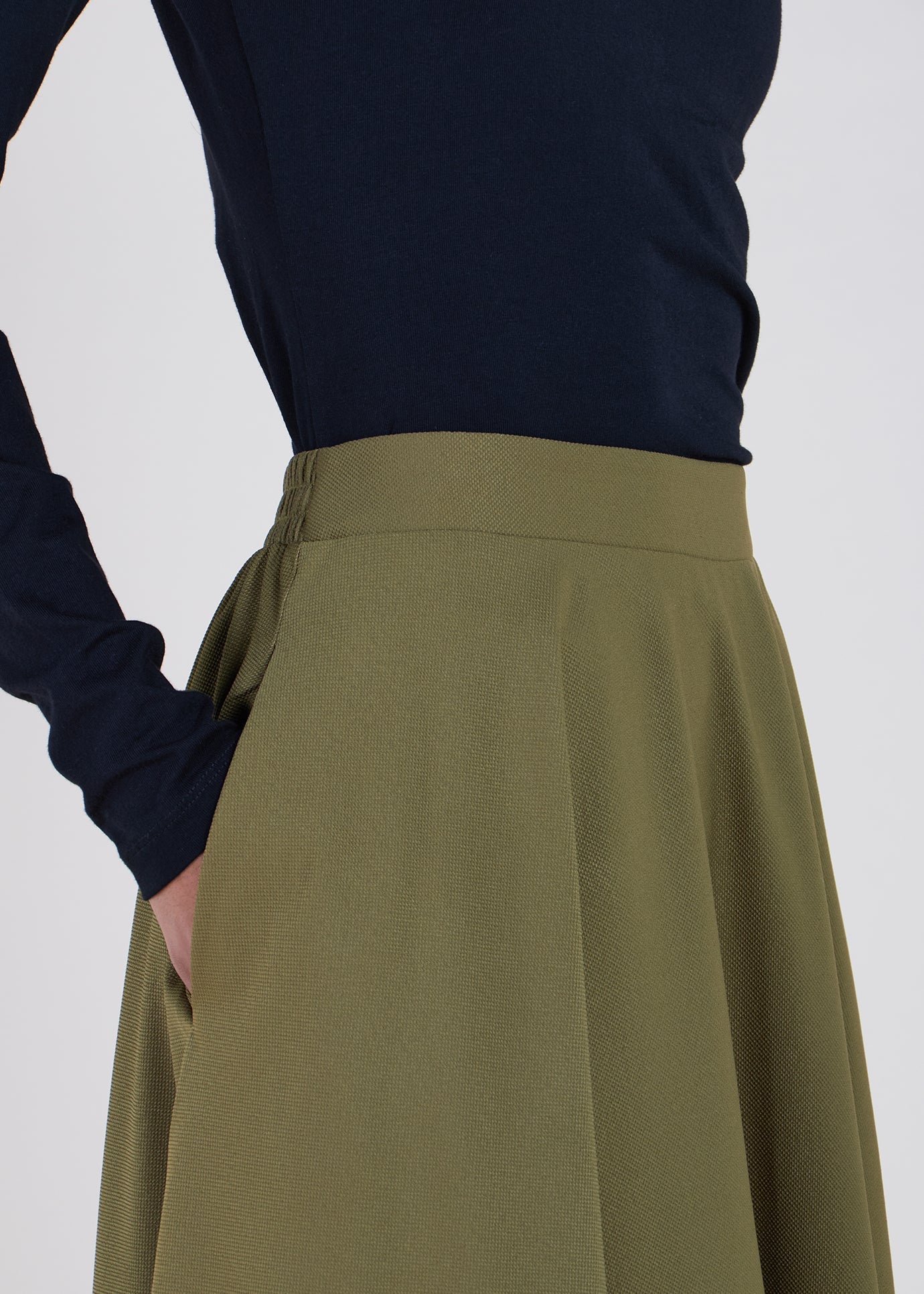 Refined yet effortless, our Flared Utility Skirt brings graceful movement to everyday wear. Cut from a breathable, lightweight structured fabric in a soft olive hue, it features discreet pockets and a clean, pull-on silhouette. Designed to pair seamlessly with the Embossed Cargo Jacket or worn as a standalone statement piece.