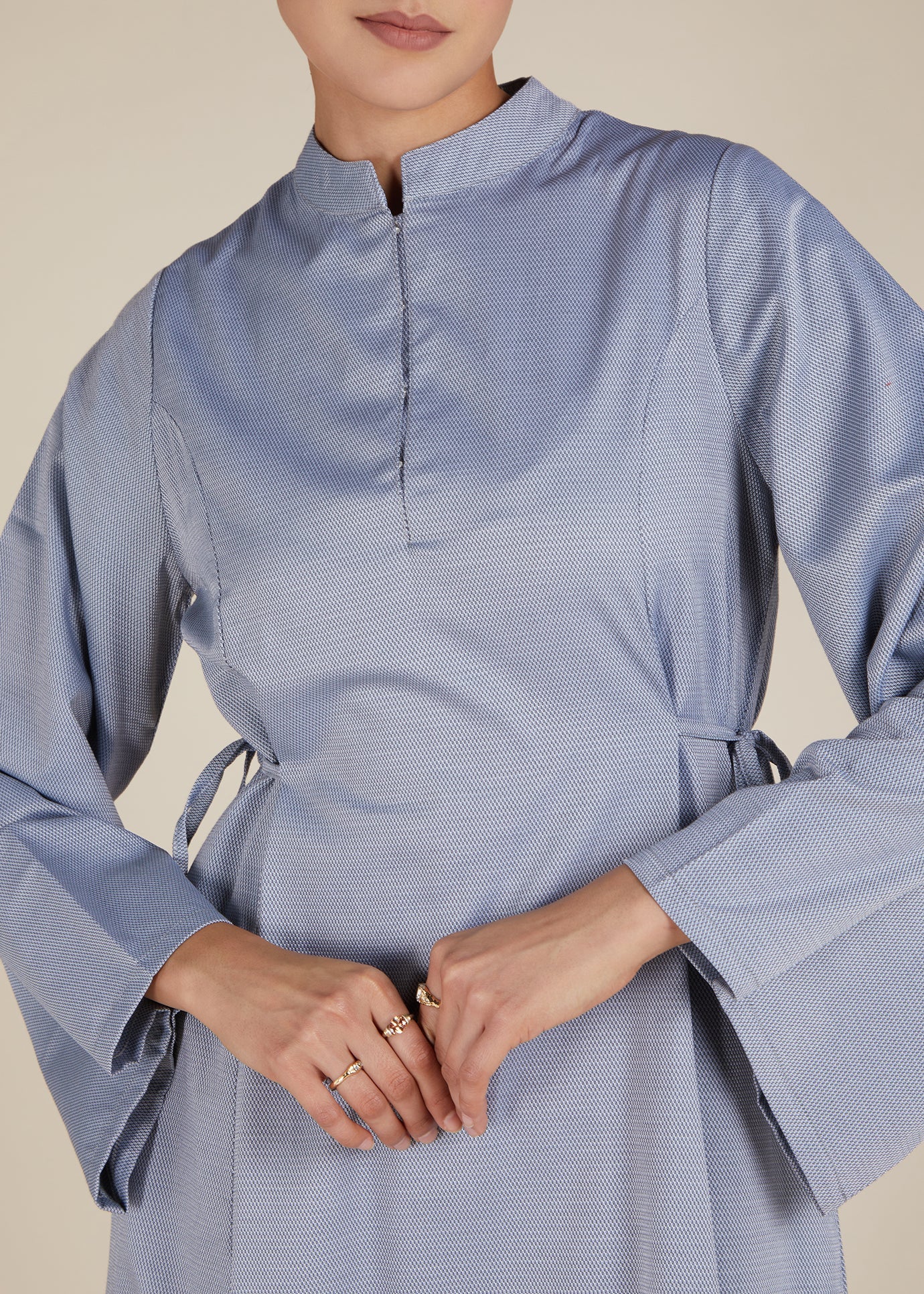 Clean lines and thoughtful tailoring define this Tie Waist Dress, made in a subtle micro-check fabric. With a structured mandarin collar, flared sleeves, and adjustable side ties, it offers both polish and ease. Side pockets add a practical finish to this refined wardrobe staple.