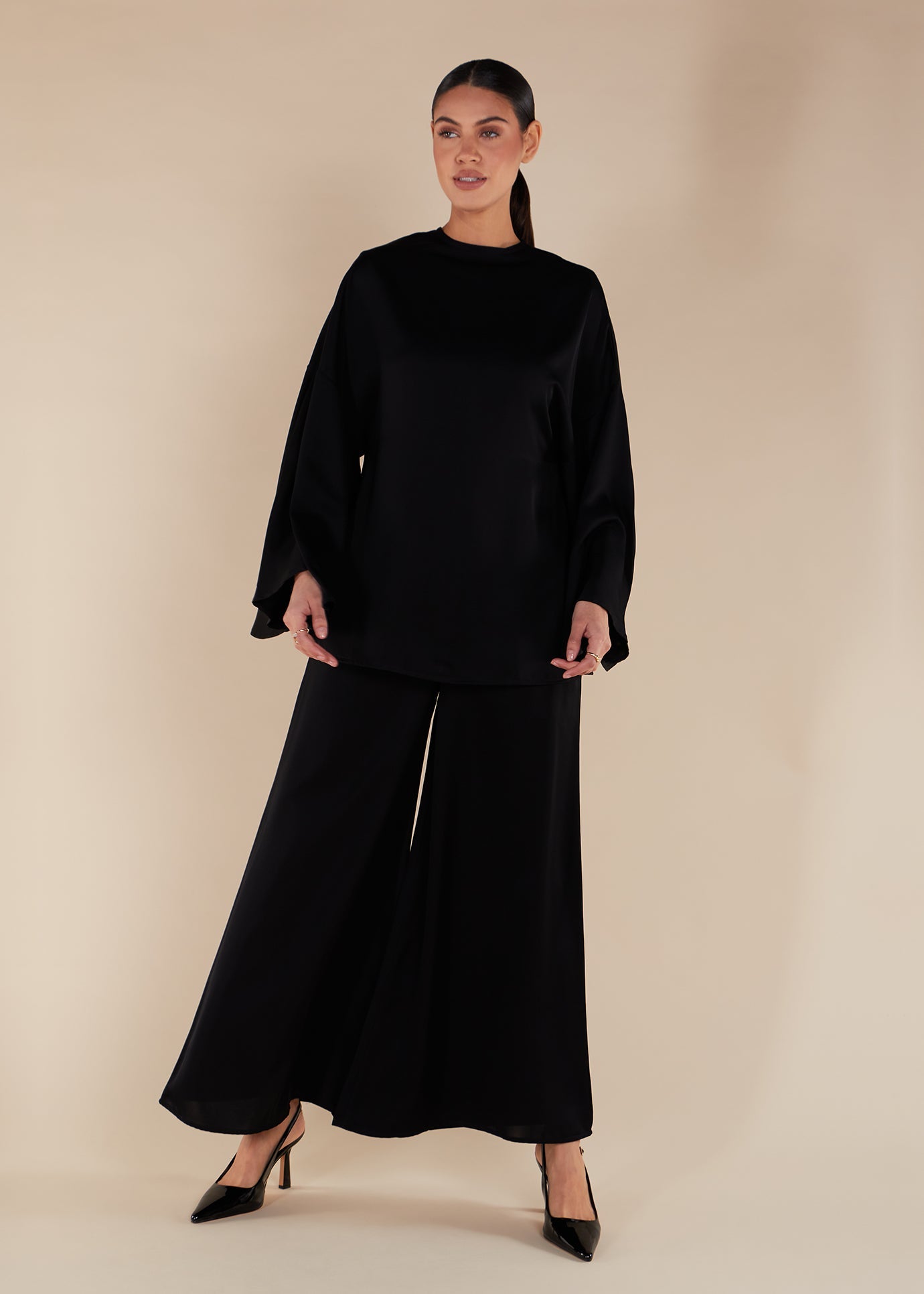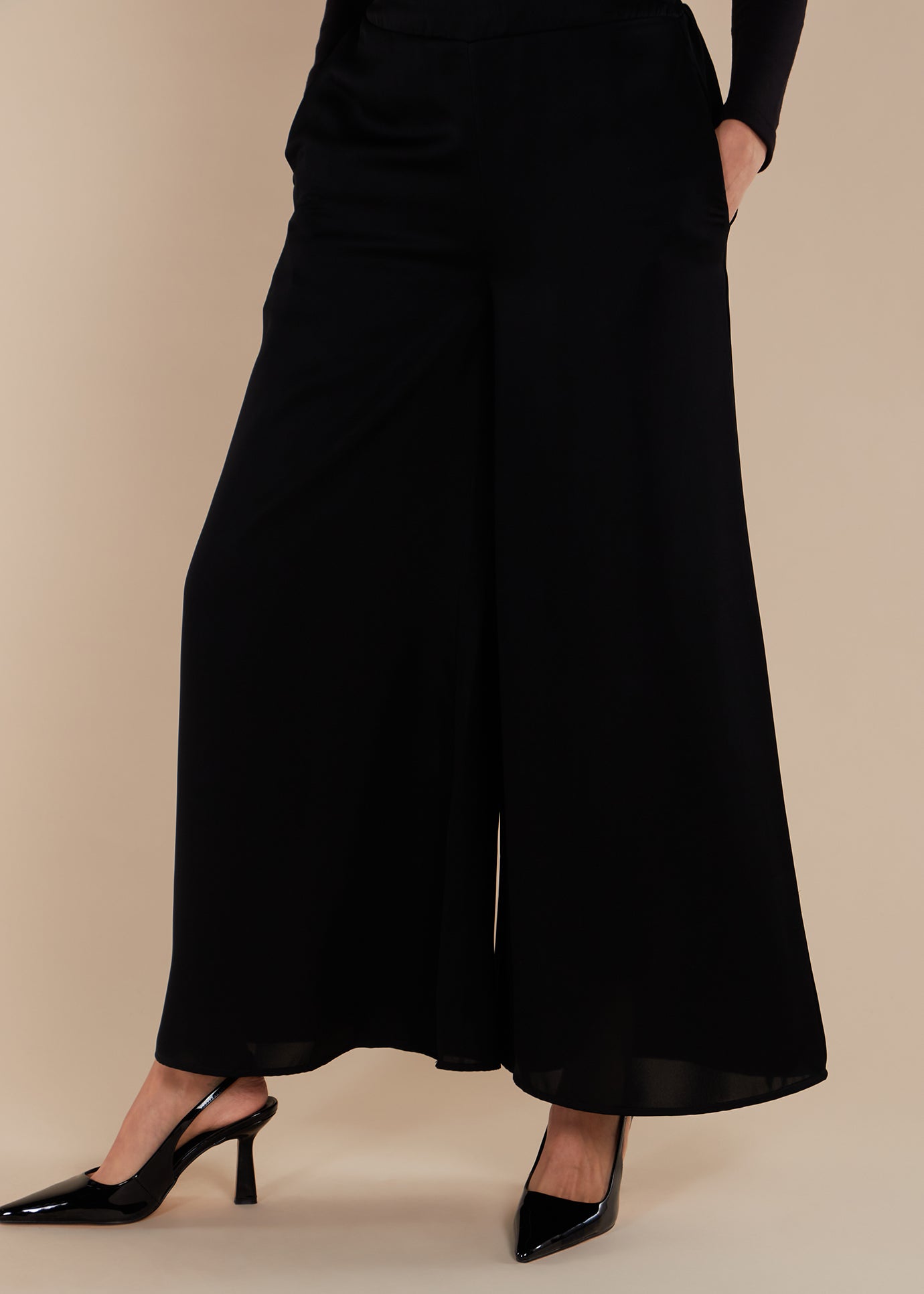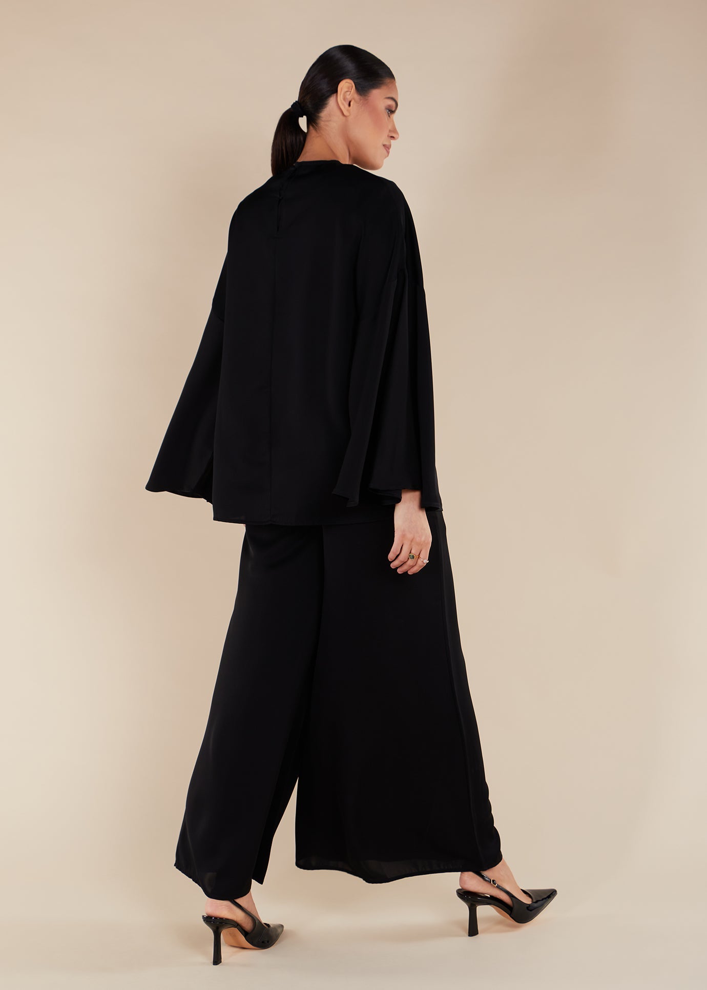 Experience ultimate comfort and style in these flared trousers with an elegant elasticated waist band at the back. Pair it perfectly with the matching dolmen top for a complete and sophisticated look.