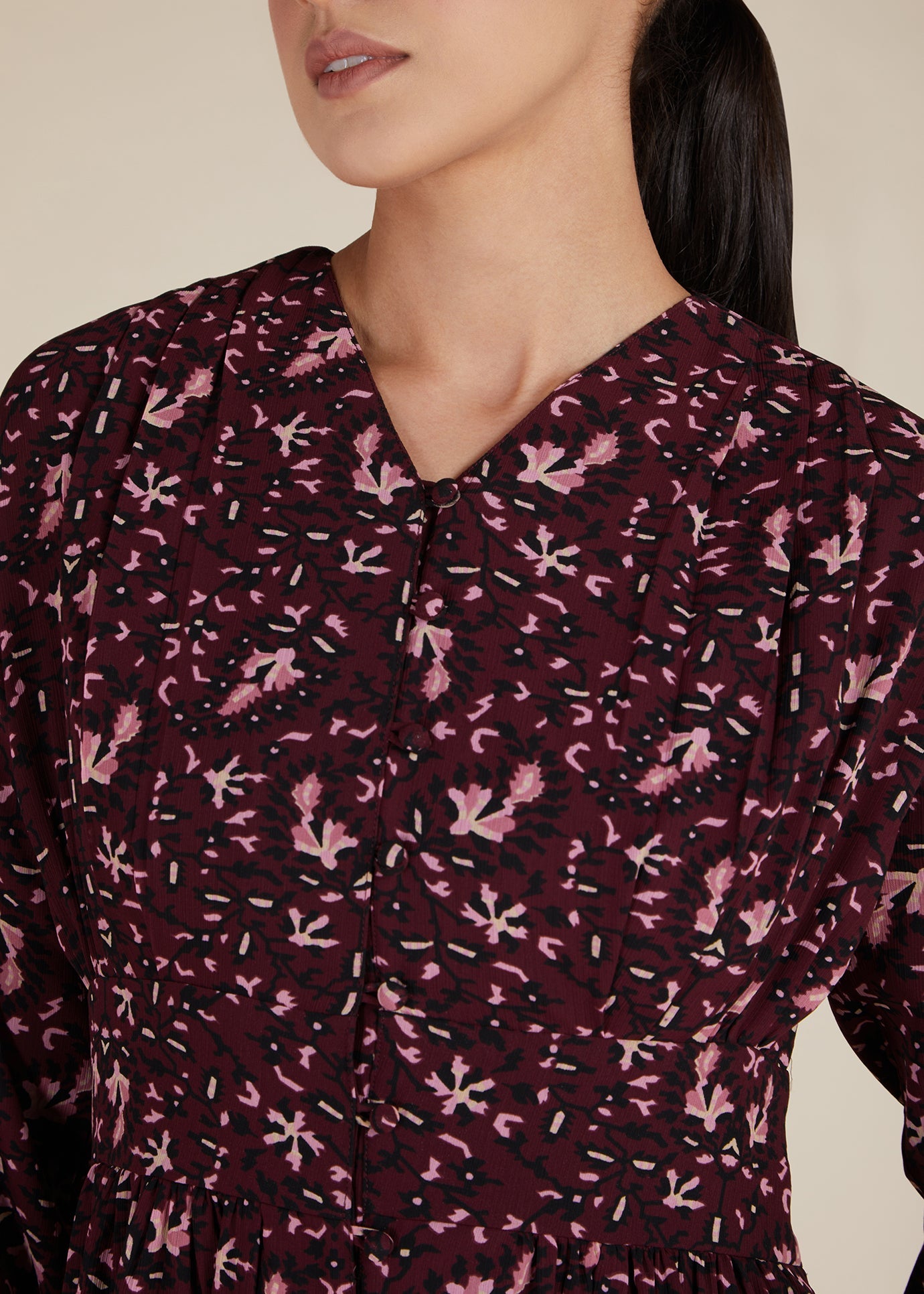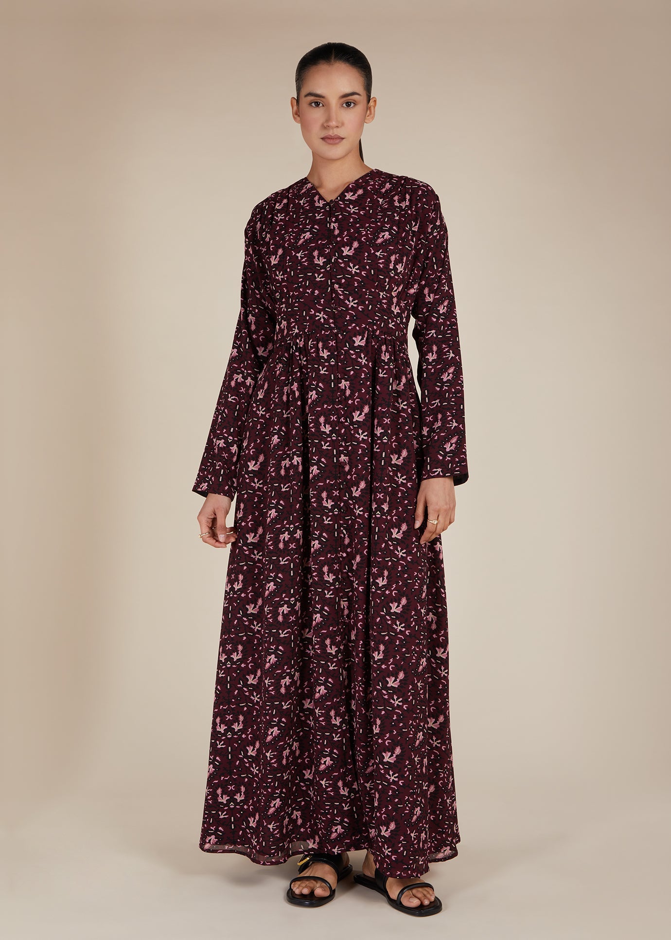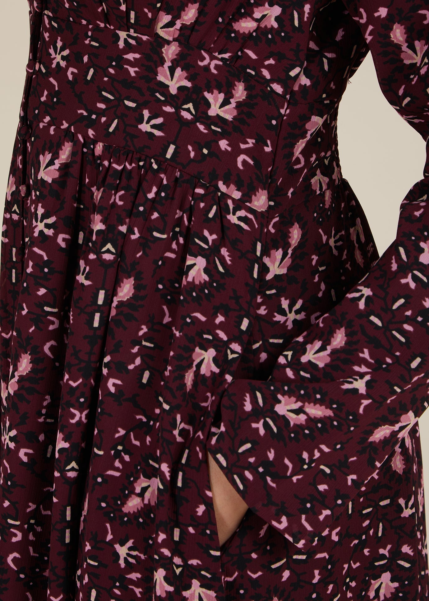 Featuring a delicate floral-inspired pattern, this Floaty Magnolia Maxi is made from fluid, drapey fabric. The structured silhouette creates an elegant, cinched waist effect, while the subtle v-neckline with front button closure adds refinement. Perfect for summer events, this sophisticated maxi includes practical hidden side pockets for convenience.