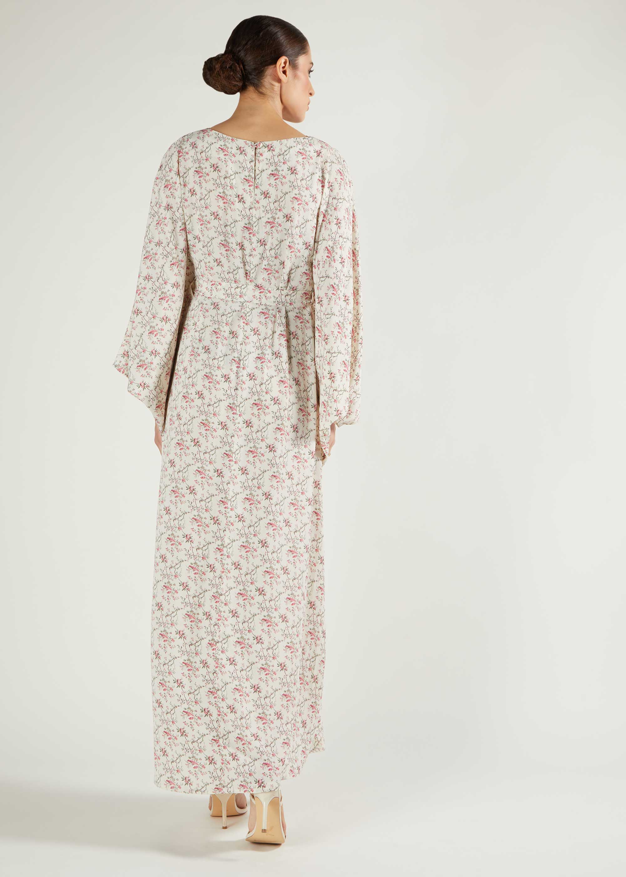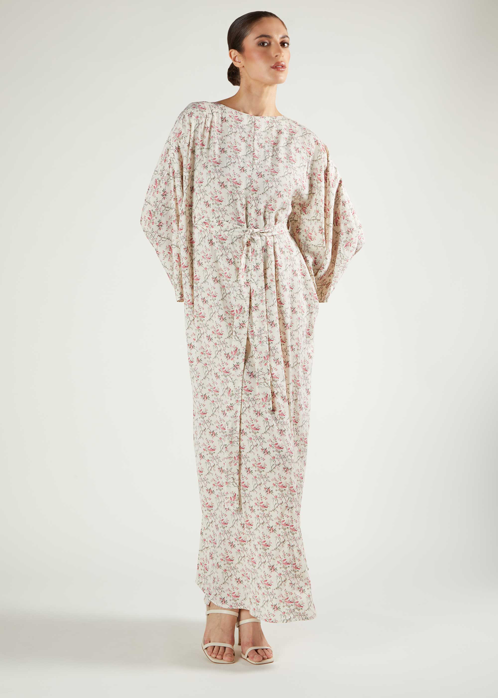 Dainty floral print cut in a kaftan style, loose fitting however we recommend choosing your regular size. Kaftan is floaty, lightweight and crease free for all day elegance. Featuring a belt.