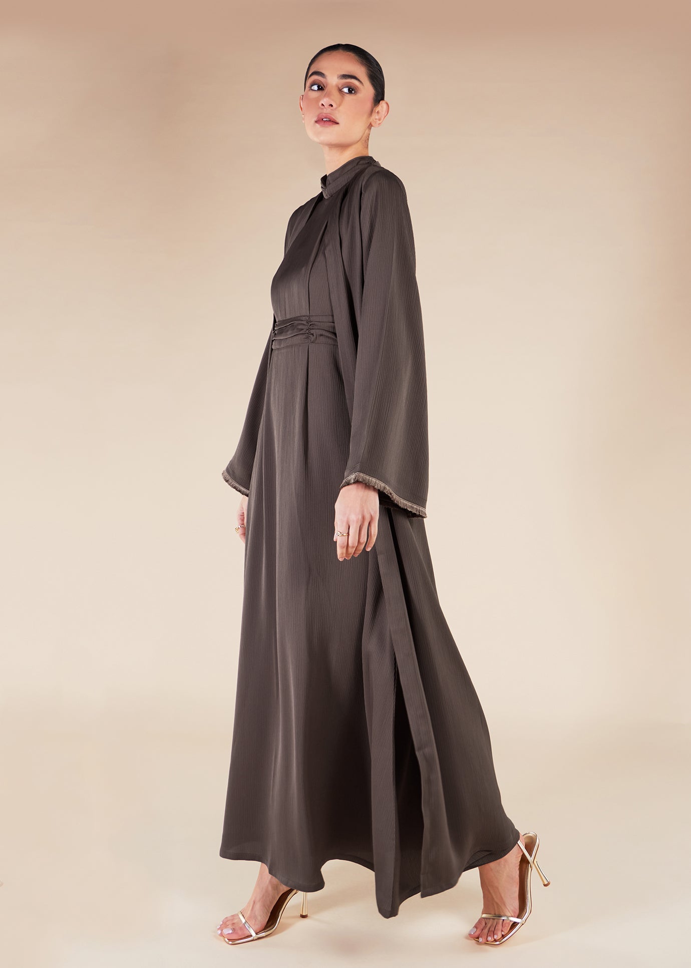 This garment offers a mid to loose fit, with fringed edges on the sleeves. It is a great pairing with the Rayie Abaya or a straight fit maxi. The fabric is non-crease and features subtle pleating.