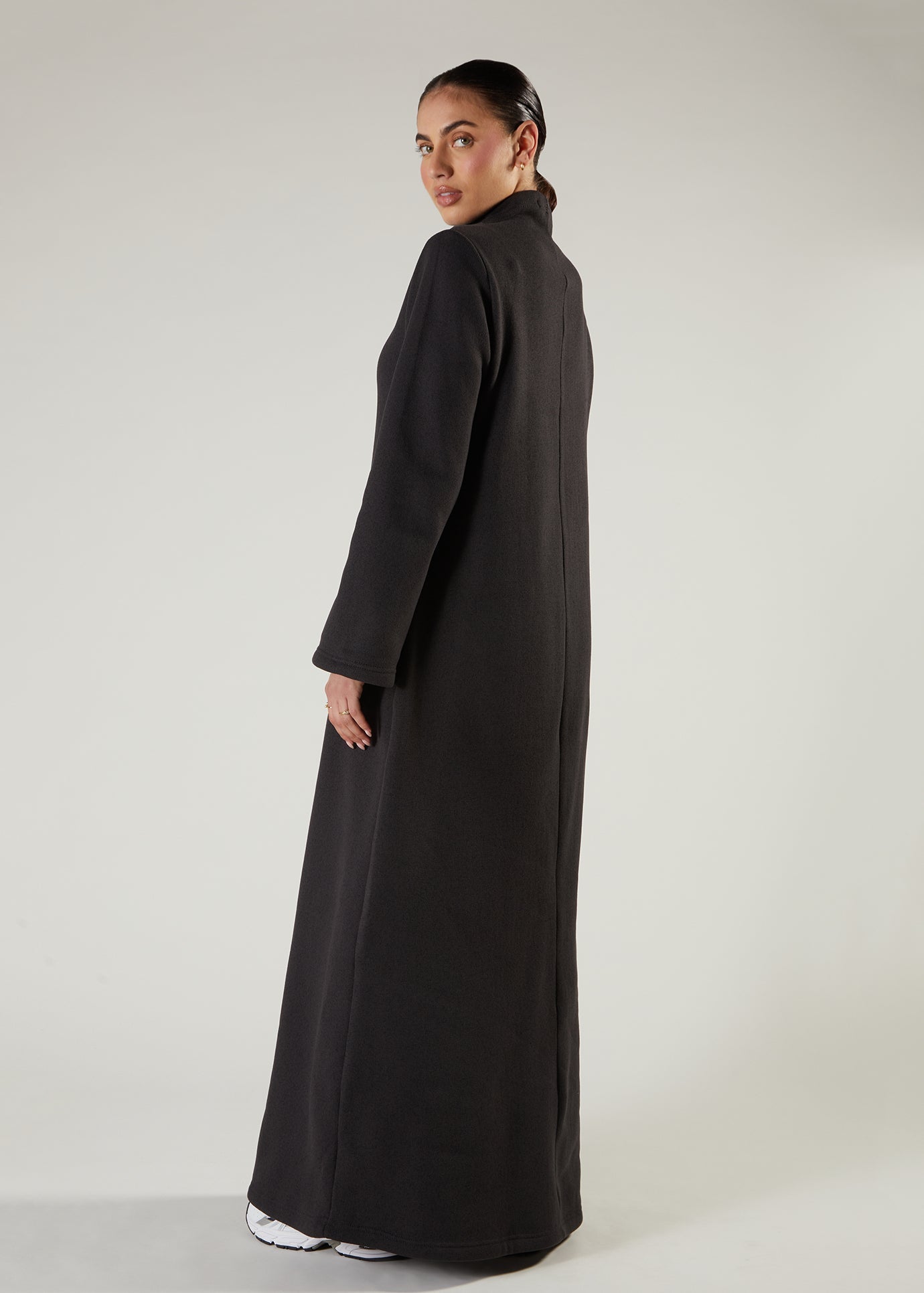 Abaya is made from a super soft almost fleece-like fabric with an A-line silhouette; it features a front seam and a low funnel neck style. Perfect for cooler days and evenings.