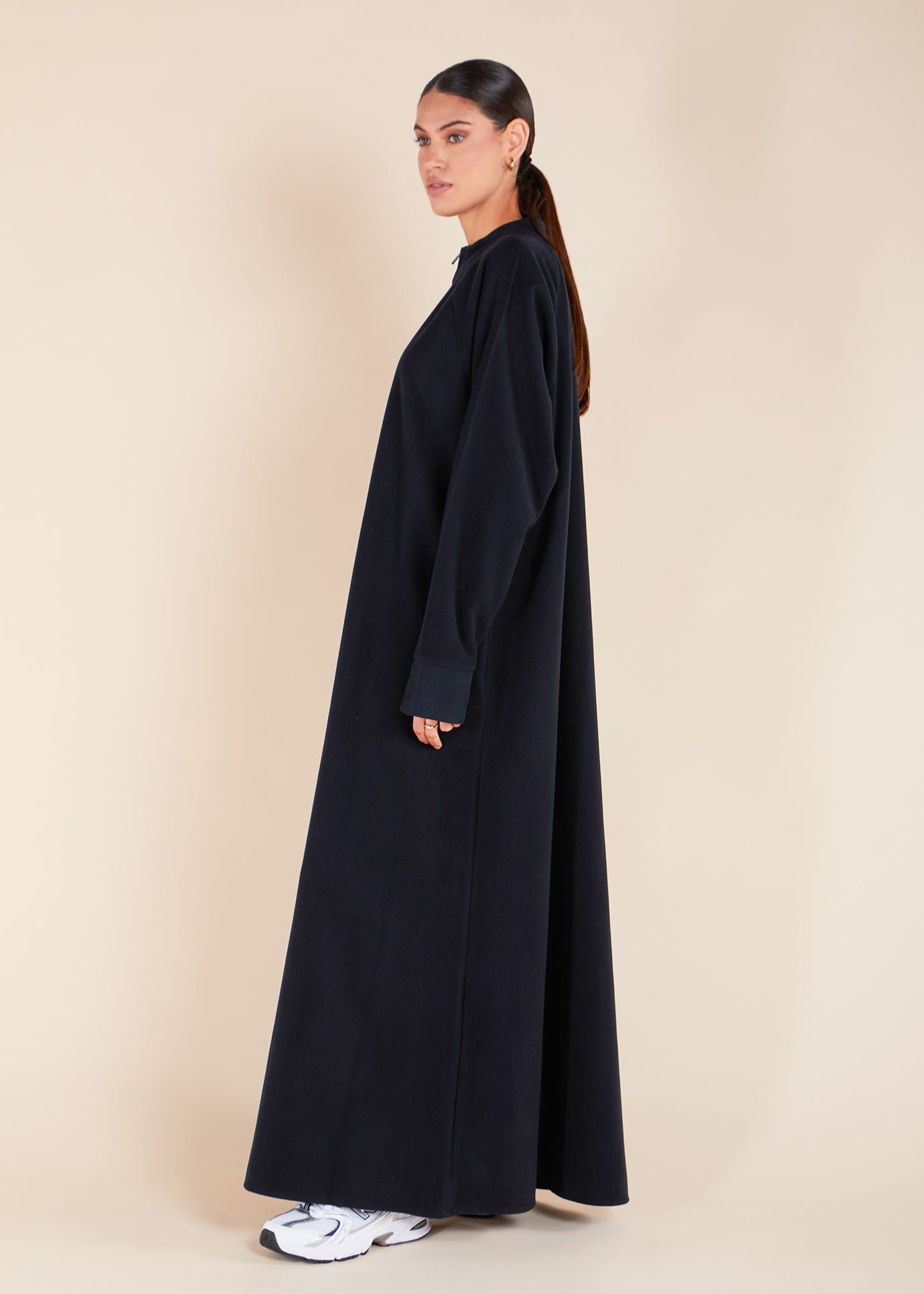 This Abaya features practical side pockets and is designed in a fluid raglan style with a zip detail at the neck, making it perfect for throwing on during cooler weather.