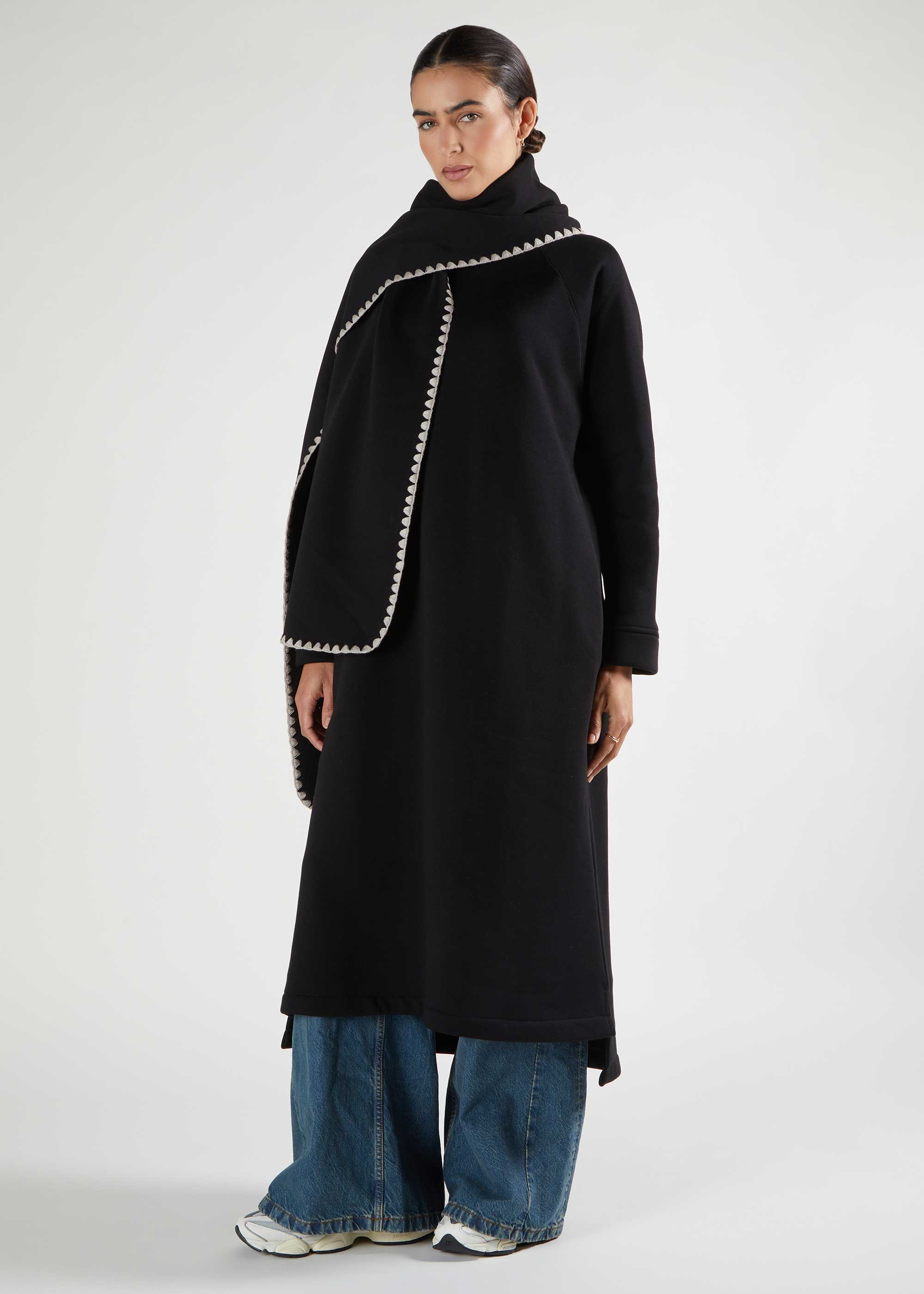 This straight-cut midi, made from soft fleece, features an extended back length and a high-rise funnel neck with drawstring detail, ideal for cooler temperatures. Its sleek, linear silhouette offers a flattering fit. Style it with long boots or combine with jeans or leggings for versatile looks.