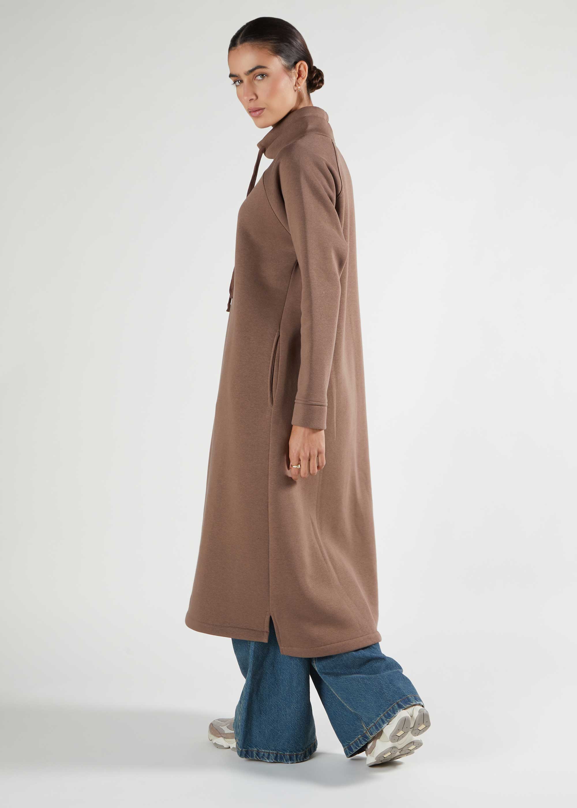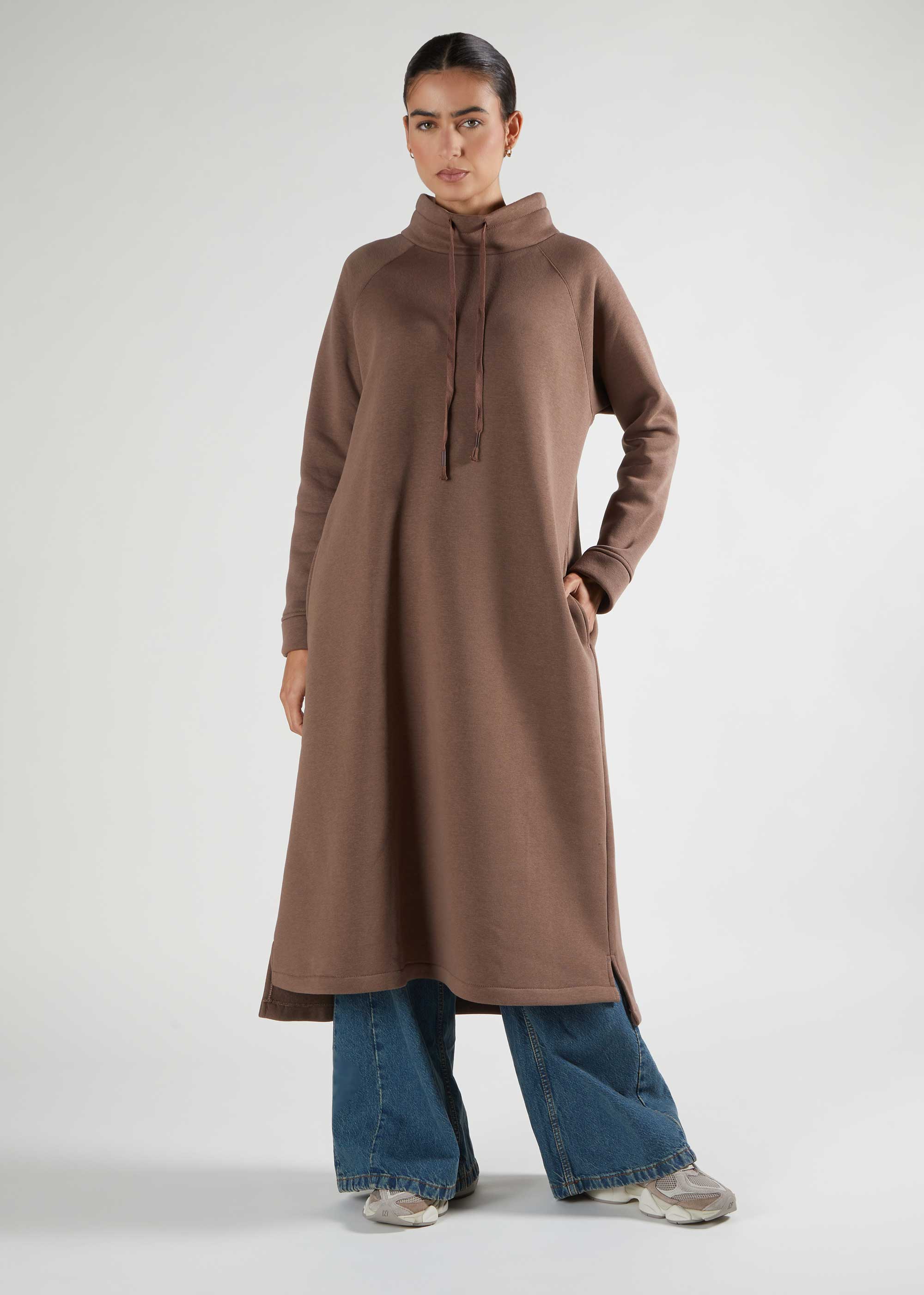 This straight-cut midi, made from soft fleece, features an extended back length and a high-rise funnel neck with drawstring detail, ideal for cooler temperatures. Its sleek, linear silhouette offers a flattering fit. Style it with long boots or combine with jeans or leggings for versatile looks.