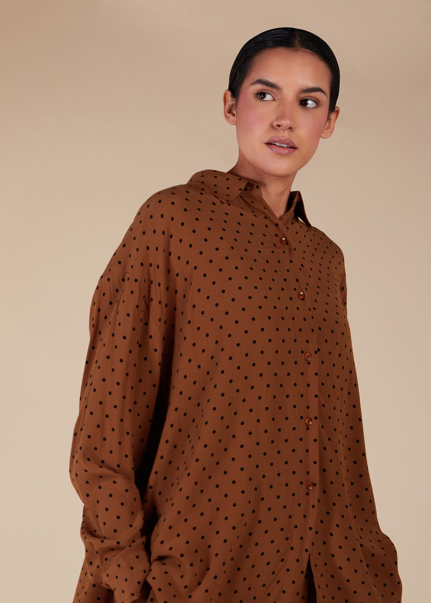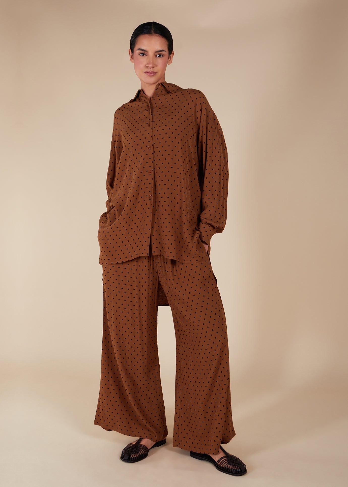This Gobi Co-Ord Set features a safari-style polka dot print in a warm bronze tone. It has a relaxed silhouette that fits true to size, with a fluid cut and feel that makes it the ideal outfit for both day and evening wear. It can also serve as a smarter pyjama set. The back of the top is designed for maximum modesty with its longer length, while the trousers have a mid-flare silhouette.